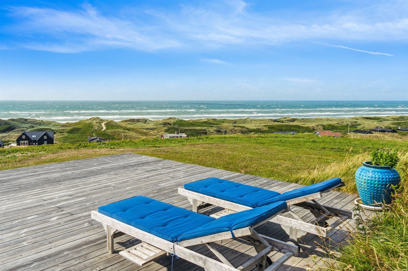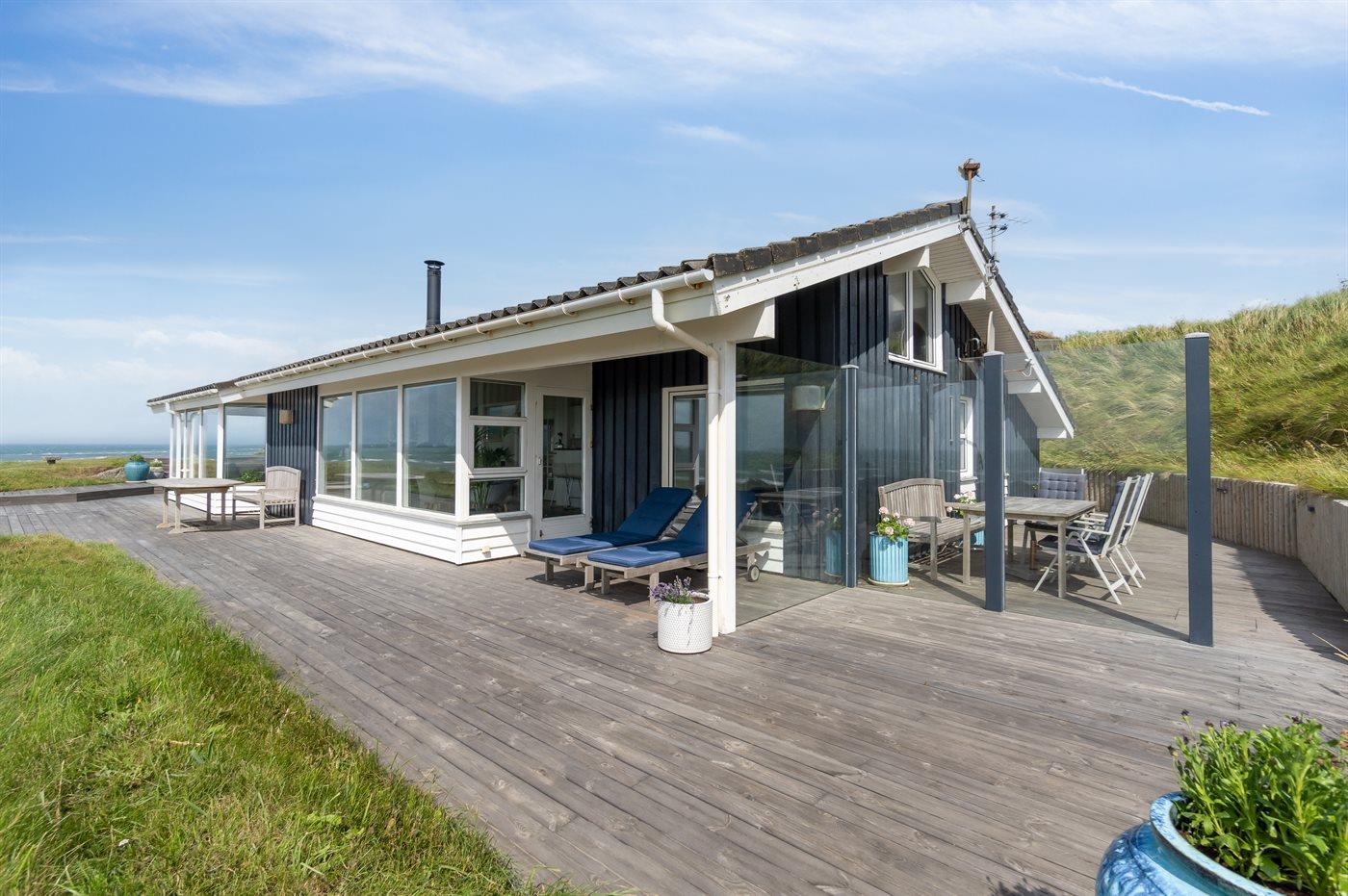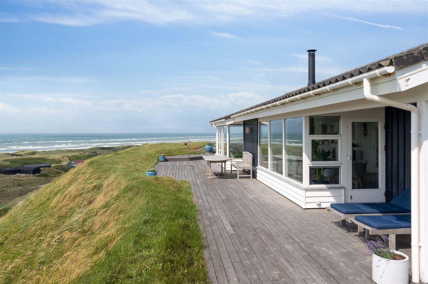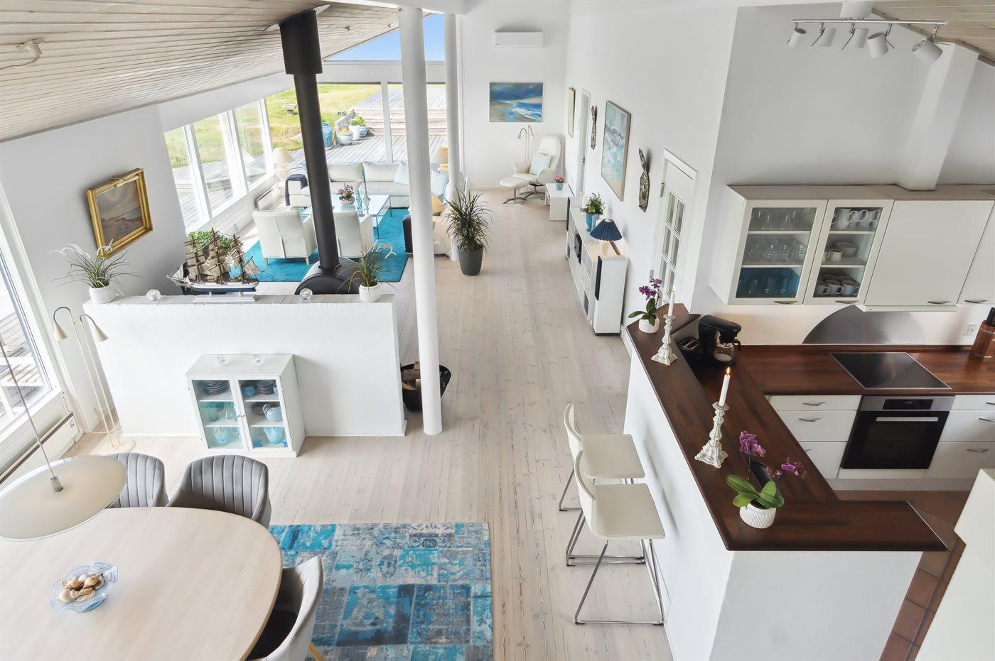 Flot og indbydende sommerhus med én af Danmarks bedste beliggenheder på toppen af Kettrup Bjerge og med 180° havudsigt fra såvel hus som grund. Huset ligger helt ugenert for enden af en blind vej på en skøn natur-/klitgrund. Huset er omgivet at et stort og dejligt terrasseareal af træ mod syd, vest, nord og øst - her kan I nyde solen og den fantastiske udsigt. Spiseafdeling med udgang til terrassen. Den smagfuldt møblerede opholdsstue på 70 kvm. er med store vinduespartier og har fantastisk 180° havudsigt.