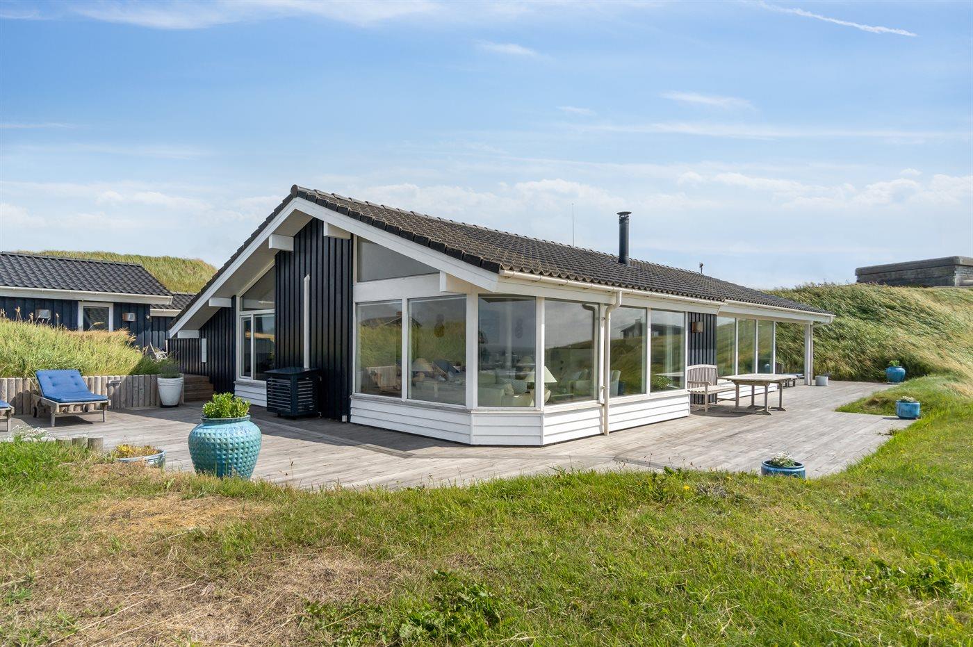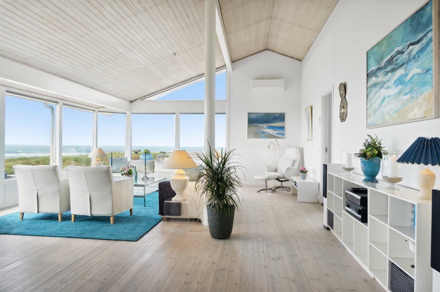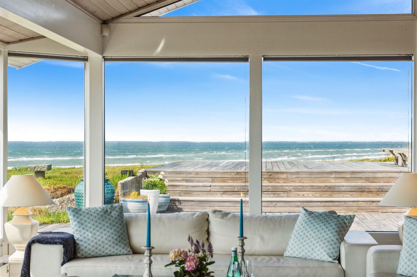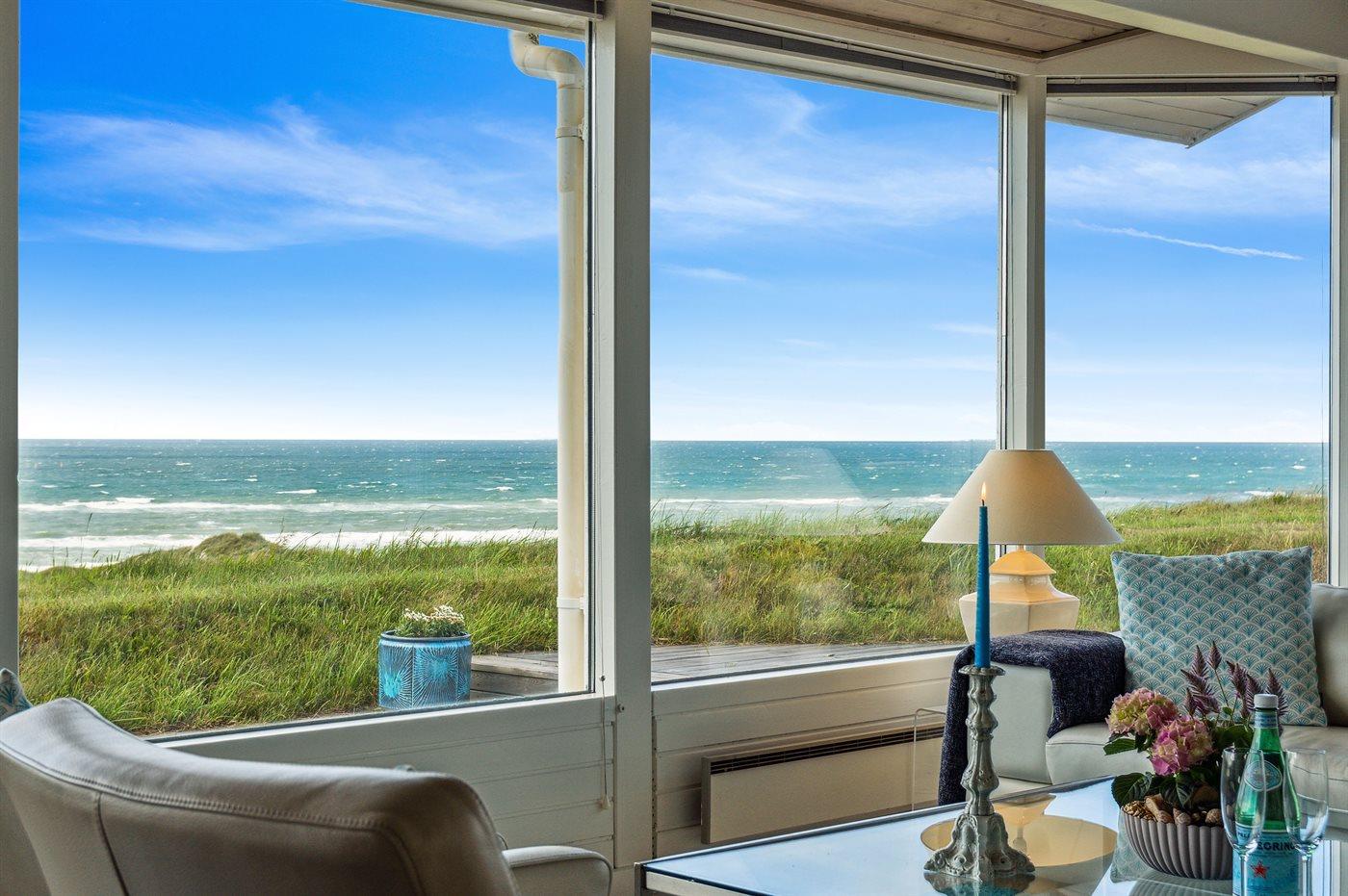 Flot og indbydende sommerhus med én af Danmarks bedste beliggenheder på toppen af Kettrup Bjerge og med 180° havudsigt fra såvel hus som grund. Huset ligger helt ugenert for enden af en blind vej på en skøn natur-/klitgrund. Huset er omgivet at et stort og dejligt terrasseareal af træ mod syd, vest, nord og øst - her kan I nyde solen og den fantastiske udsigt. Spiseafdeling med udgang til terrassen. Den smagfuldt møblerede opholdsstue på 70 kvm. er med store vinduespartier og har fantastisk 180° havudsigt.