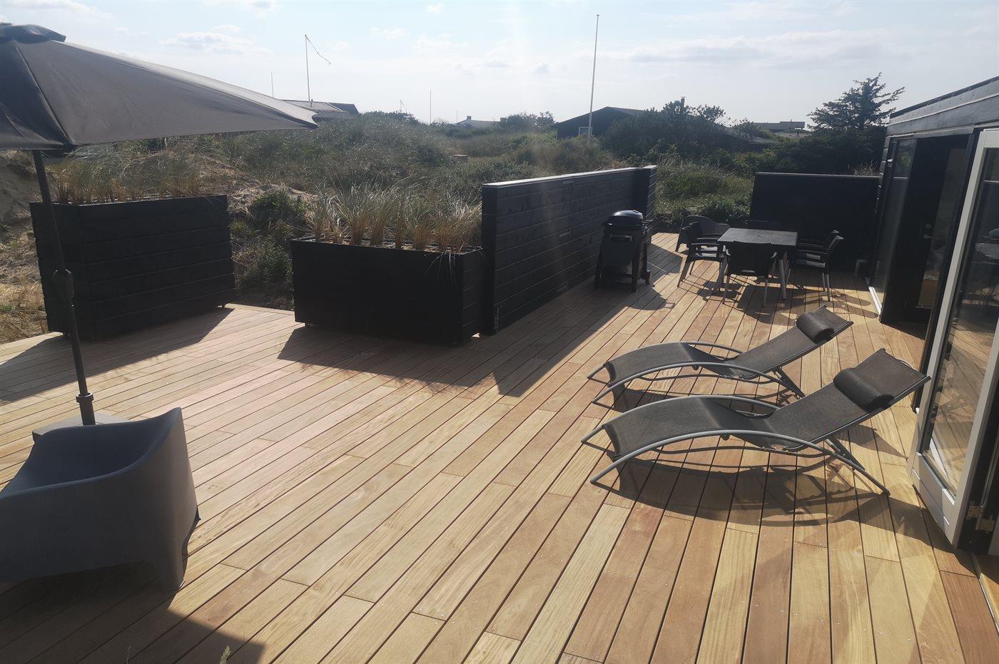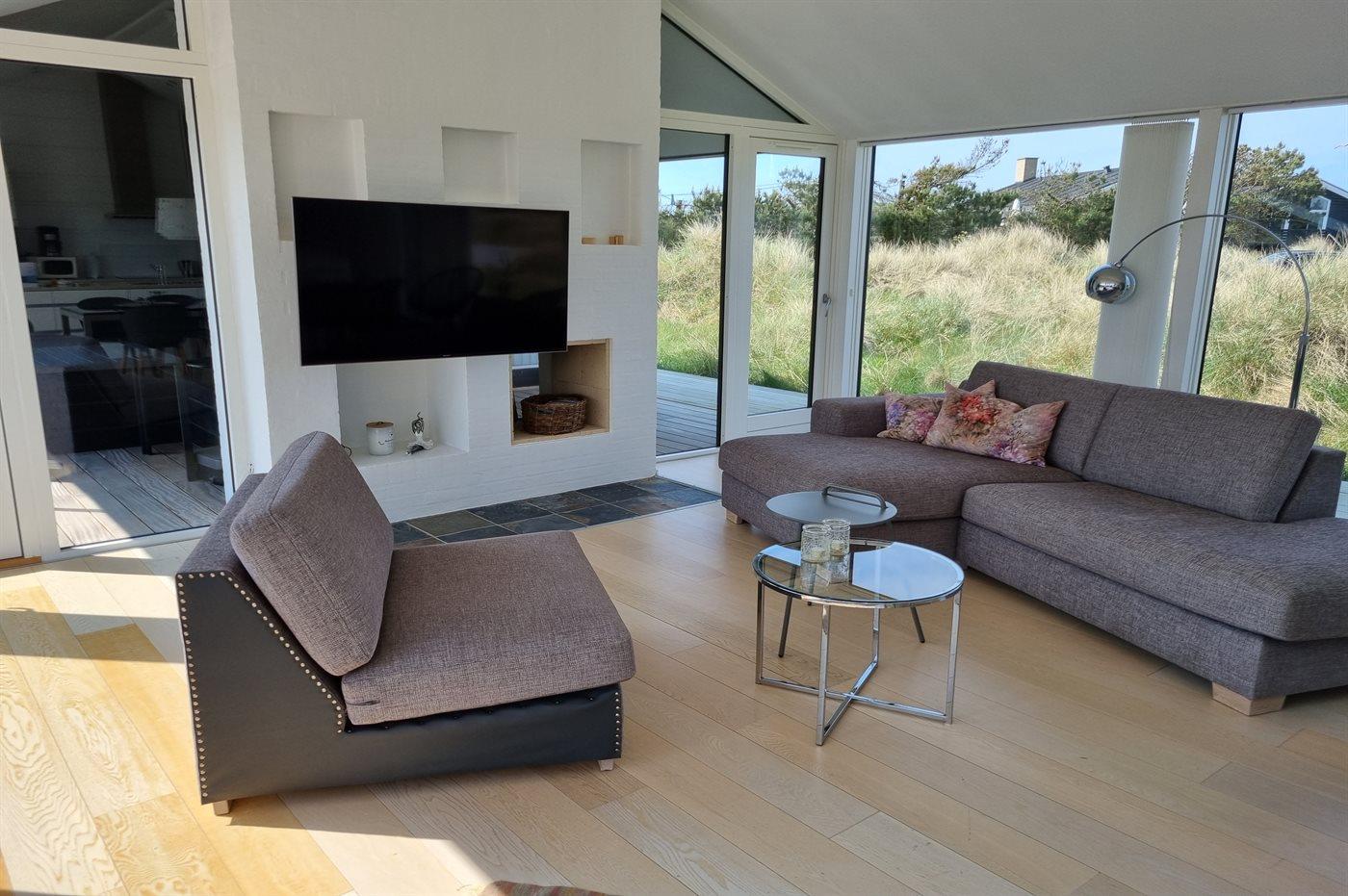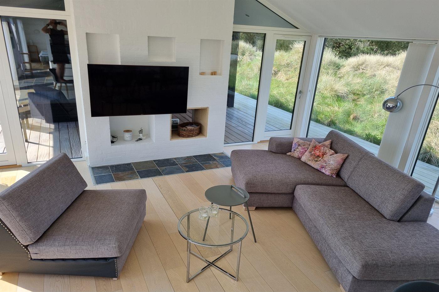 På en stor, kuperet klitgrund ligger dette flotte sommerhus med en fantastisk udsigt over grunden. De mange vinduer fra gulv til loft gør, at man føler sig i et med den smukke natur, der omgiver huset. I forlængelse af huset, via en overdækket terrasse, er der adgang til et anneks, hvor 2 af sovepladserne befinder sig.