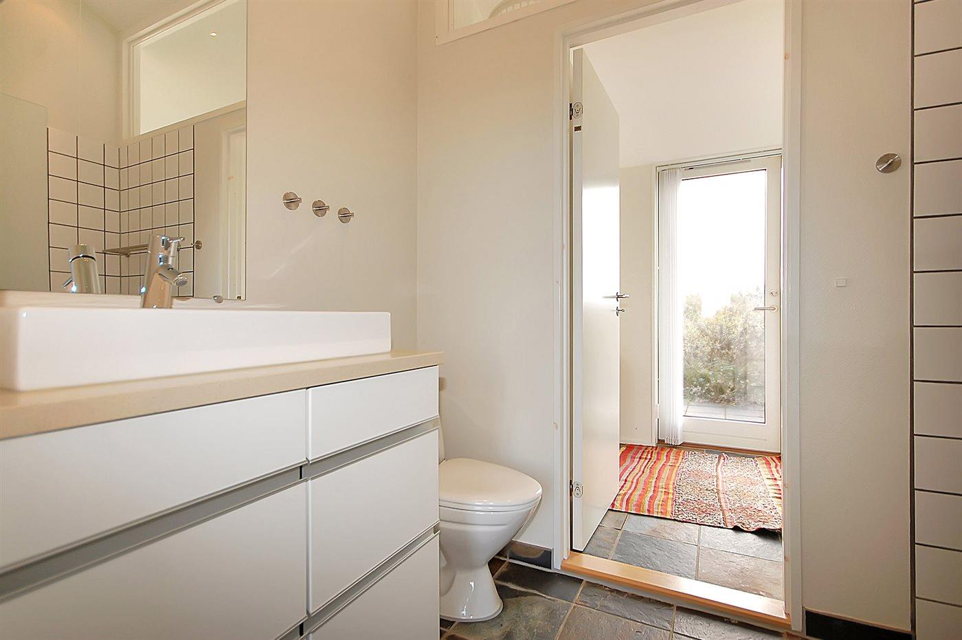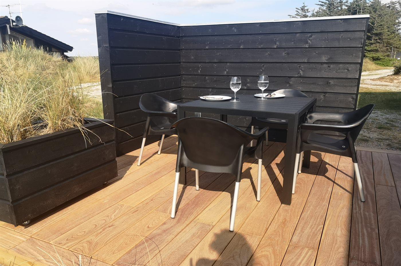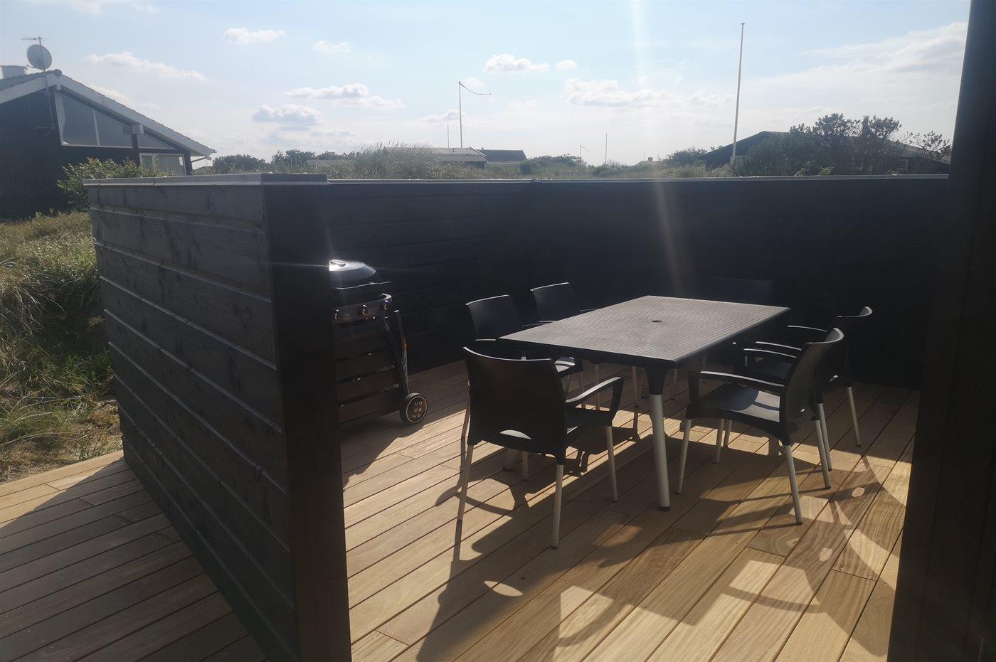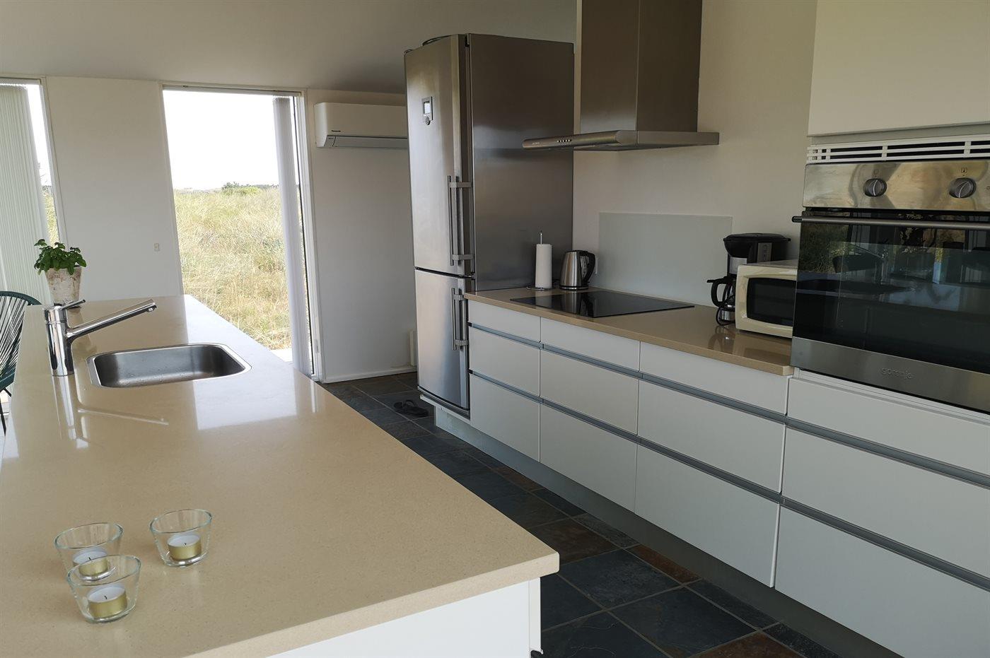 På en stor, kuperet klitgrund ligger dette flotte sommerhus med en fantastisk udsigt over grunden. De mange vinduer fra gulv til loft gør, at man føler sig i et med den smukke natur, der omgiver huset. I forlængelse af huset, via en overdækket terrasse, er der adgang til et anneks, hvor 2 af sovepladserne befinder sig.