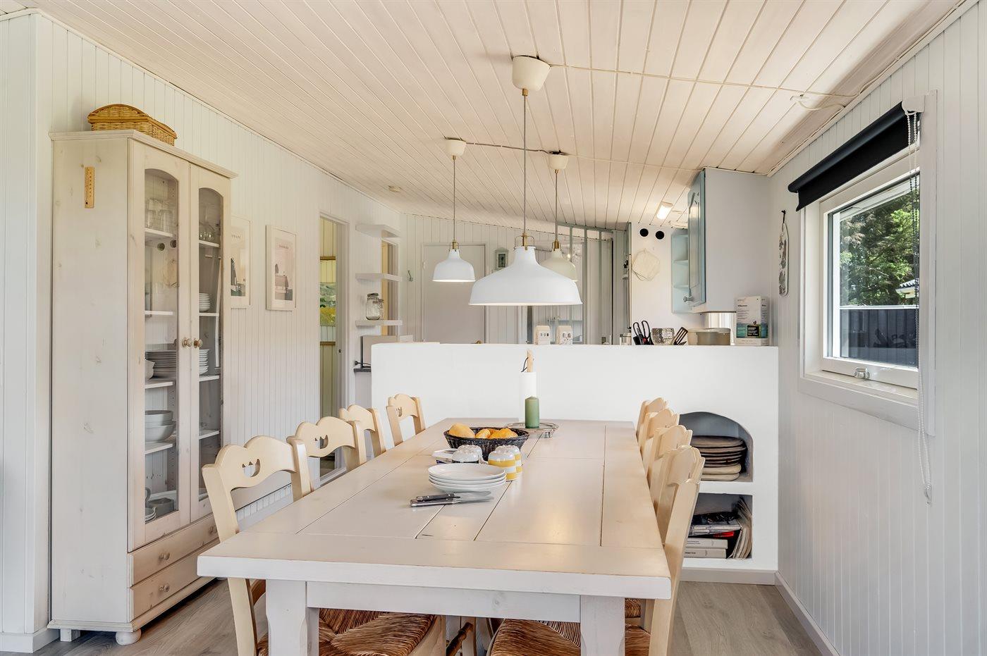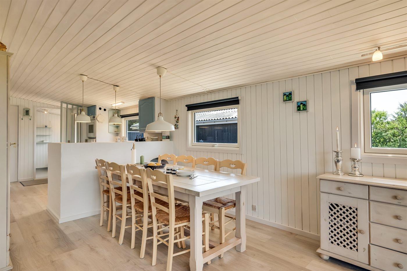 Køkkenet er udstyret med 1 køleskab. Der er 4 elkogeplader, bageovn, mikrobølgeovn samt opvaskemaskine.