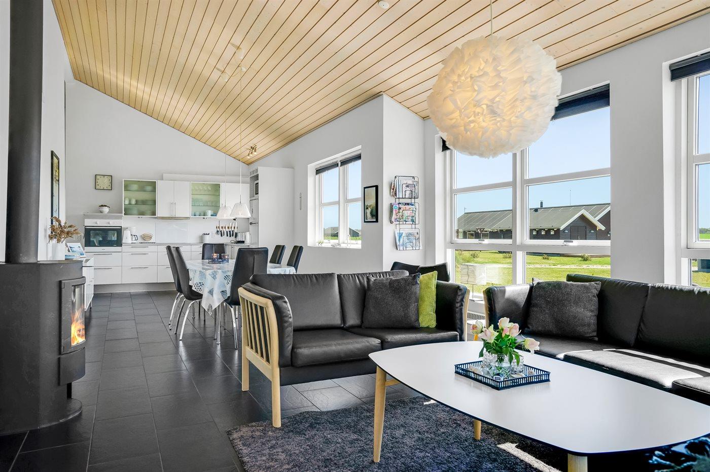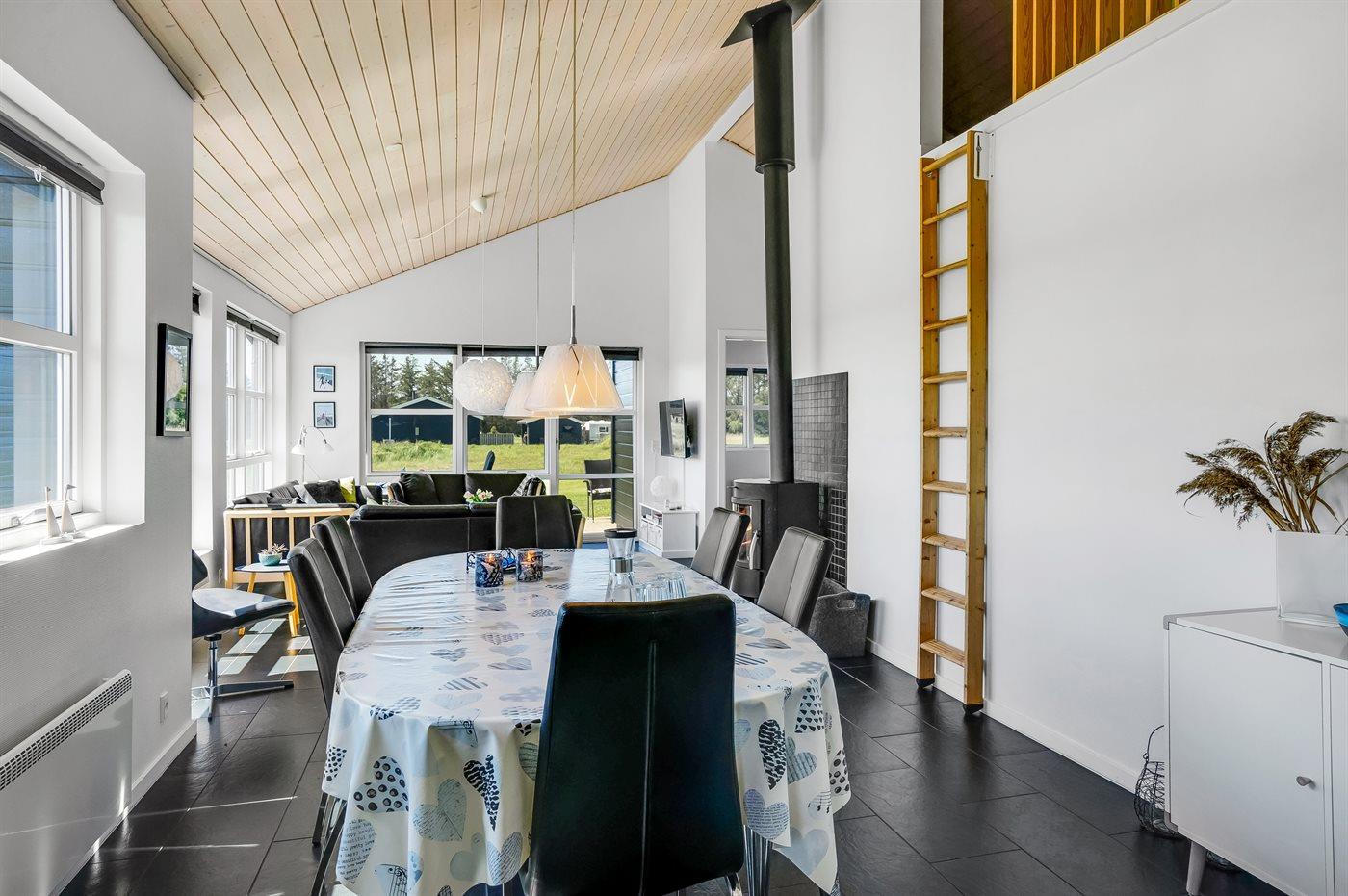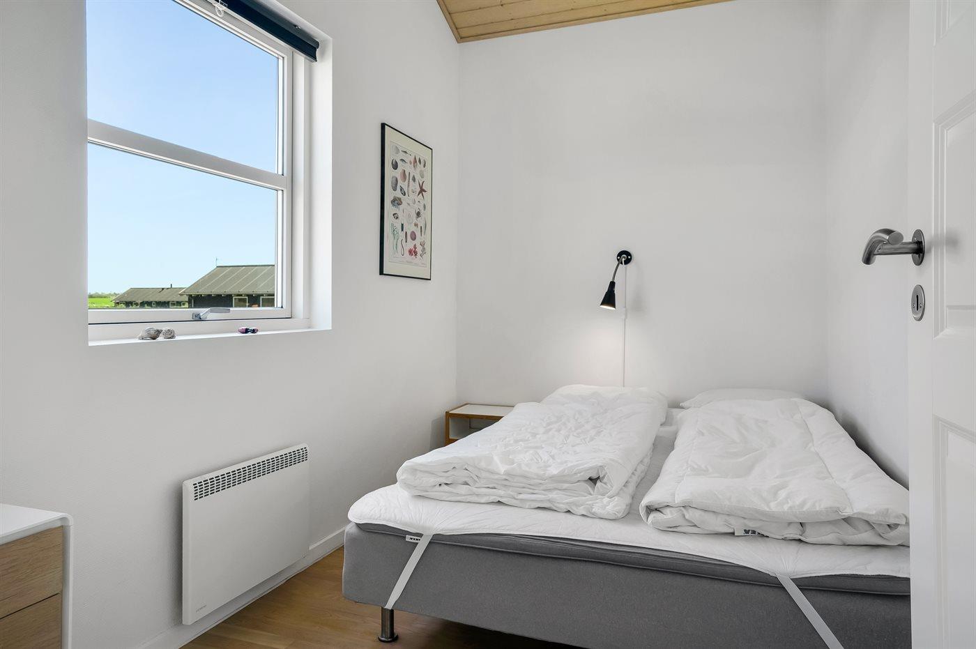 Husets indretning er lys og indbydende med loft til kip og omfatter stort køkken-alrum og stue i ét, 4 soveværelser og 2 badeværelser. Hertil kommer hems. Sovepladserne fordeler sig på 4 sovepladser i dobbeltsenge og 2 sovepladser i enkeltsenge.