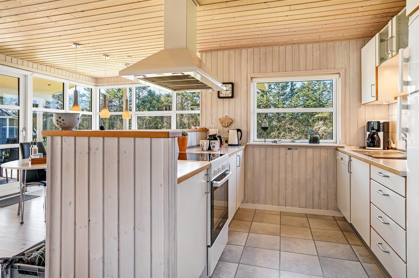 Køkkenet er udstyret med 1 køleskab. Der er 4 keramiske kogeplader, varmluftovn, mikrobølgeovn samt opvaskemaskine.
