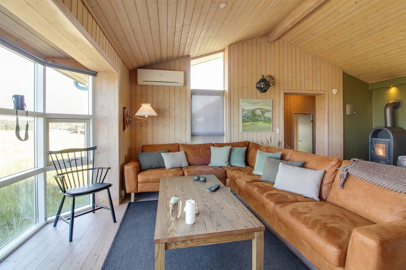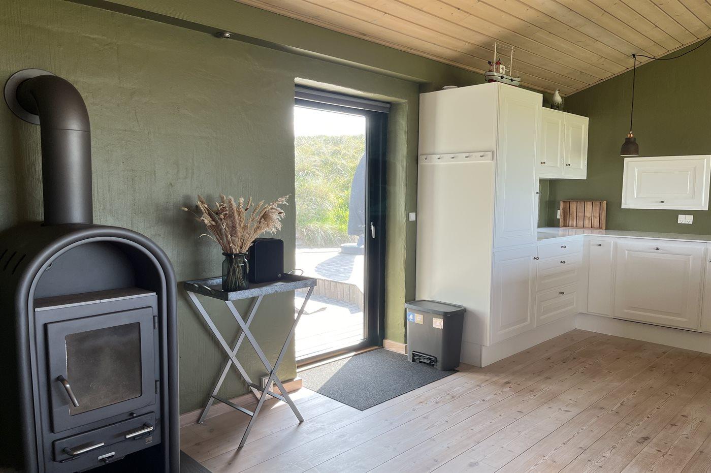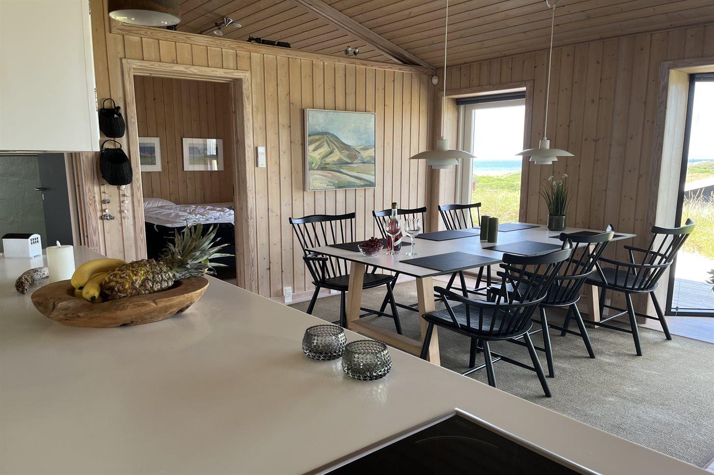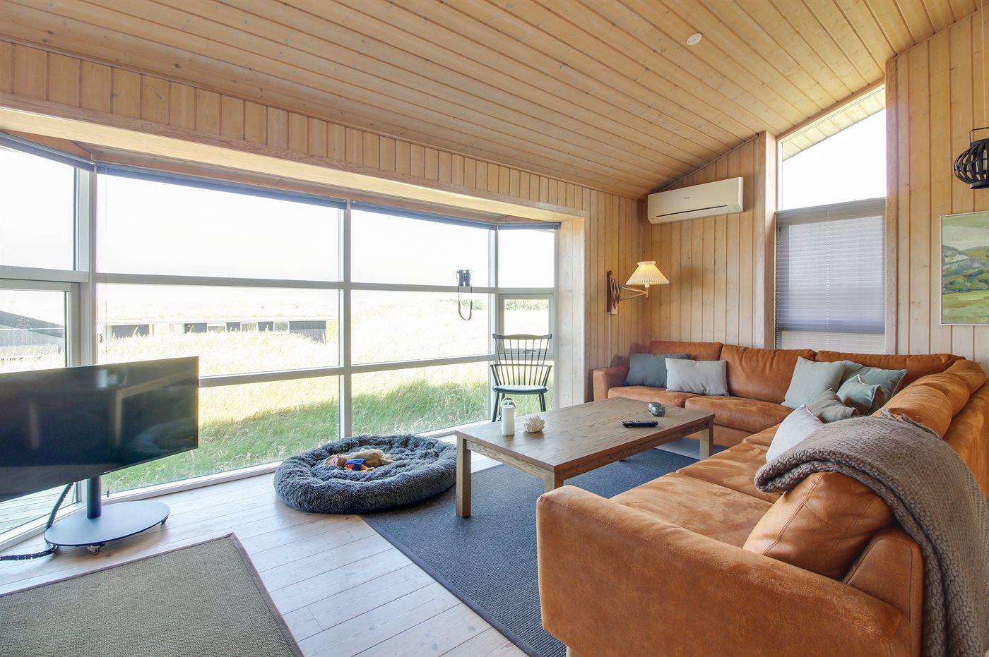 Flot feriehus med havudsigt og en placering midt i det kuperede klitlandskab. Huset er omgivet af klitter på de 2 sider og med fantastisk udsigt til Vesterhavet fra husets stue og soveværelse. Efter blot 5 minutter på gåben står du på en af Danmarks smukkeste badestrande. Et yderst attraktivt område der, med et utal af strandstier, indbyder til familietraveture i klitterne.
