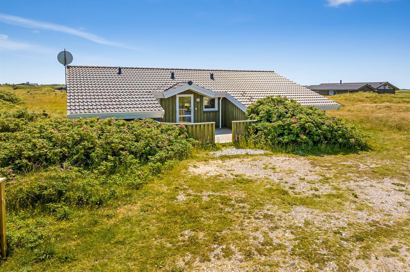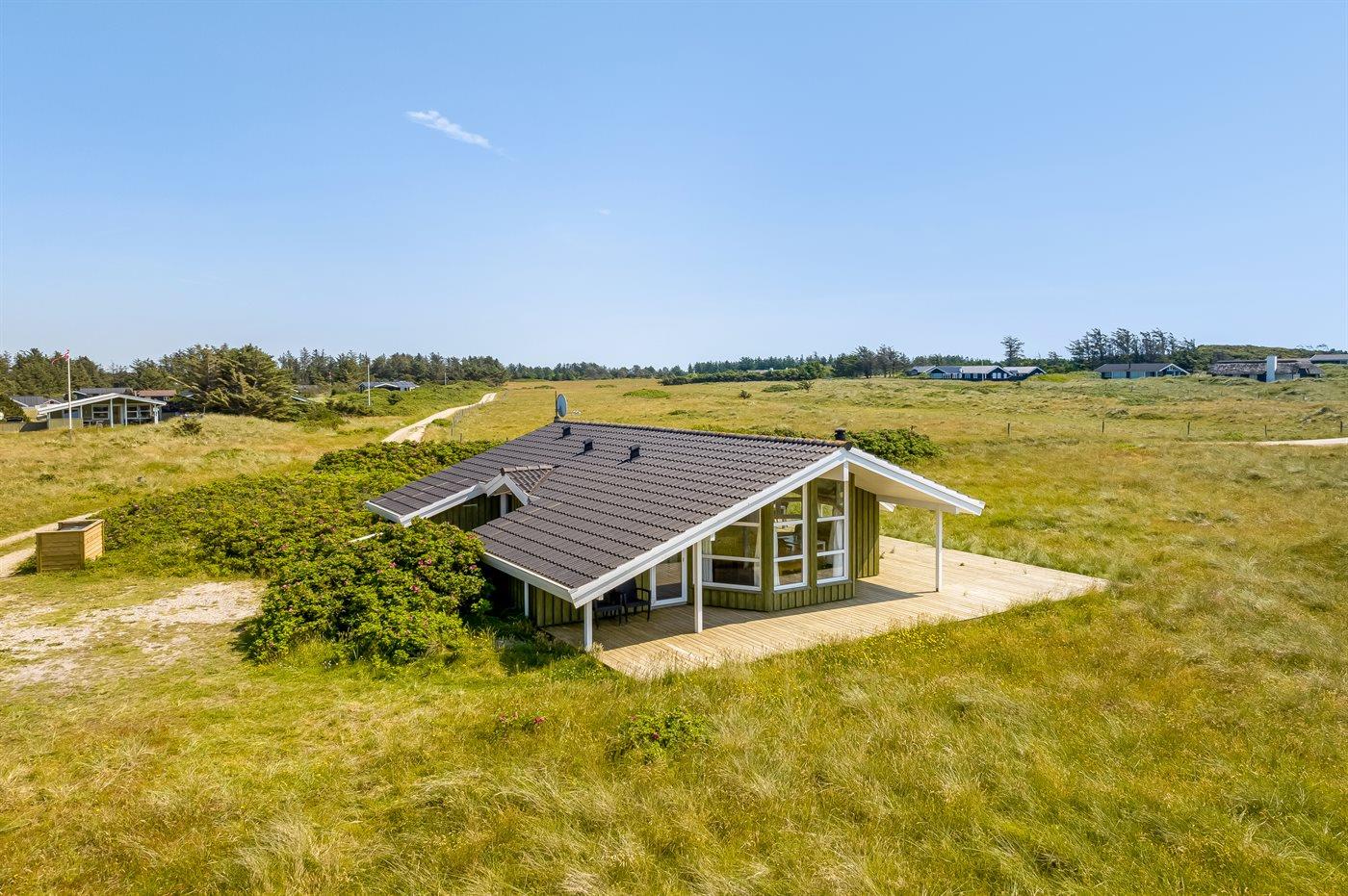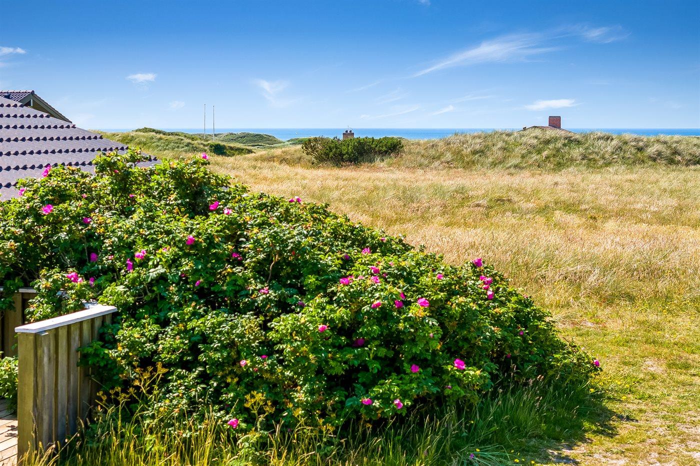 Lækkert fritidshus med udsigt fra stuen ud over klitområdet og Vesterhavet. Huset er beliggende på en naturgrund med marehalm og hyben i et yderst attraktivt område der indbyder til familietraveture i klitterne samt strandaktivitet ved havet.