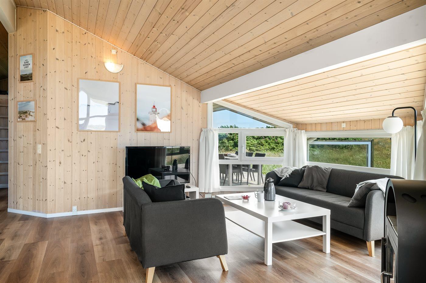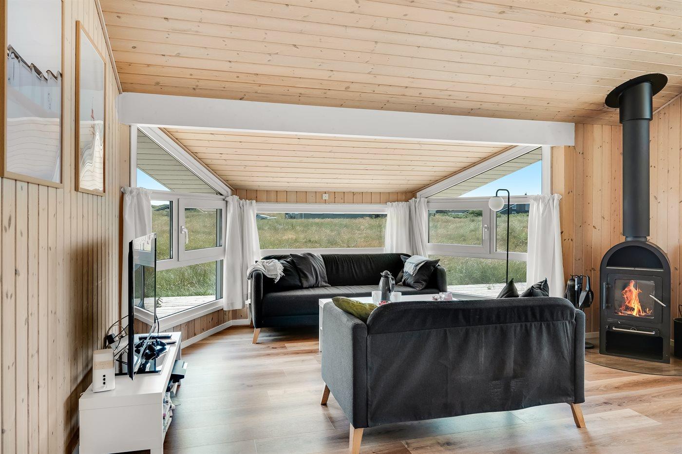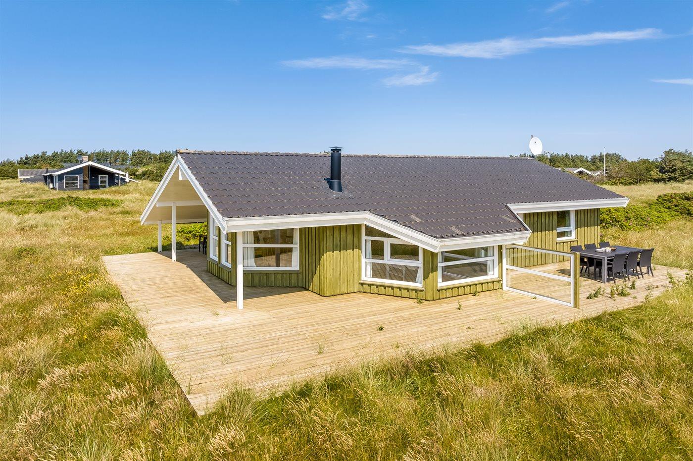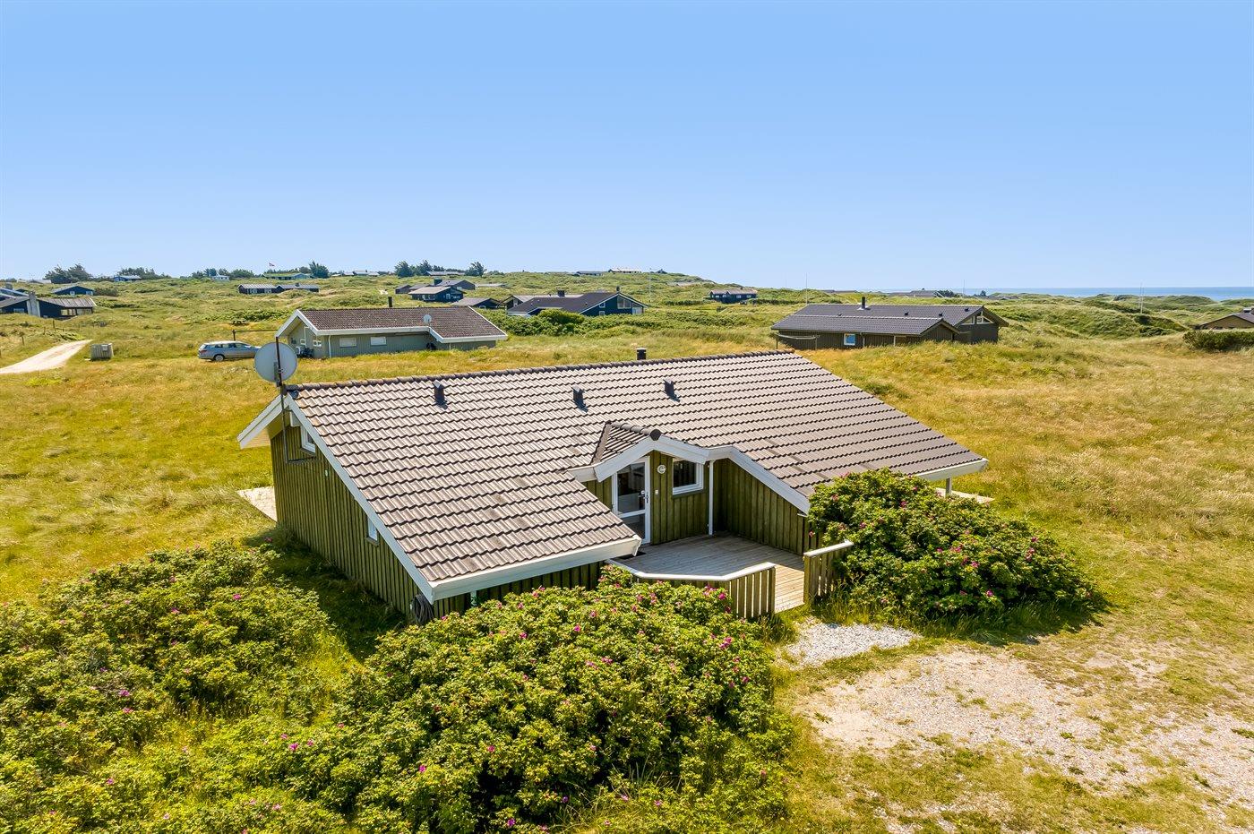 Lækkert fritidshus med udsigt fra stuen ud over klitområdet og Vesterhavet. Huset er beliggende på en naturgrund med marehalm og hyben i et yderst attraktivt område der indbyder til familietraveture i klitterne samt strandaktivitet ved havet.