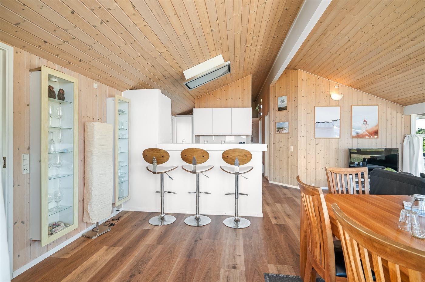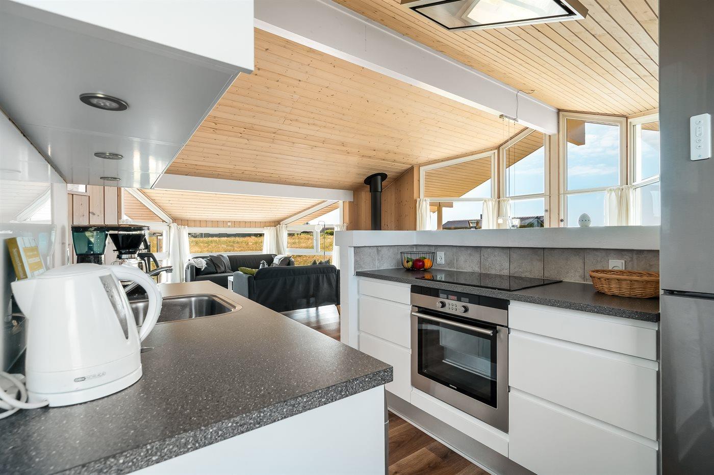 Køkkenet er udstyret med 1 køleskab. Der er 4 keramiske kogeplader, varmluftovn, mikrobølgeovn samt opvaskemaskine.