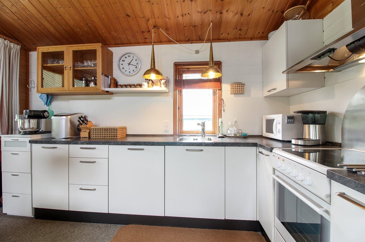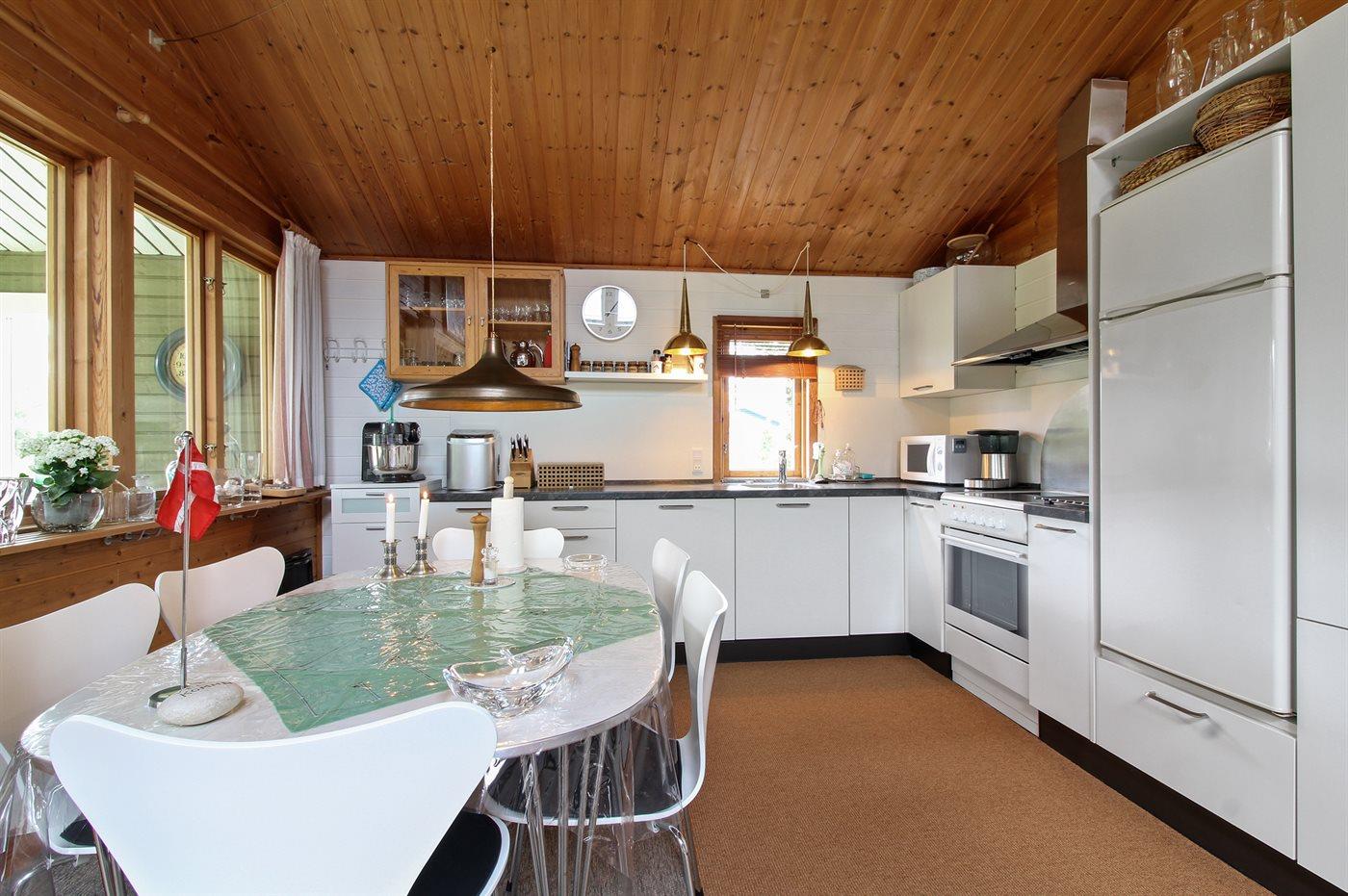 Køkkenet er udstyret med 1 køleskab. Der er 4 keramiske kogeplader, varmluftovn, mikrobølgeovn samt opvaskemaskine.