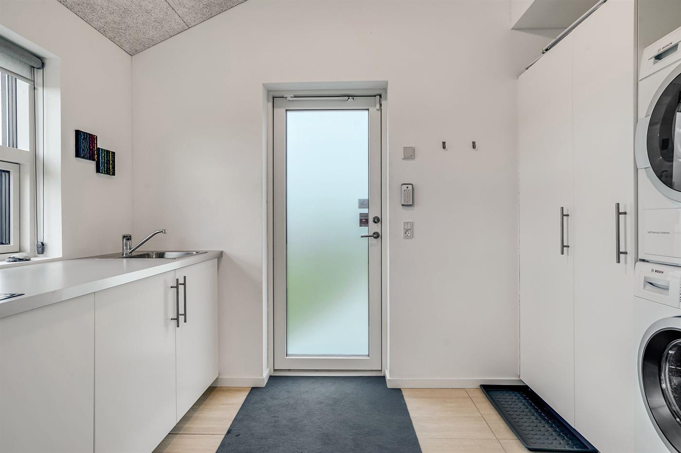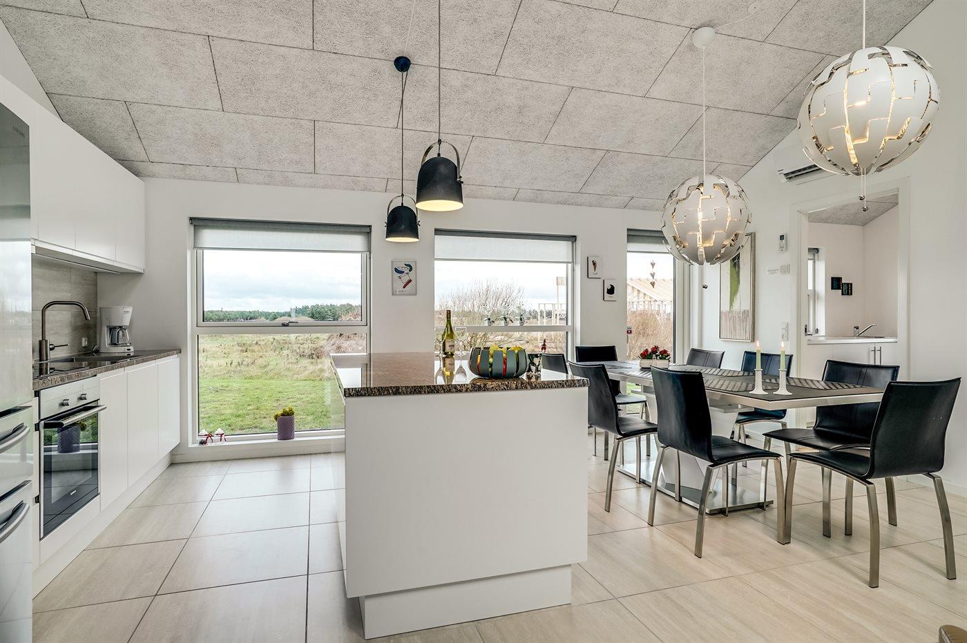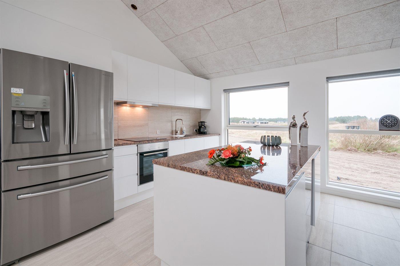 Køkkenet er udstyret med 1 amerikansk køleskab. Der er 4 induktionskogeplader, varmluftovn, mikrobølgeovn samt opvaskemaskine.