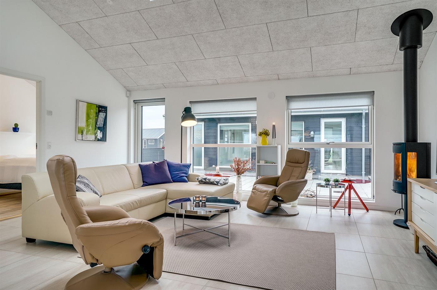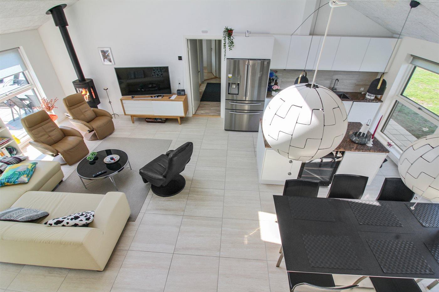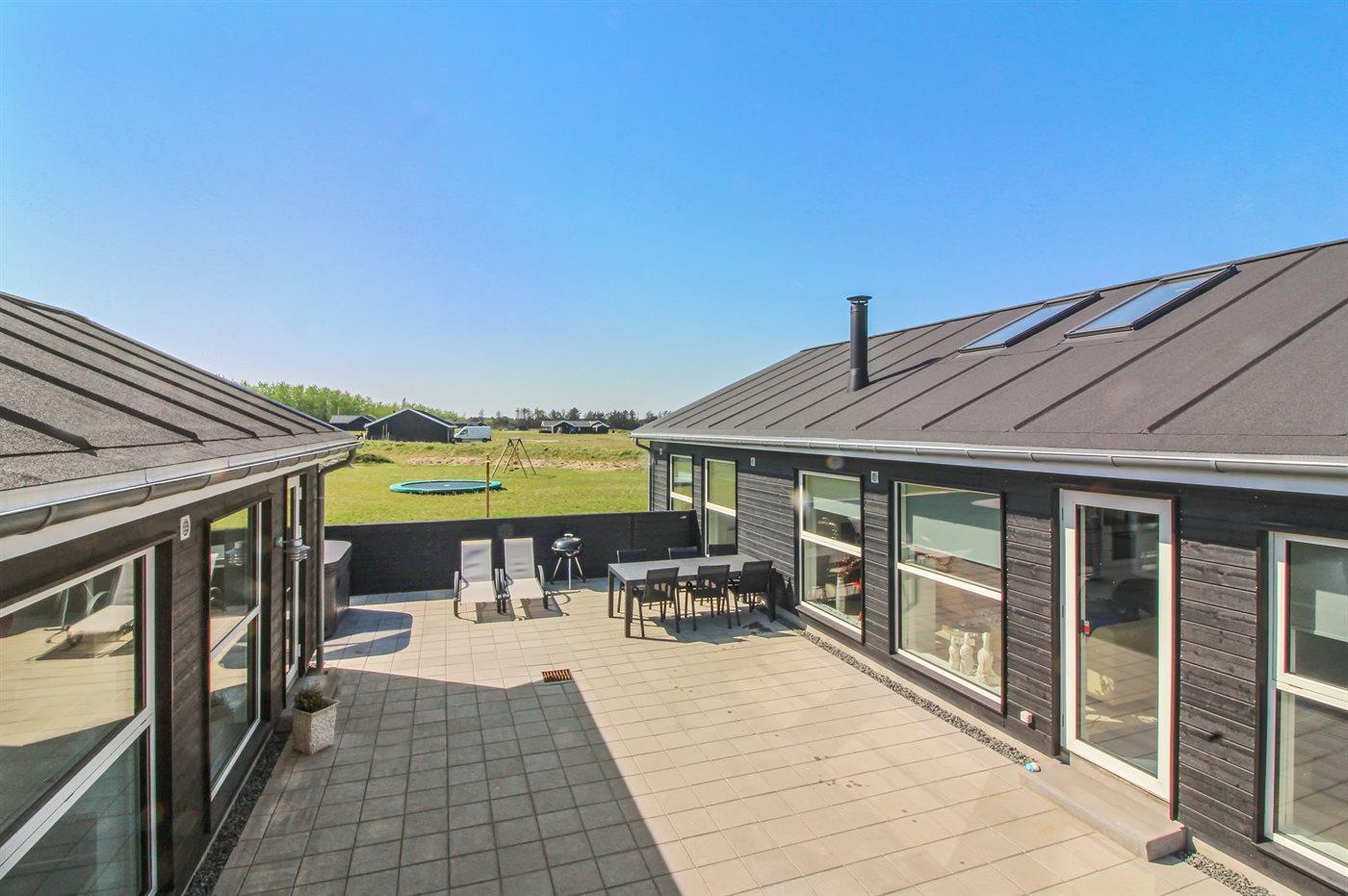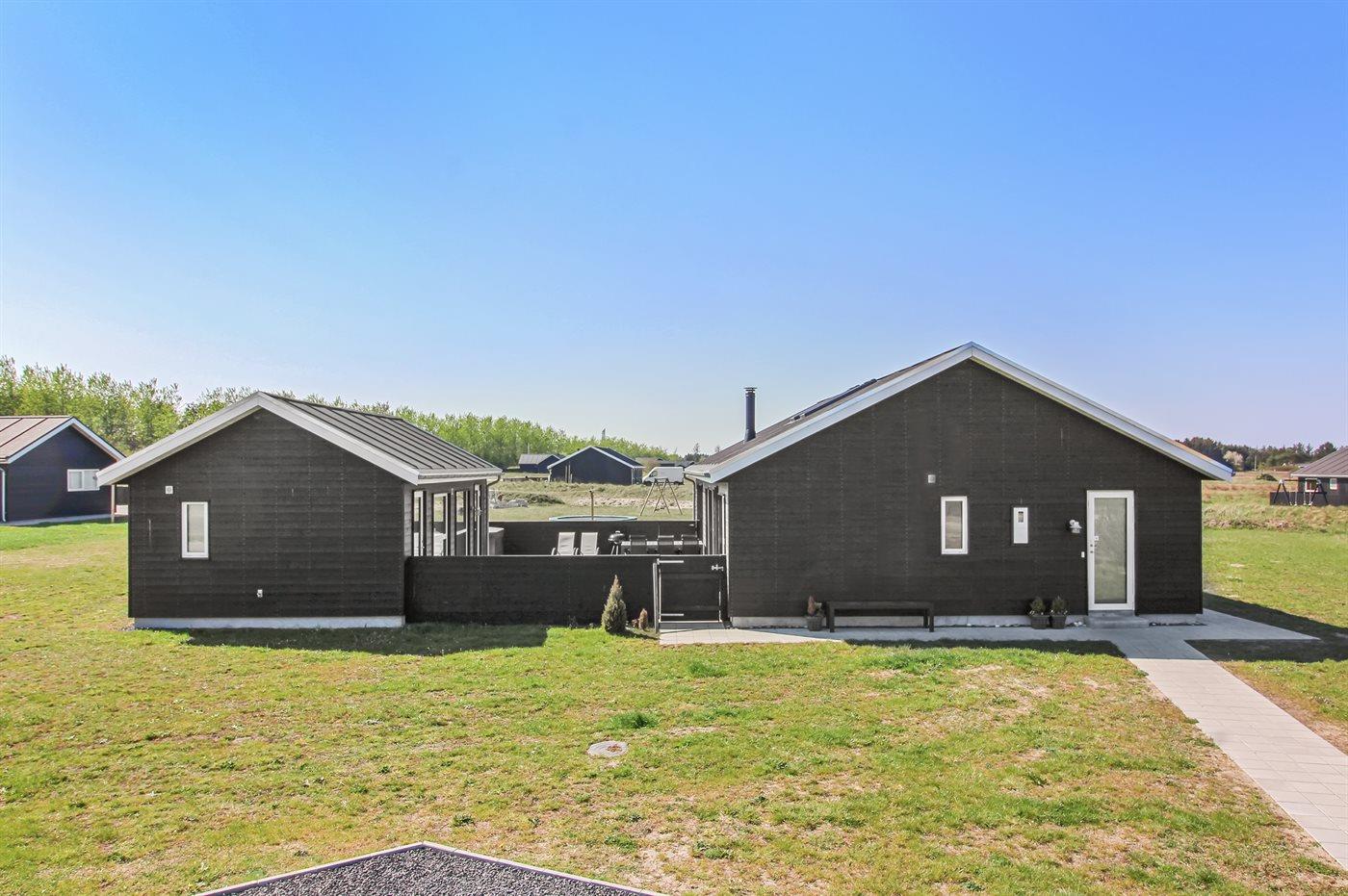 Helt nyt og lækkert sommerhus med god plads beliggende på en meget stor og åben grund, på en blind sidevej, i et nyt sommerhusområde under opførelse. Området byder på 3 søer og ligger i kort afstand til Vesterhavet og dejlig badestrand. Huset er meget veludstyret med gode sengeforhold samt aktivitetsmuligheder. Aktivitetsrummet er i annekset, som endvidere også er indrettet med gæstetoilet. På husets skønne, lukkede terrasse findes der bl.a. en udendørs spa til 4 personer, som kan benyttes fra uge 14 til og med uge 44. Bemærk: 2 sovepladser befinder sig på madrasser på hems.