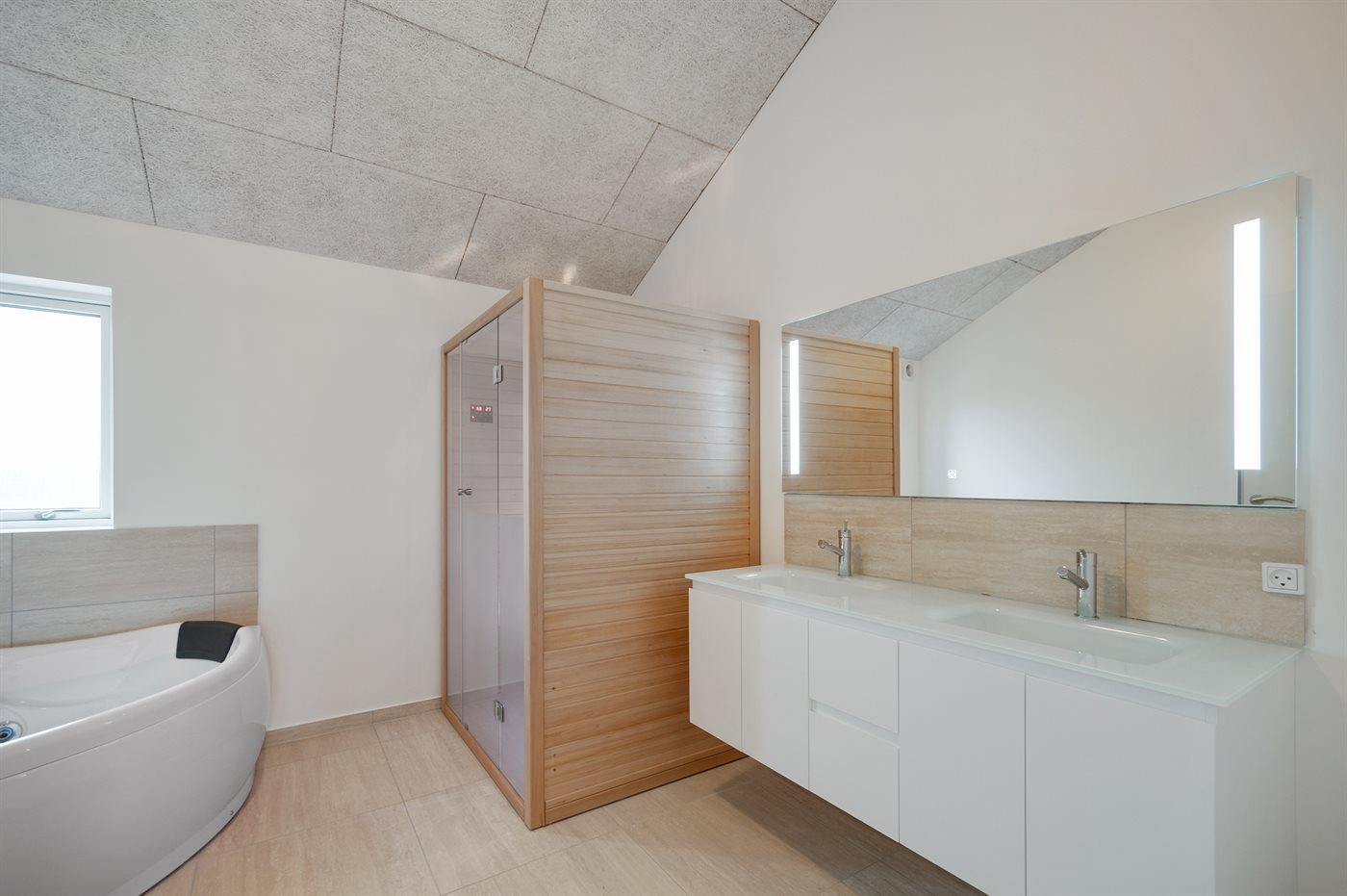 Der er 2 badeværelser med bruseniche og 3 toiletter, heraf 1 gæstetoilet. Der er gulvvarme på 2 badeværelser. Der er gulvvarme på gæstetoilettet. I saunaen er der mulighed for afslapning.