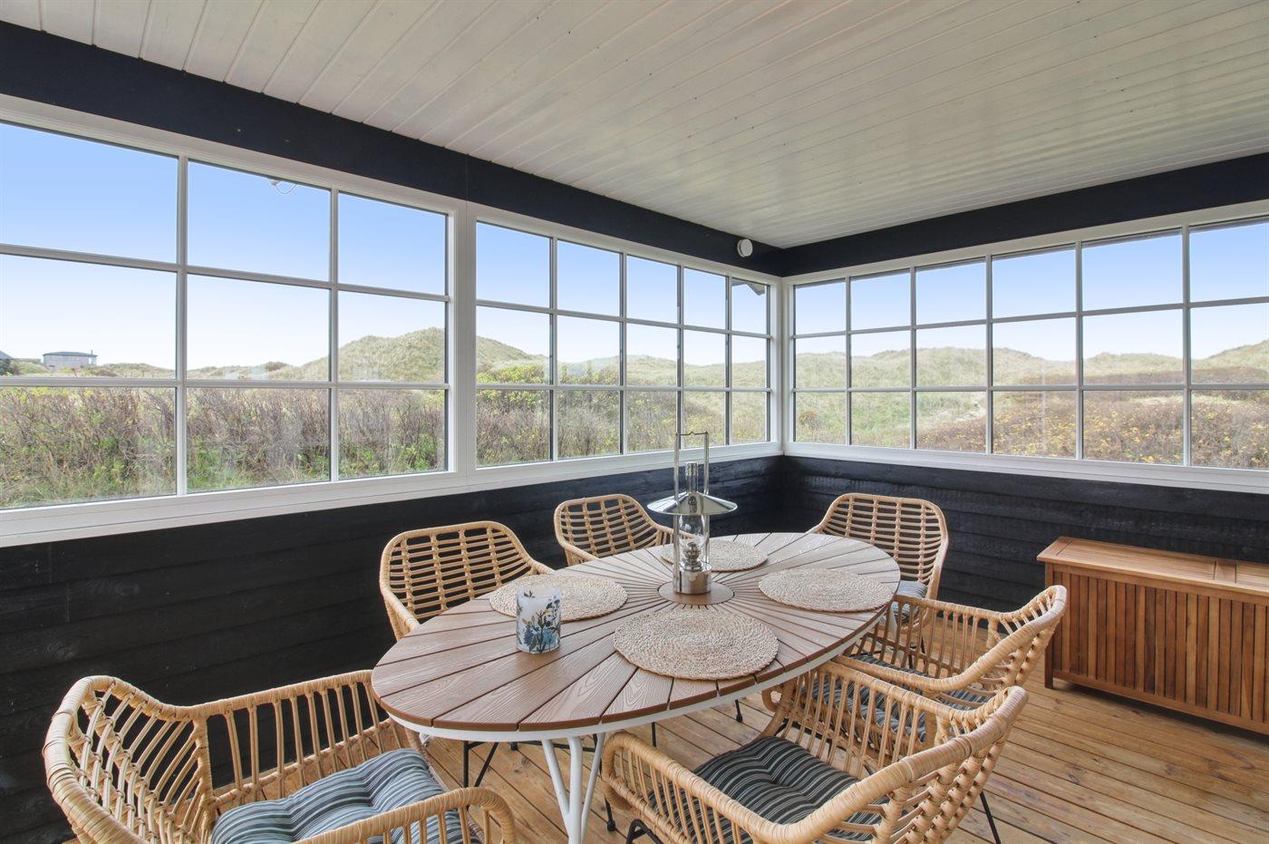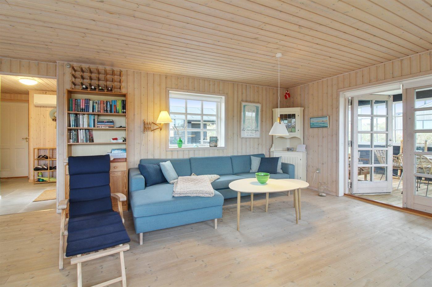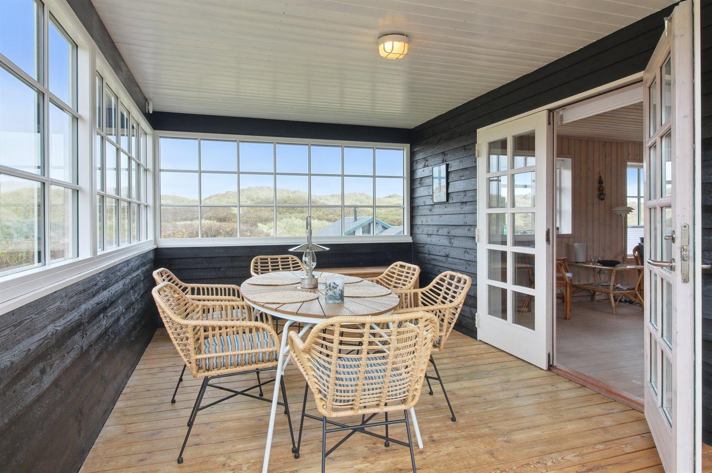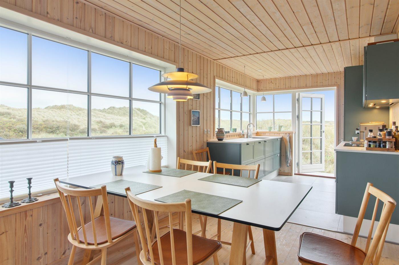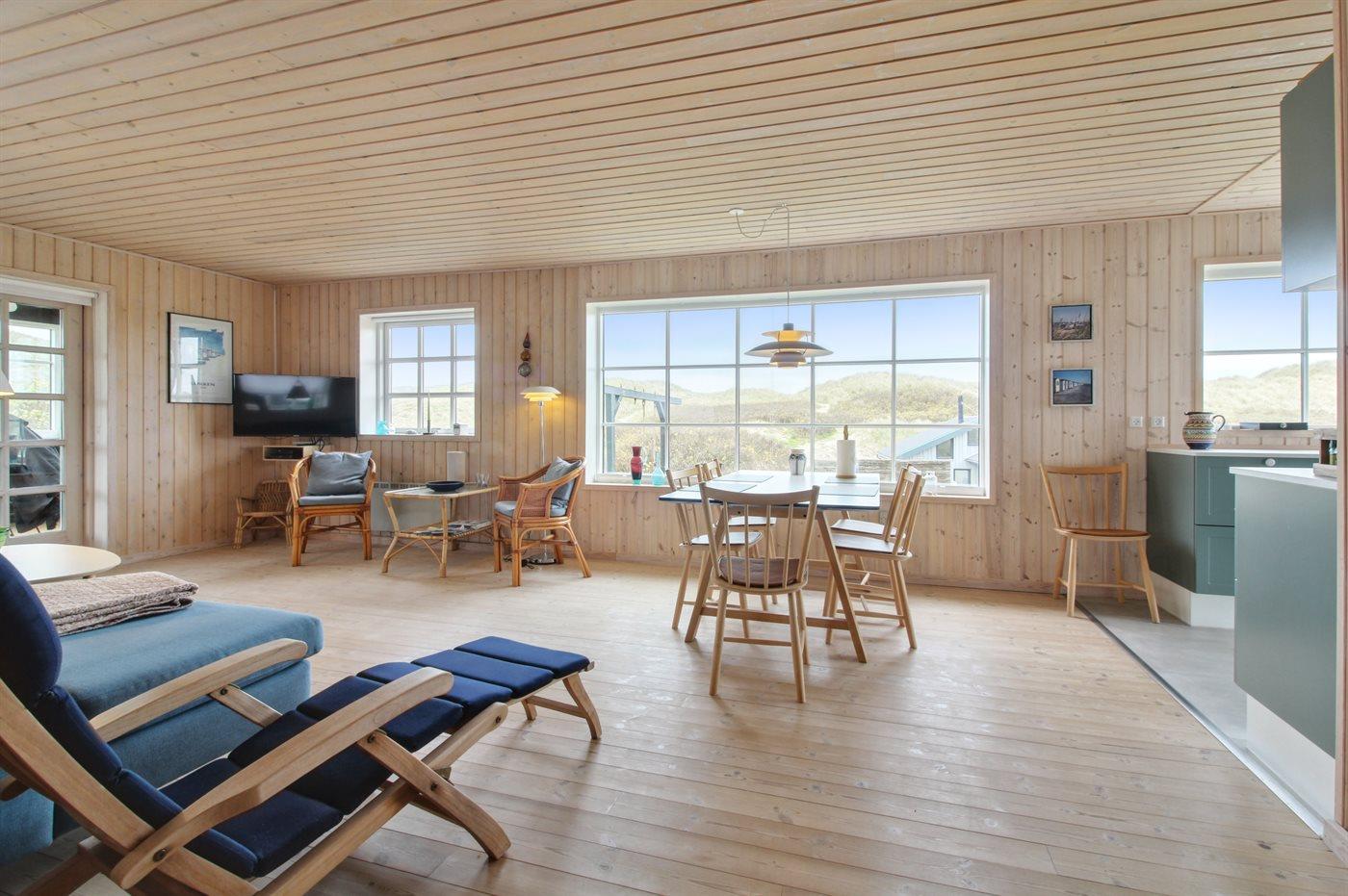 Sommerhuset har et veludstyret, åbent køkken med et stort vinduesparti, som giver masser af lys. I forlængelse af stuen ligger en skøn havestue, og derudover findes der tre gode soveværelser og et stort badeværelse med vaskemaskine, tørretumbler og gulvvarme. Sommerhuset ligger for enden af en blind vej på en stor klitgrund, imellem bølgende marehalm og hybenbuske.
