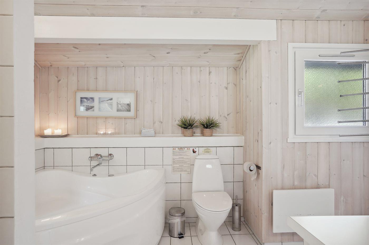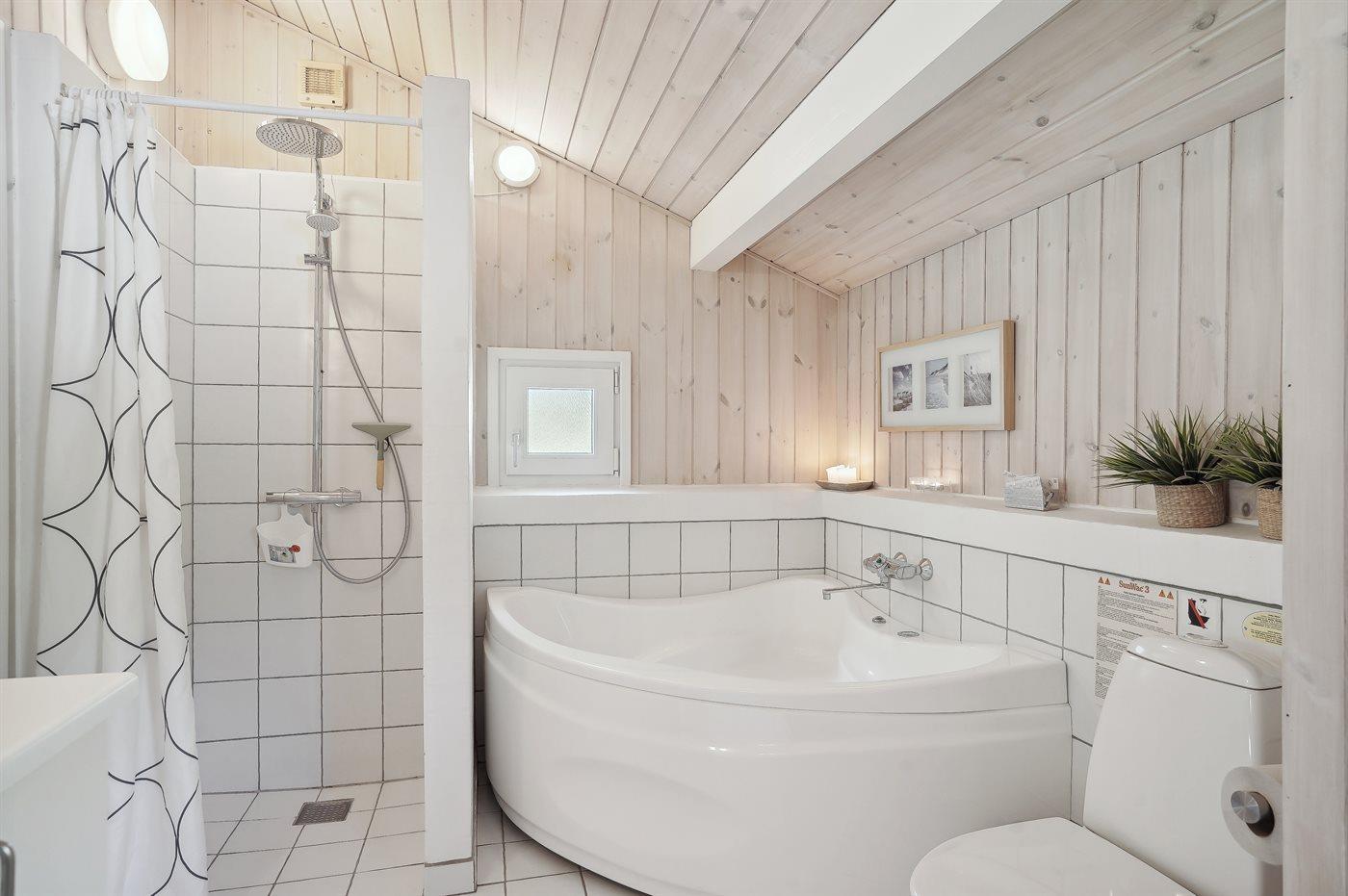 Der er 2 badeværelser med bruseniche og 2 toiletter. Der er gulvvarme på 1 badeværelse. I saunaen er der mulighed for afslapning.