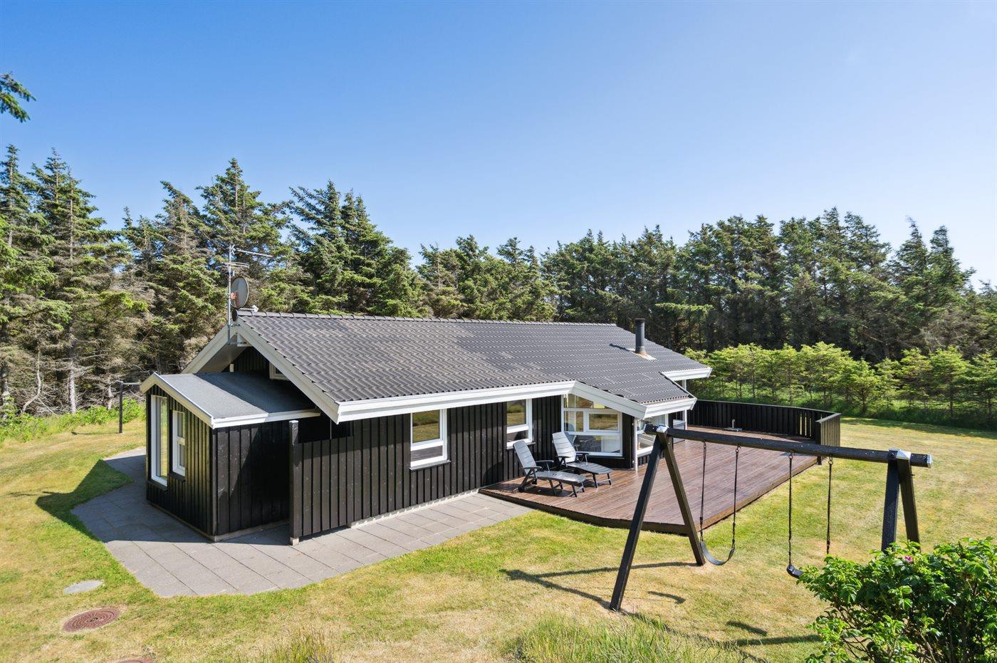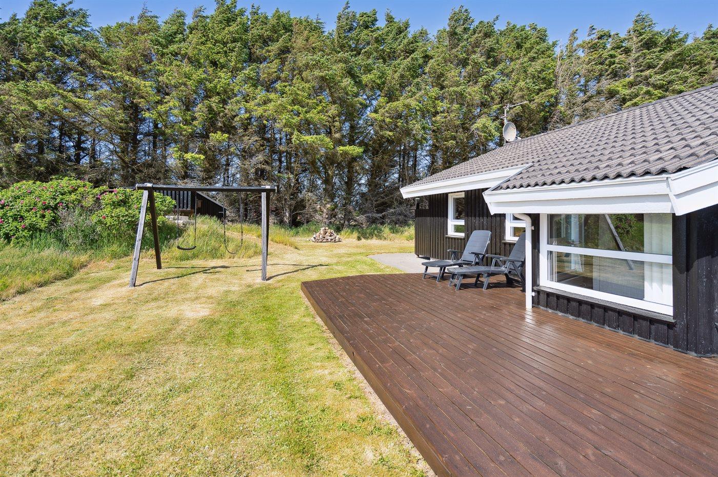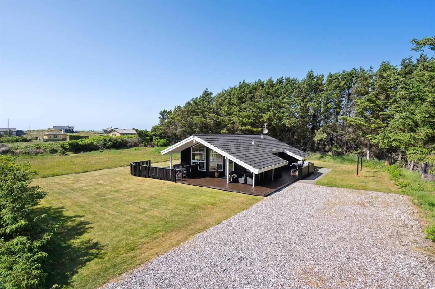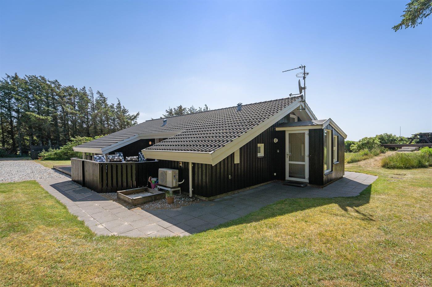 Velholdt sommerhus med en dejlig beliggenhed på en meget stor grund, der delvist er omkranset af høje træer. Fra husets terrasse er der havkig til Vesterhavets blå bølger. For enden af vejen fører en sti gennem klitterne direkte ned til den fantastiske hvide sandstrand i Grønhøj.
