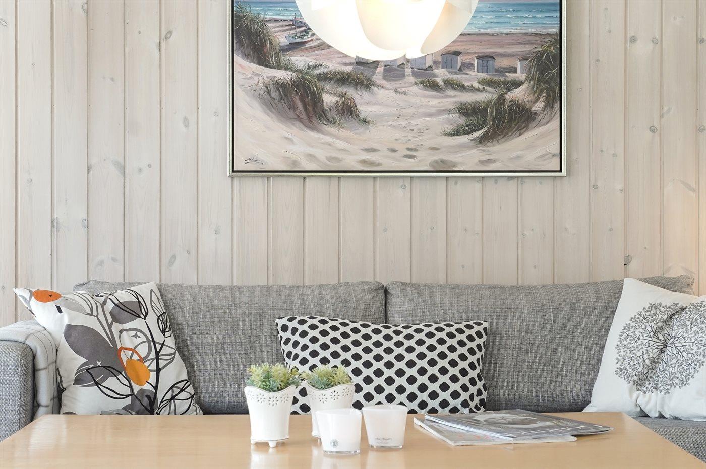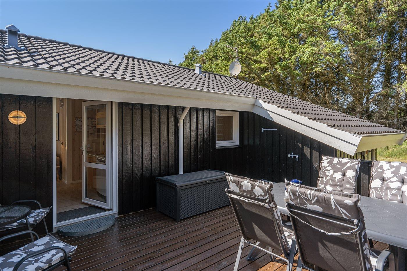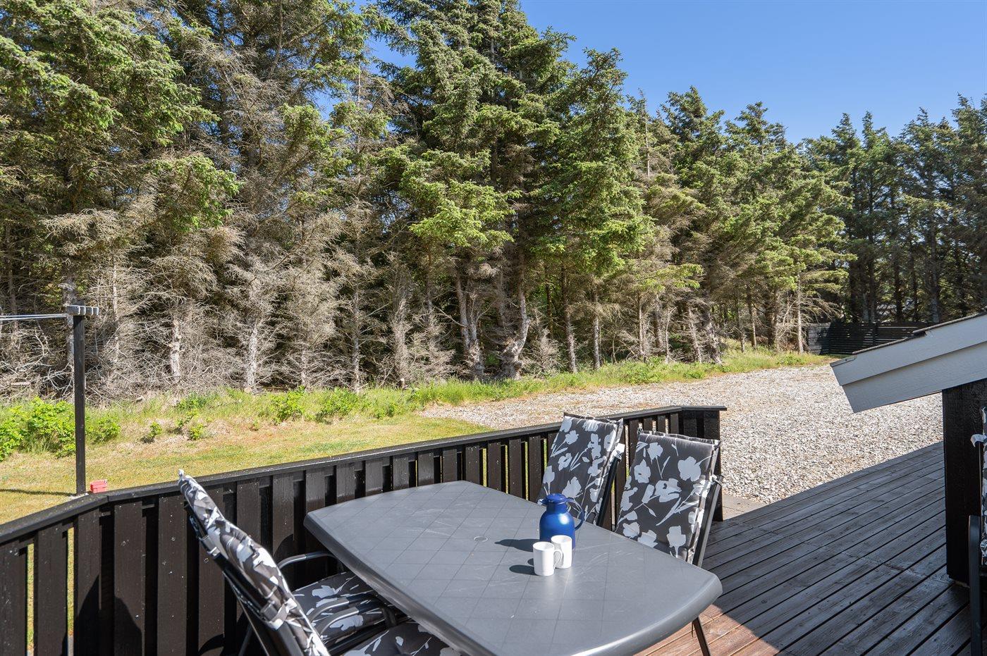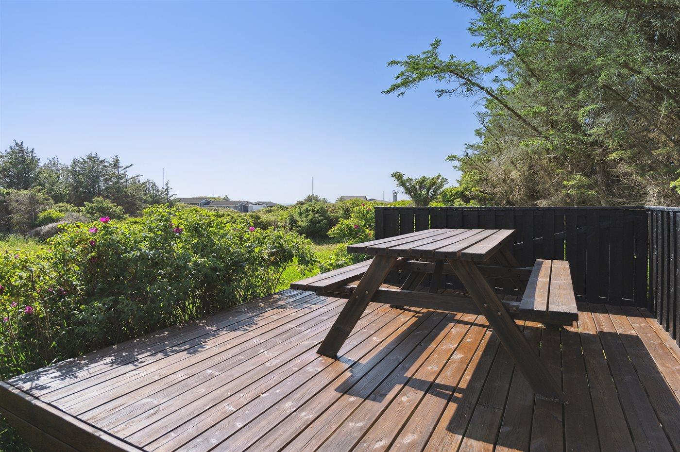 Velholdt sommerhus med en dejlig beliggenhed på en meget stor grund, der delvist er omkranset af høje træer. Fra husets terrasse er der havkig til Vesterhavets blå bølger. For enden af vejen fører en sti gennem klitterne direkte ned til den fantastiske hvide sandstrand i Grønhøj.