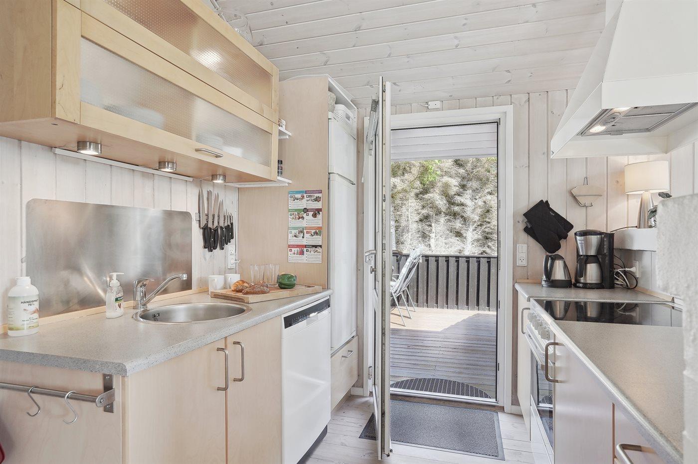 Køkkenet er udstyret med 1 køleskab. Der er 4 keramiske kogeplader, varmluftovn, mikrobølgeovn samt opvaskemaskine.