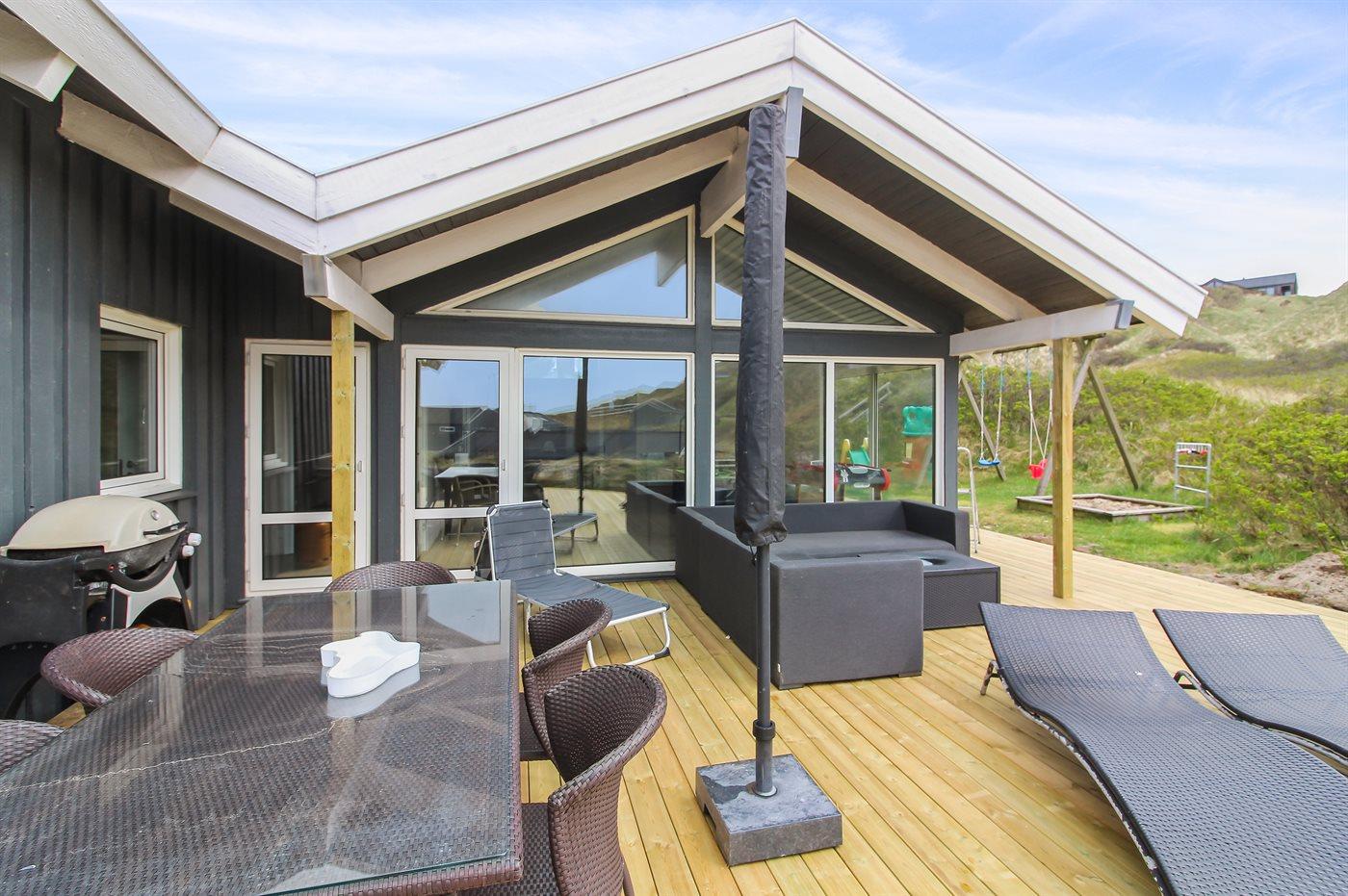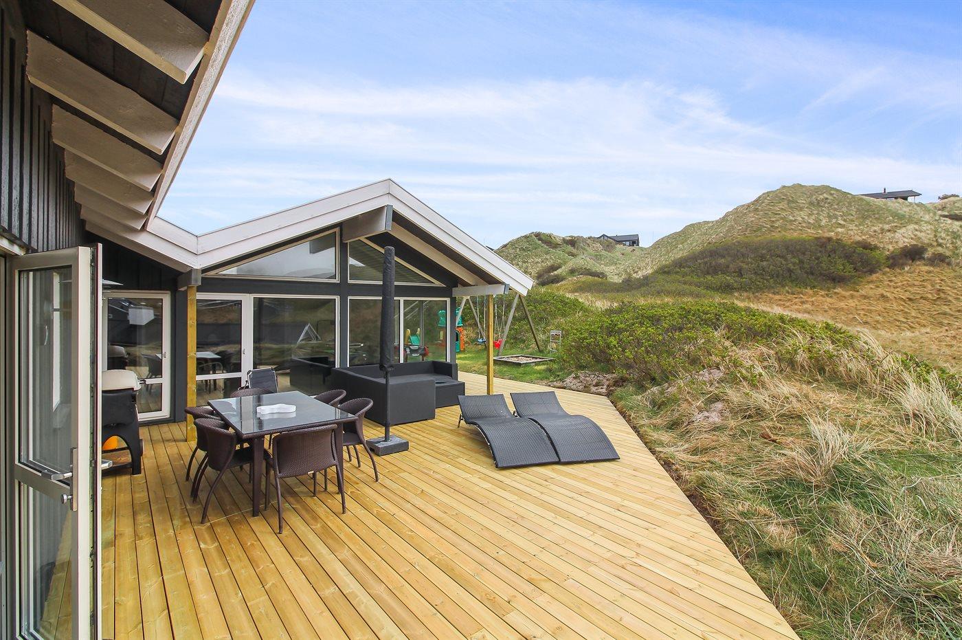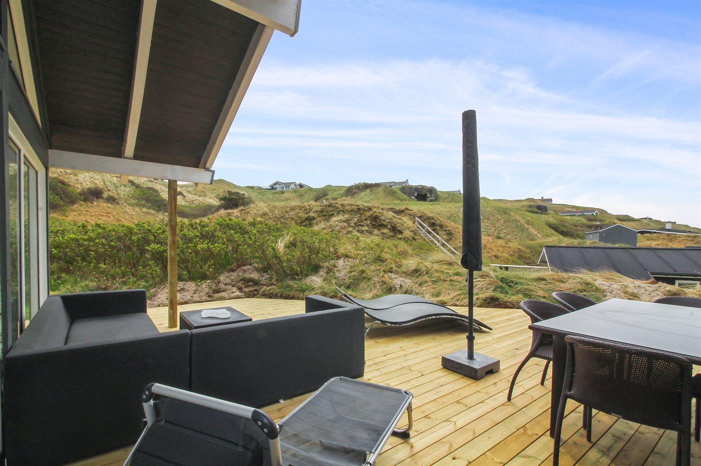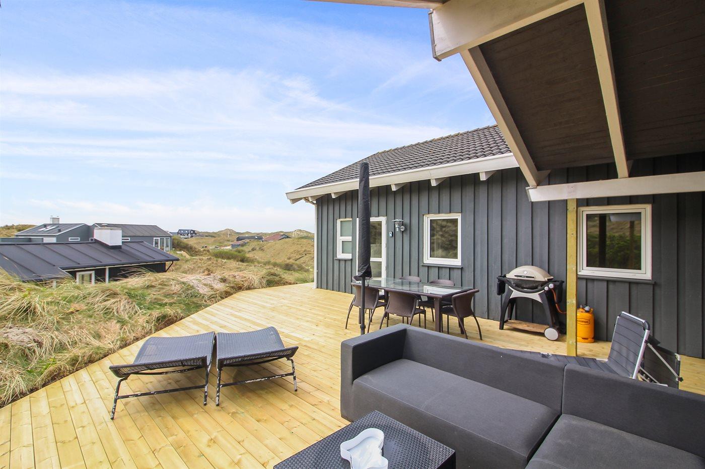 Ferieboligen er beliggende på en 2758 m² stor klitgrund. Der er 350 m til havet. Nærmeste forretning er beliggende i en afstand af 5000 m. Til ferieboligen hører 75 m² terrasseareal. Desuden er der 10 m² overdækket terrasse. Gynge. Sandkasse. Rutchebane. Grill til rådighed. Der er installeret stik til opladning af elbil. Type 2 stik.