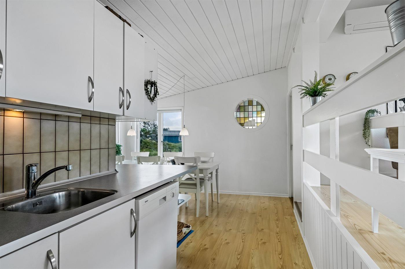 Køkkenet er udstyret med 1 køleskab. Der er 4 keramiske kogeplader, varmluftovn, mikrobølgeovn samt opvaskemaskine.