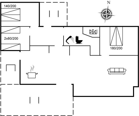 Der er i alt 3 soveværelser. Sovepladserne fordeler sig på: 4 sovepladser i dobbeltsenge. 2 sovepladser i enkeltsenge.