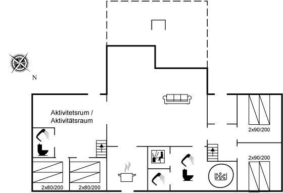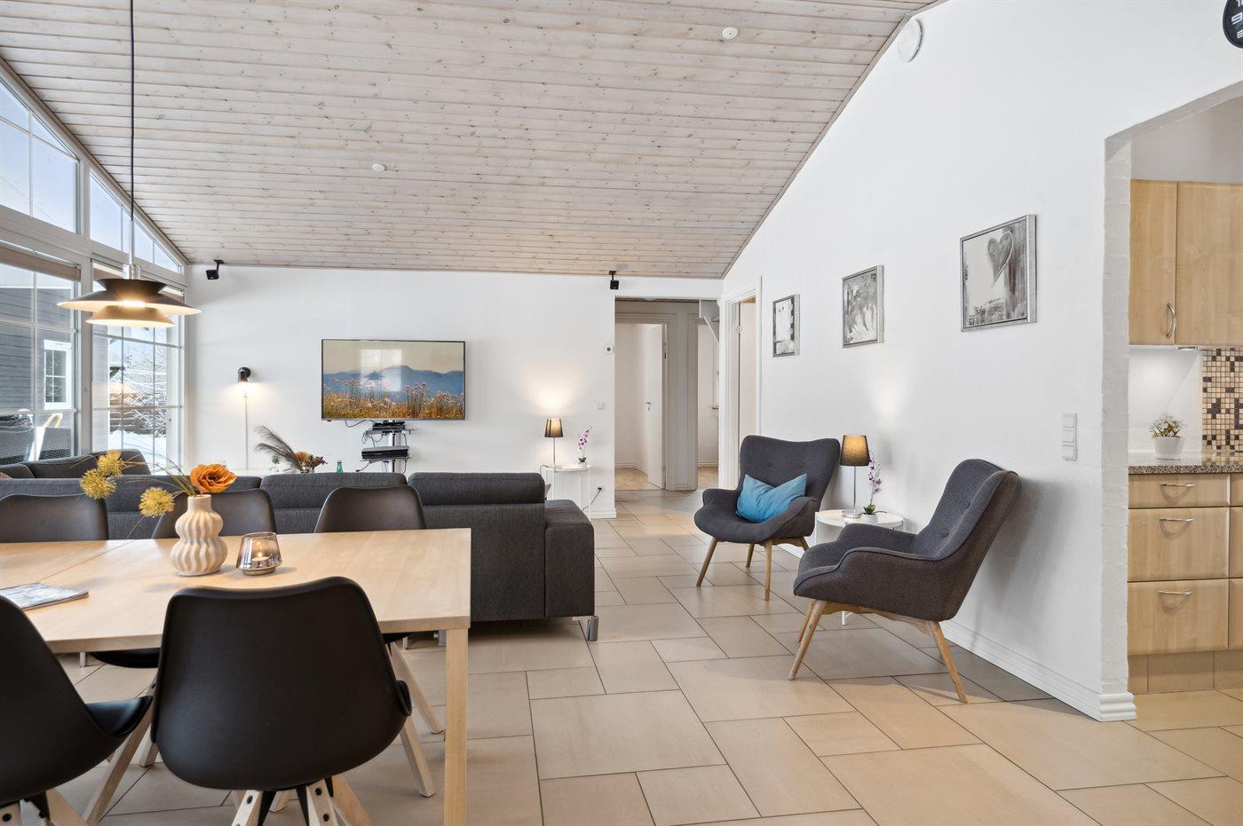 Huset er ideelt indrettet til flere familier, da det er opdelt i to soveafdelinger med hvert sit bad. Det store badeværelse er indrettet med et stort spabad samt sauna. Den flot møblerede stue fremtræder lys og indbydende takket være de store vinduespartier. Via en fransk dør har I adgang til aktivitetsrummet - her kan der dystes i flere forskellige spil, så medbring dit indre legebarn og husk: Tab og vind med samme sind.