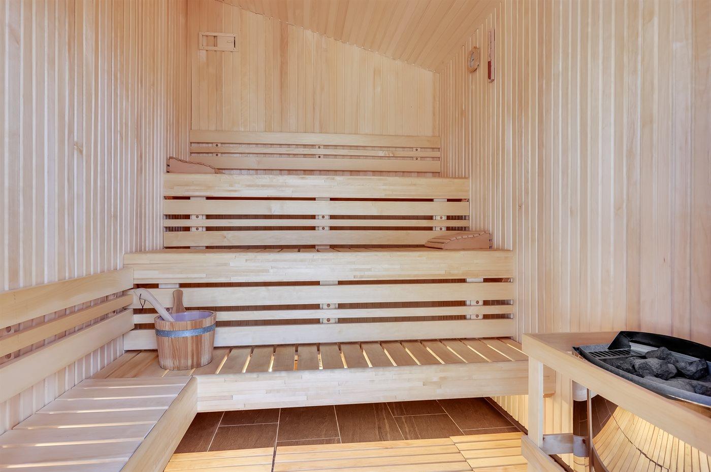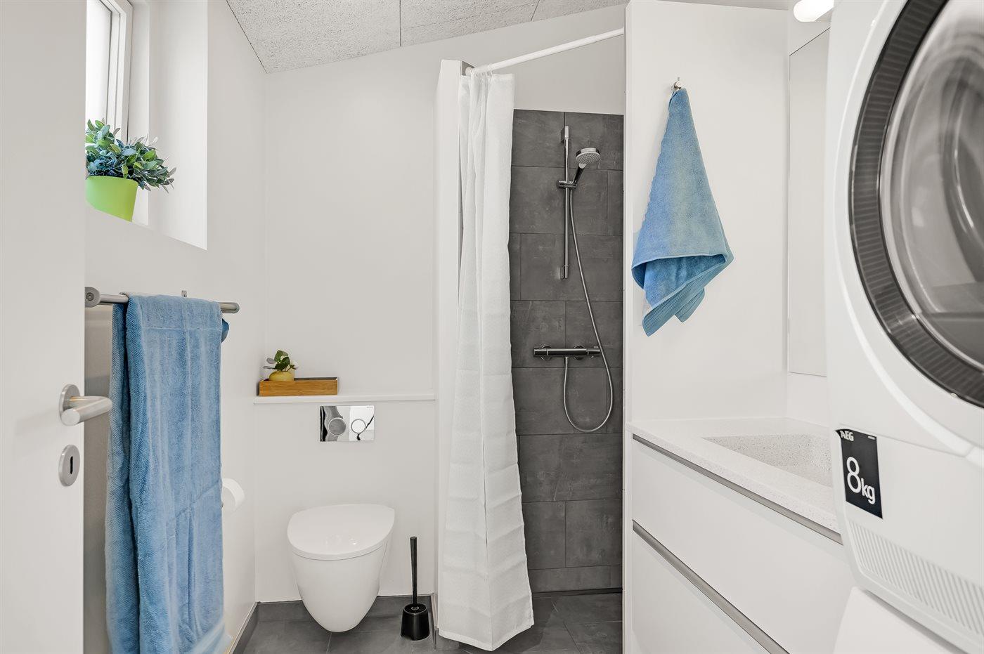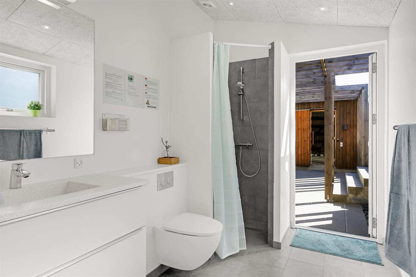 Der er 2 badeværelser med bruseniche og 2 toiletter. Der er gulvvarme på 2 badeværelser. I saunaen er der mulighed for afslapning.