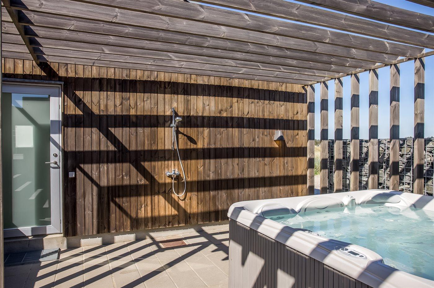Der er mulighed for afslapning i udendørs standvandsspa til 5 personer.