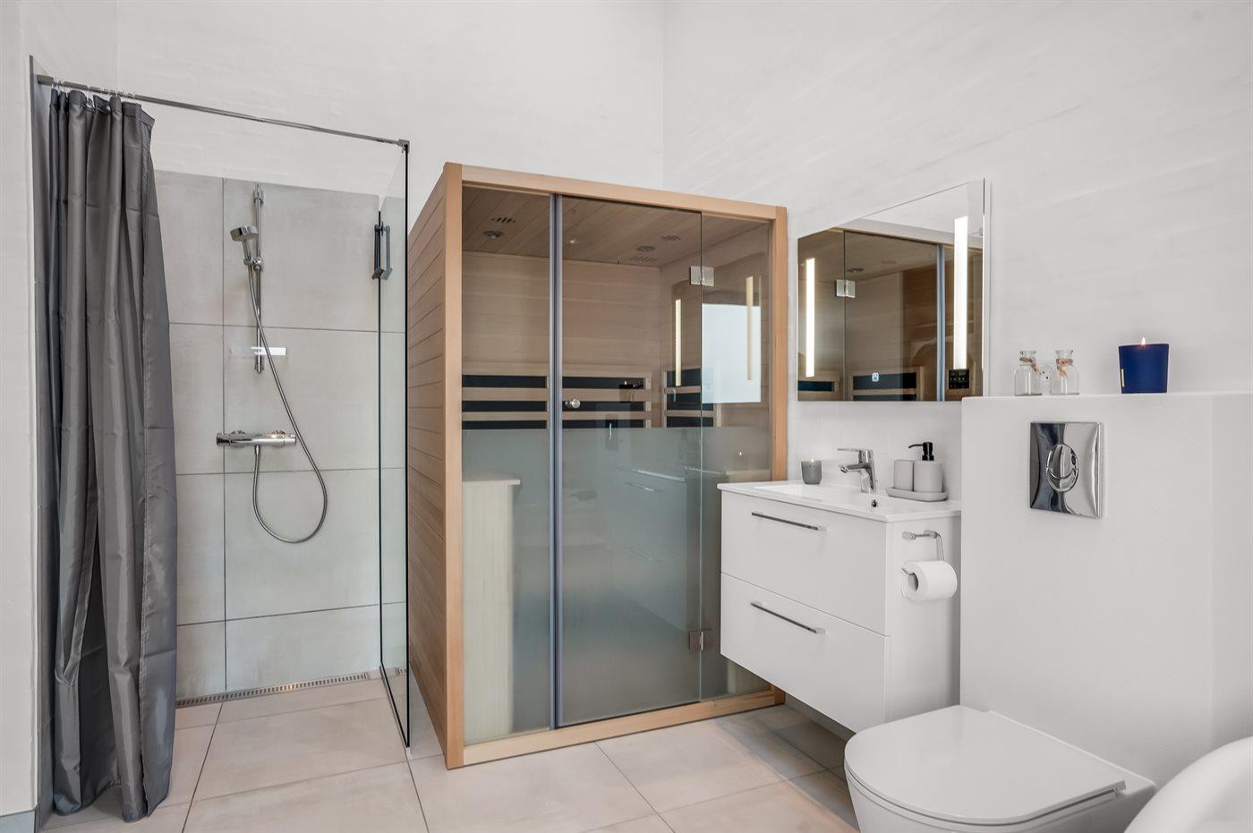 Der er 3 badeværelser med bruseniche og 3 toiletter. Der er gulvvarme på 3 badeværelser. I den infrarøde sauna er der mulighed for afslapning.