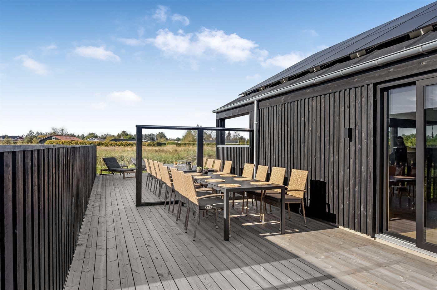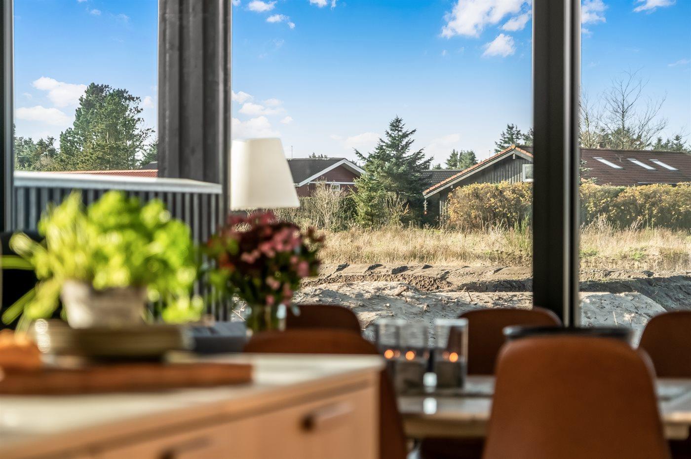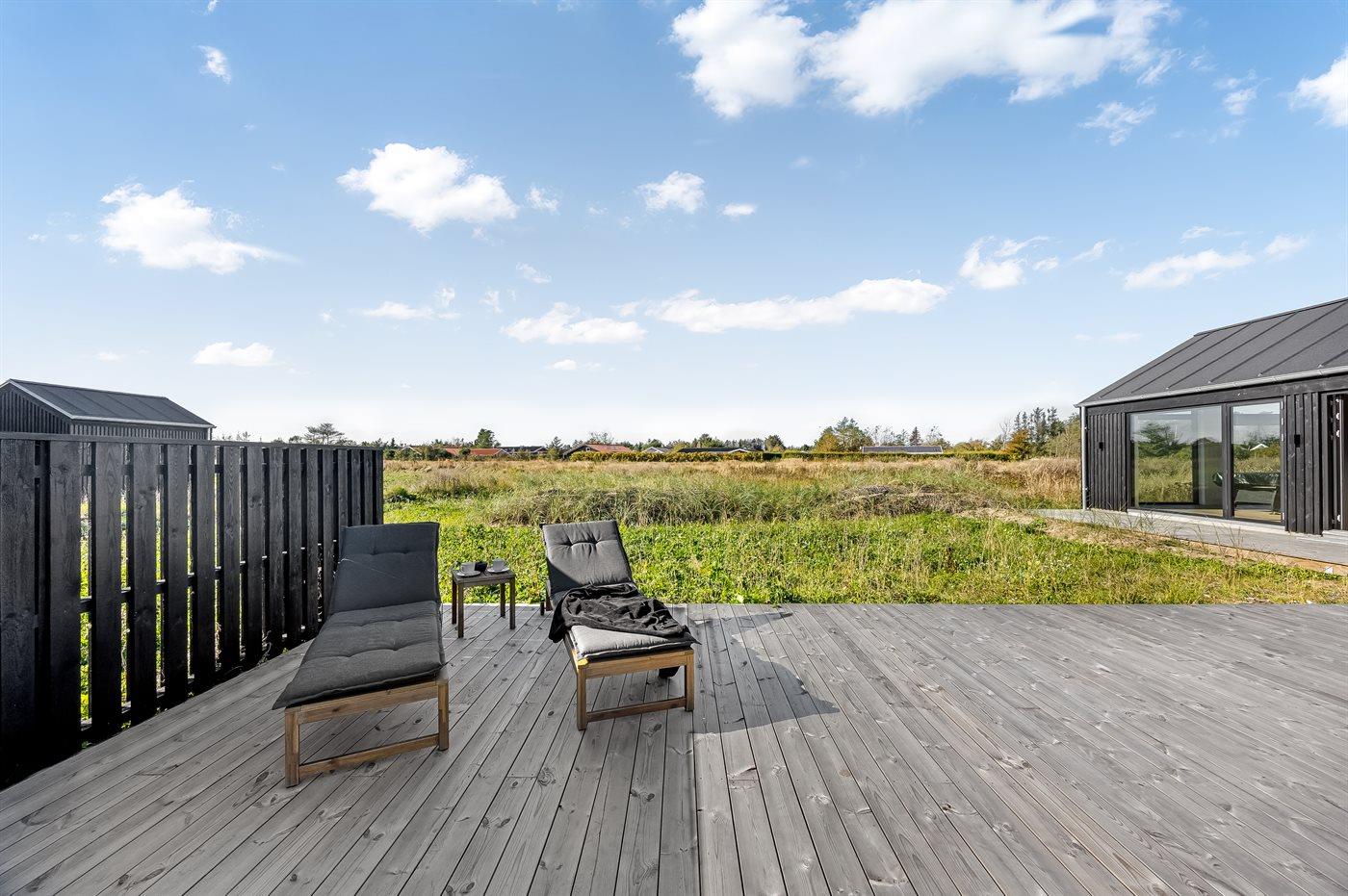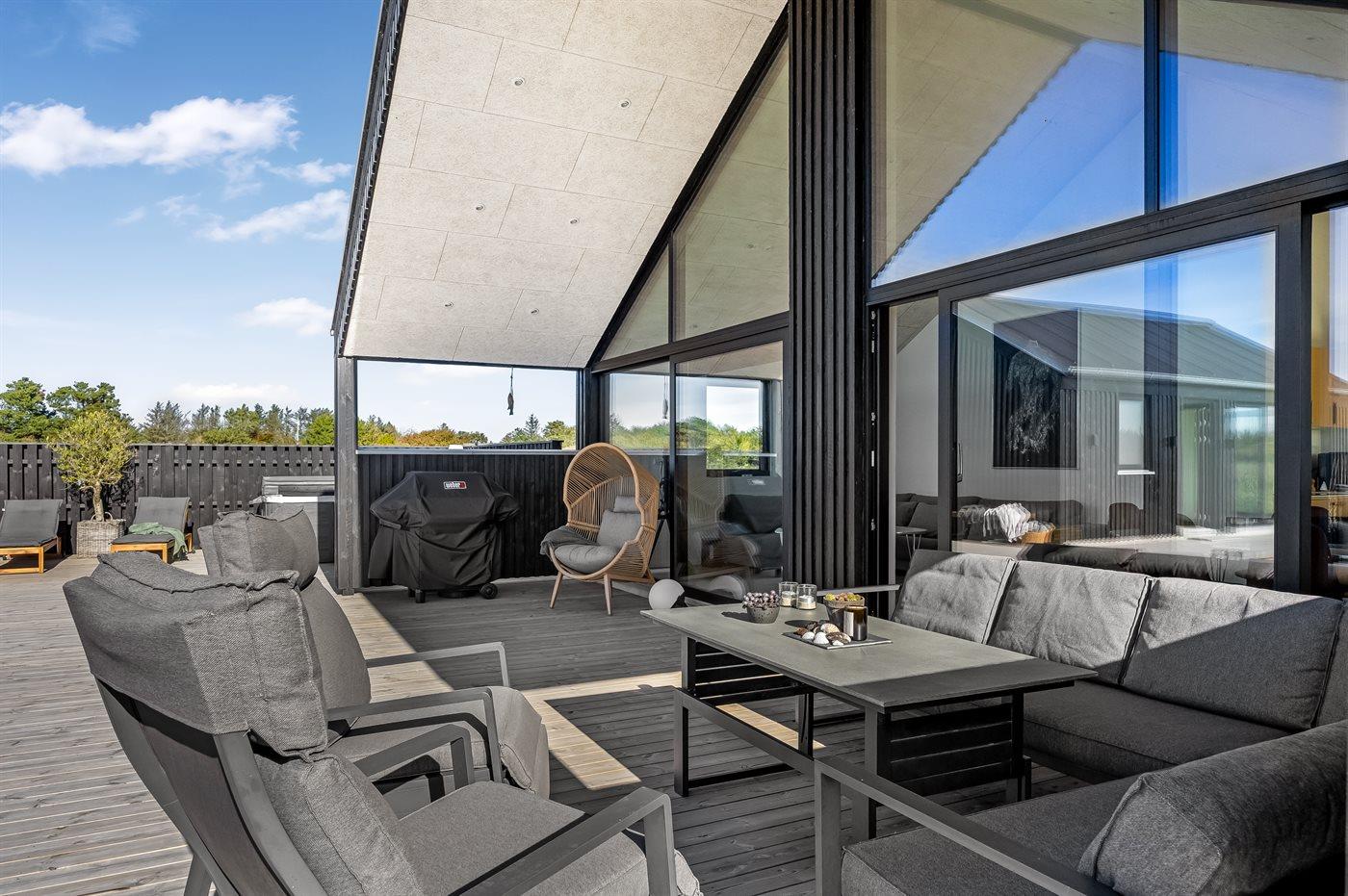 Ferieboligen er beliggende på en 2075 m² stor naturgrund. Der er 1200 m til havet. Nærmeste forretning er beliggende i en afstand af 600 m. Til ferieboligen hører åbent terrasseareal. Desuden er der overdækket terrasse. Udendørs bruser. Grill til rådighed. Der er installeret stik til opladning af elbil. Type 2 stik. Med 11 kW ladeeffekt. Parkering ved ferieboligen.