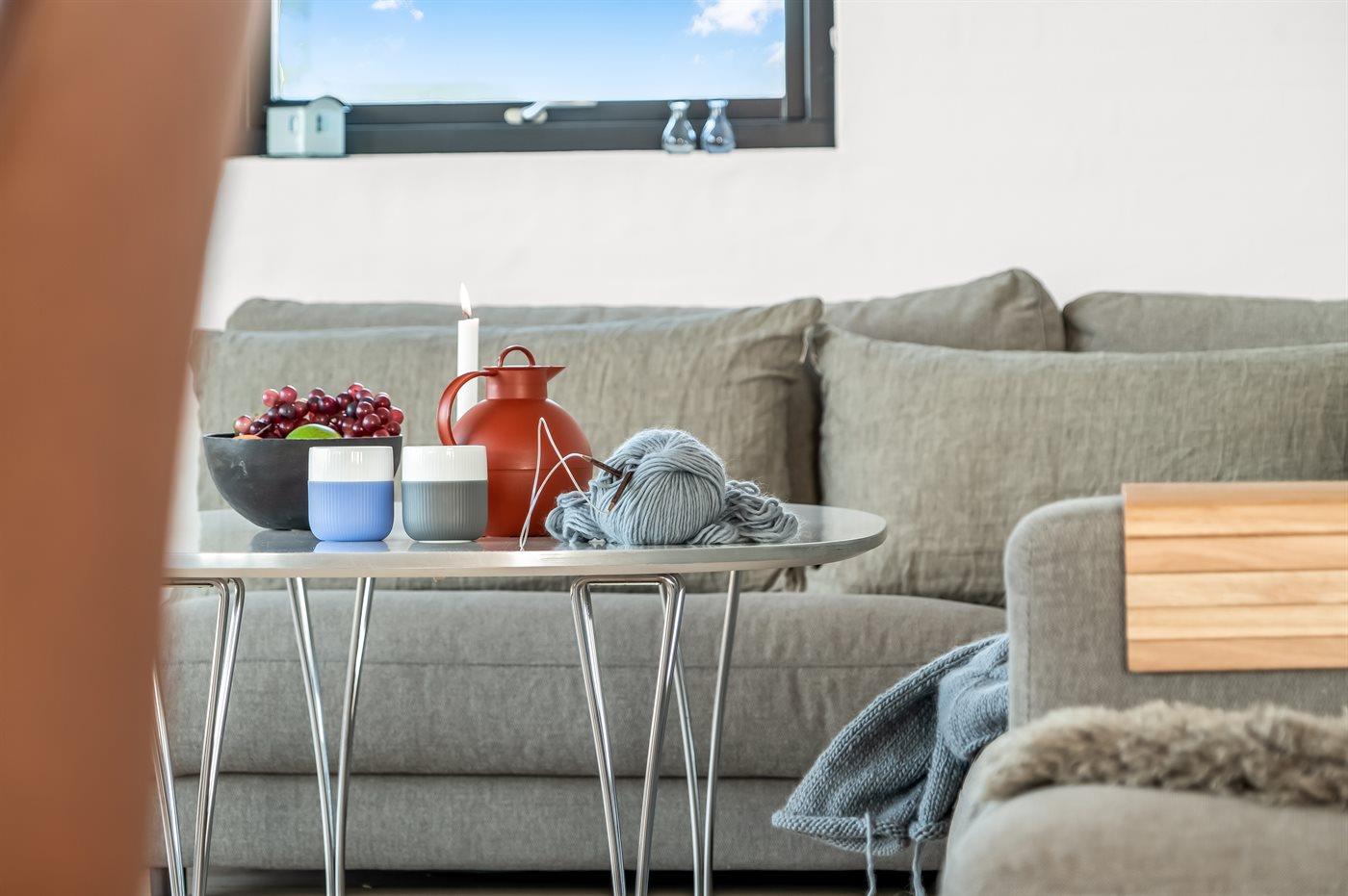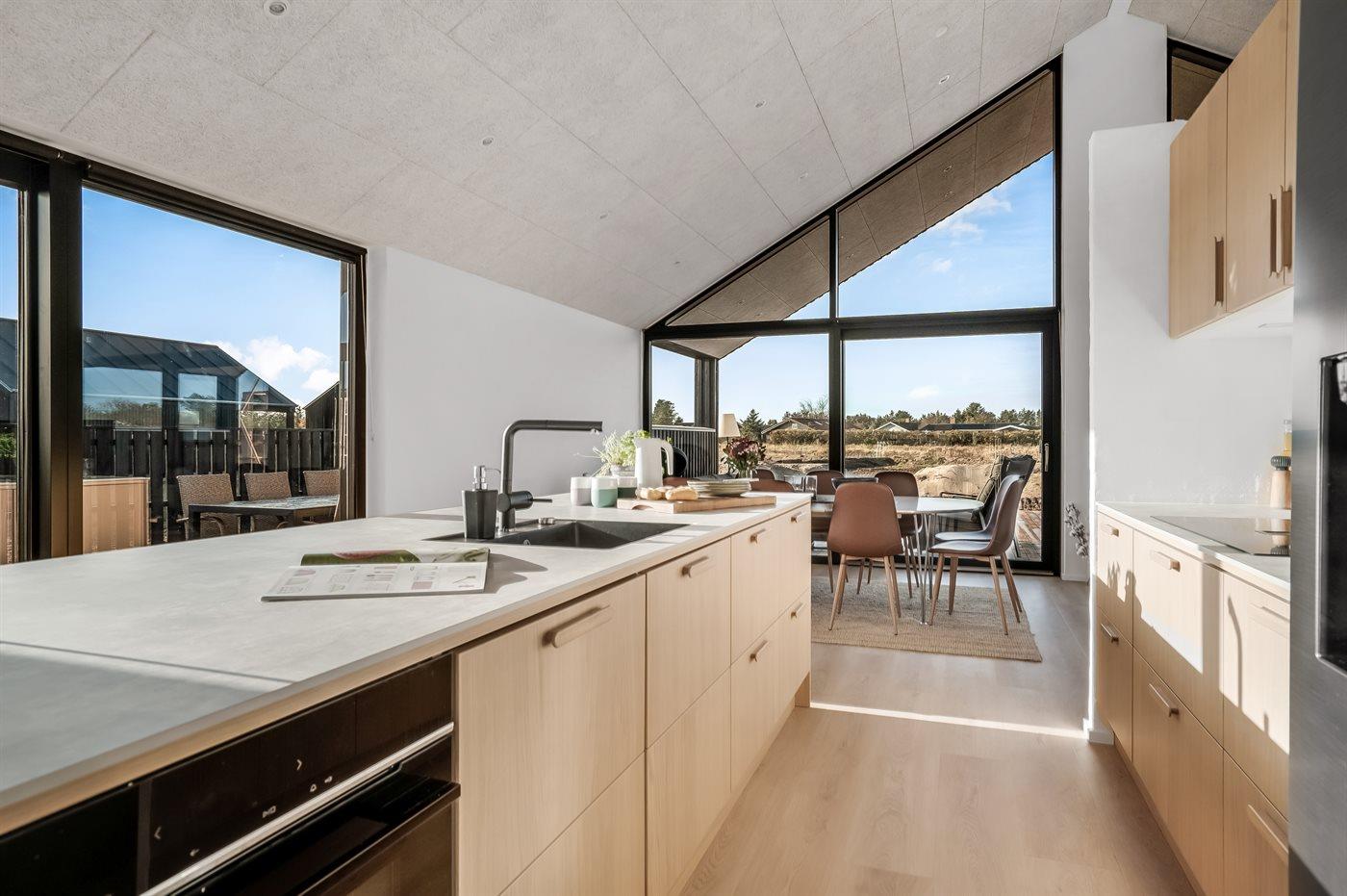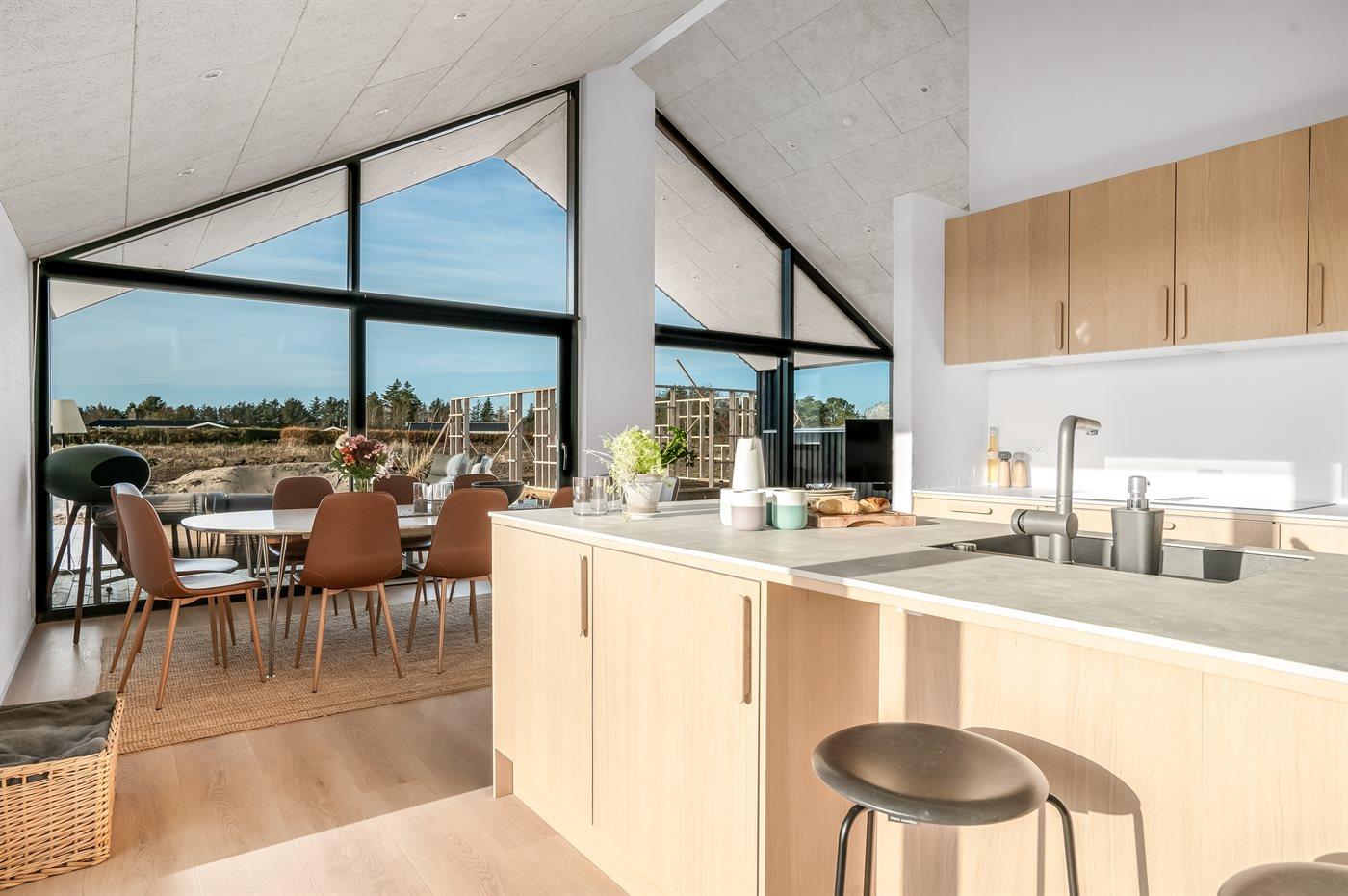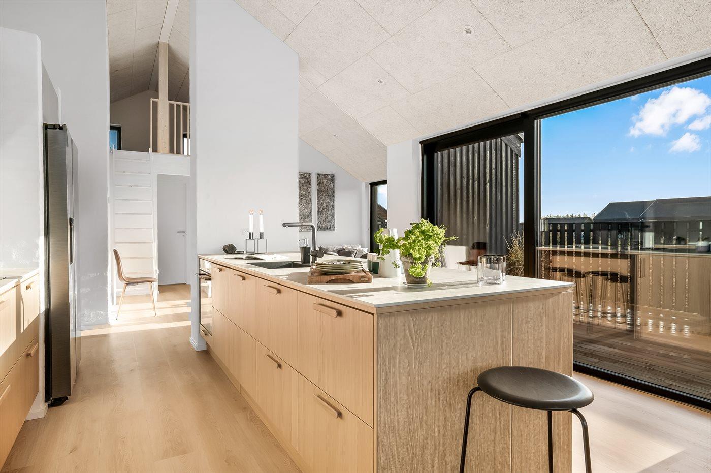 Køkkenet er udstyret med 1 køleskab. Der er 4 induktionskogeplader, varmluftovn, mikrobølgeovn samt opvaskemaskine.