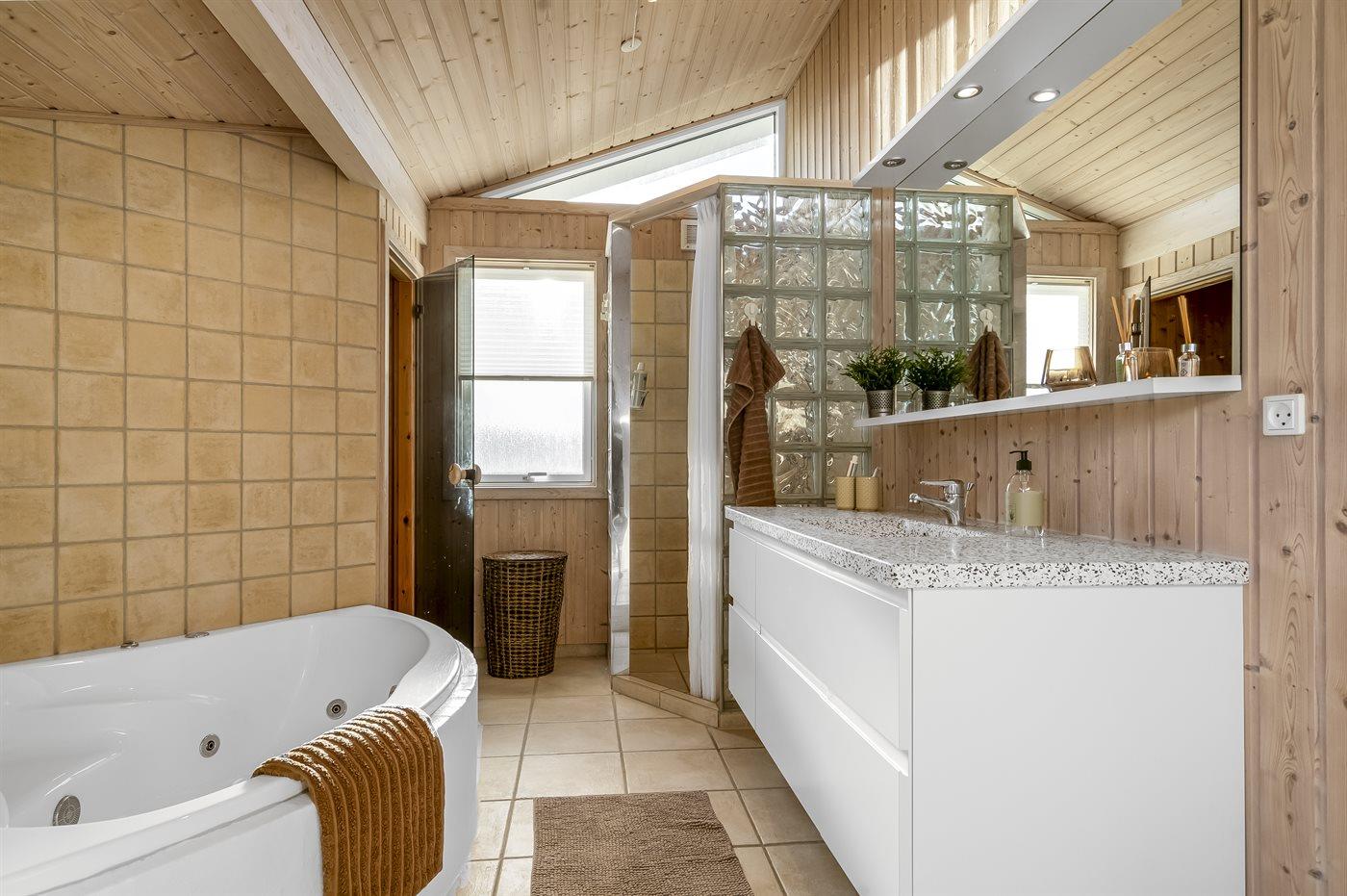 Der er 1 badeværelse med bruseniche og 2 toiletter, heraf 1 gæstetoilet. Der er gulvvarme på 1 badeværelse. Der er gulvvarme på gæstetoilettet. I saunaen er der mulighed for afslapning.