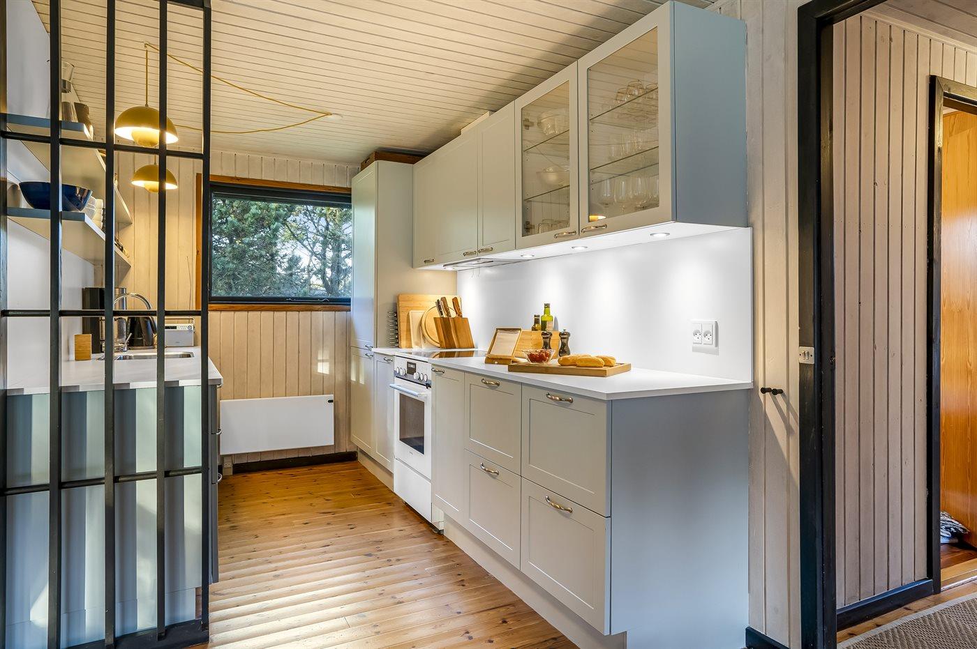 Køkkenet er udstyret med 1 køleskab. Der er 4 elkogeplader, varmluftovn samt opvaskemaskine.