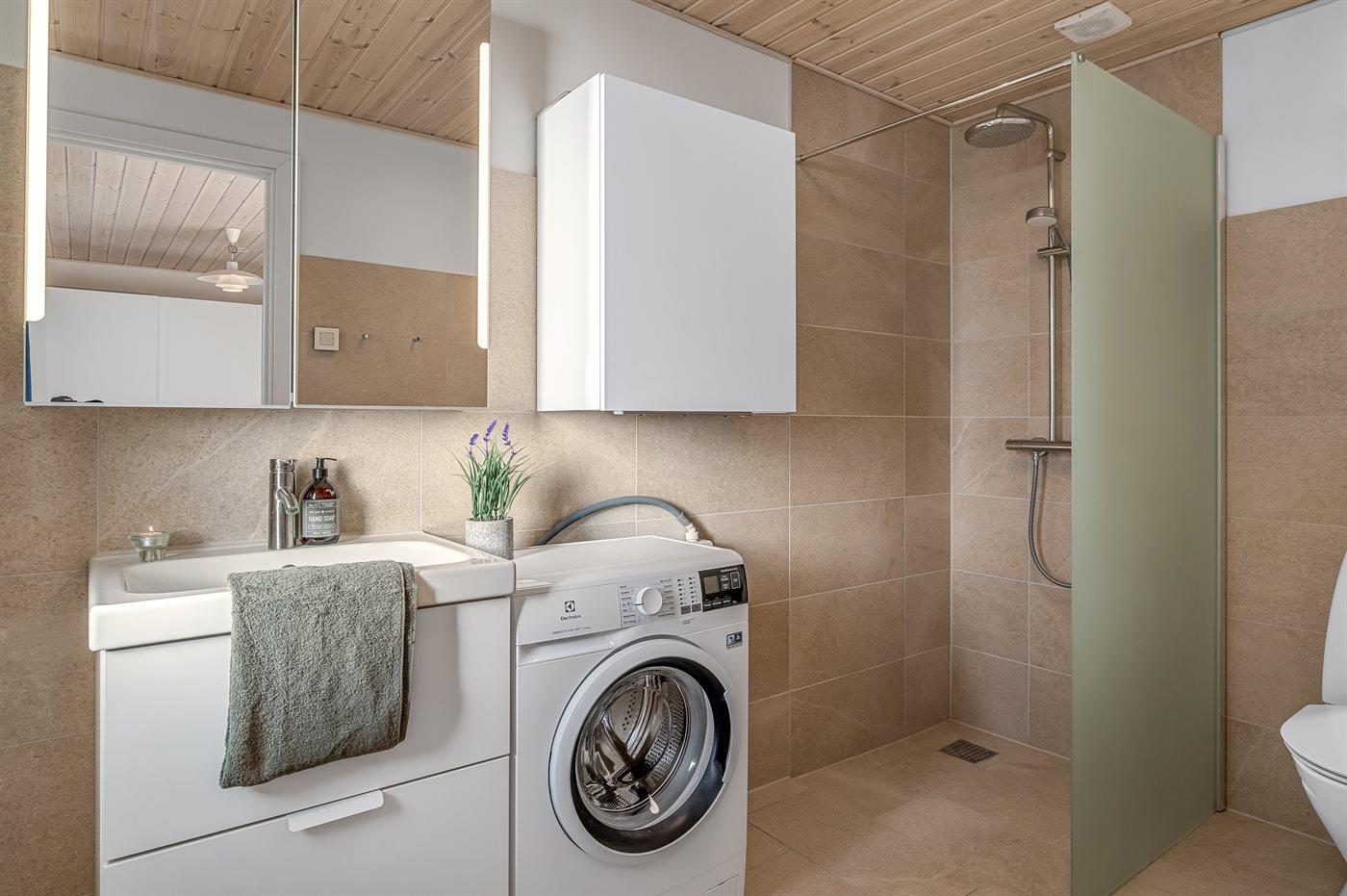 Der er 2 badeværelser med bruseniche og 2 toiletter. Der er gulvvarme på 2 badeværelser.