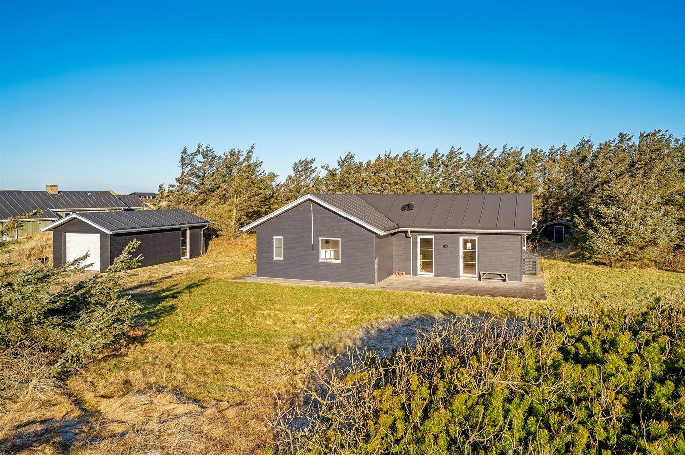 Ferieboligen er beliggende på en 3813 m² stor naturgrund. Der er 300 m til havet. Nærmeste forretning er beliggende i en afstand af 5400 m. Til ferieboligen hører åbent terrasseareal. Der er redskabsrum. Legehus. Grill til rådighed. Der er garage til rådighed. Der er installeret stik til opladning af elbil. Type 2 stik. Med 12 kW ladeeffekt. Parkering ved ferieboligen.