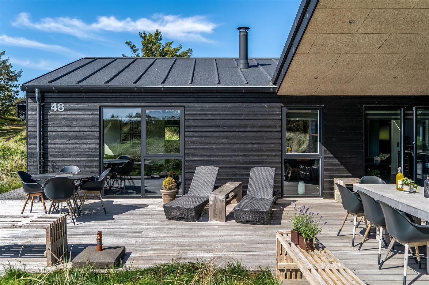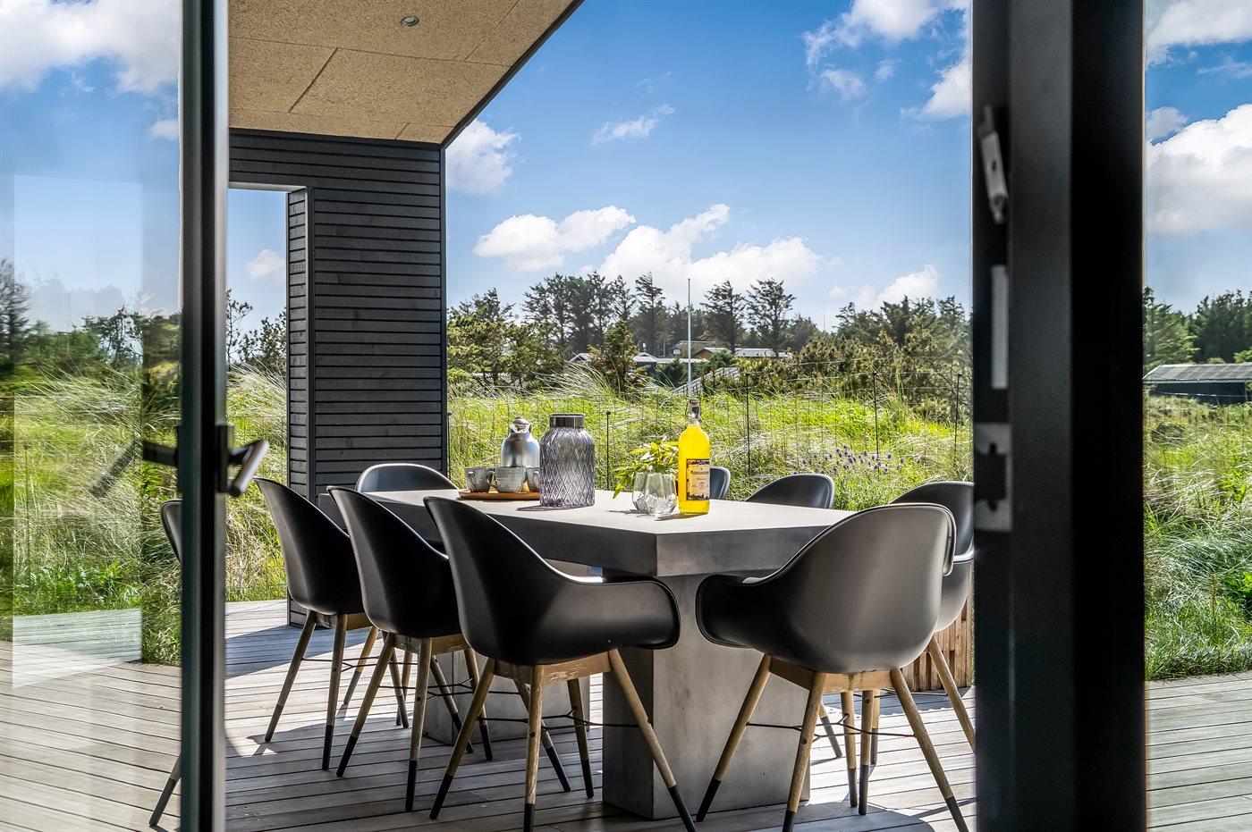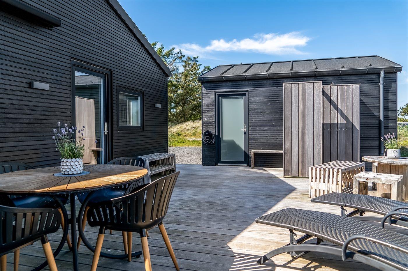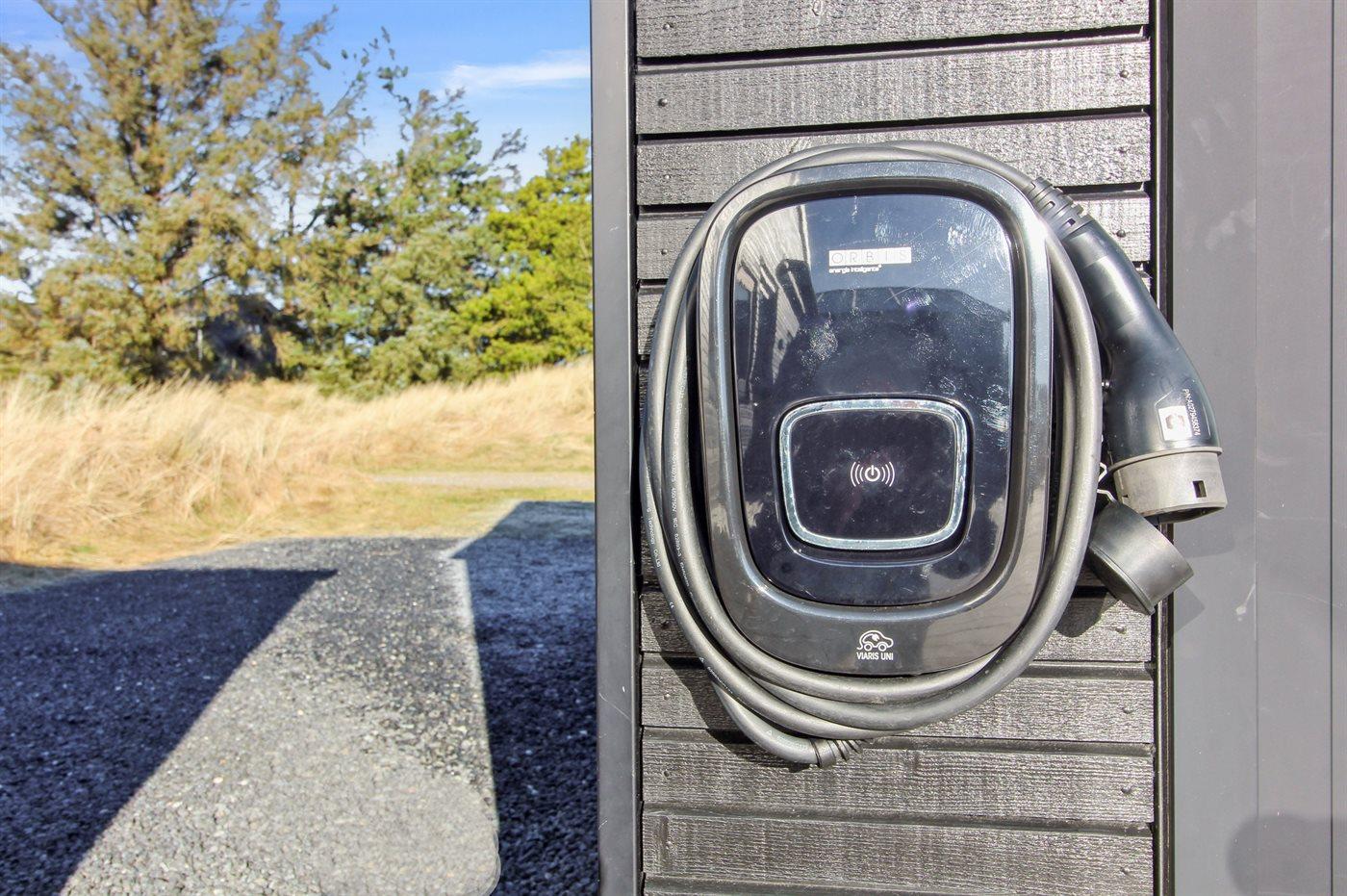 Ferieboligen er beliggende på en 1920 m² stor naturgrund. Der er 750 m til havet. Nærmeste forretning er beliggende i en afstand af 4000 m. Til ferieboligen hører åbent terrasseareal. Desuden er der overdækket terrasse. Der er redskabsrum. Udendørs bruser. Grill til rådighed. Der er installeret stik til opladning af elbil. Type 2 stik. Med 12 kW ladeeffekt. Parkering ved ferieboligen.