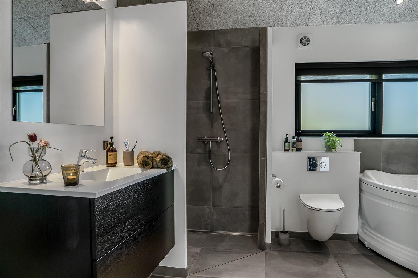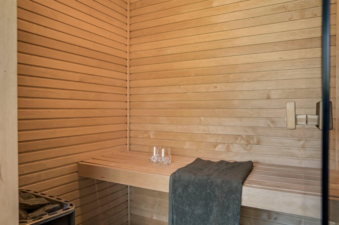 Der er 2 badeværelser med bruseniche og 2 toiletter. Der er gulvvarme på 2 badeværelser. I saunaen er der mulighed for afslapning.