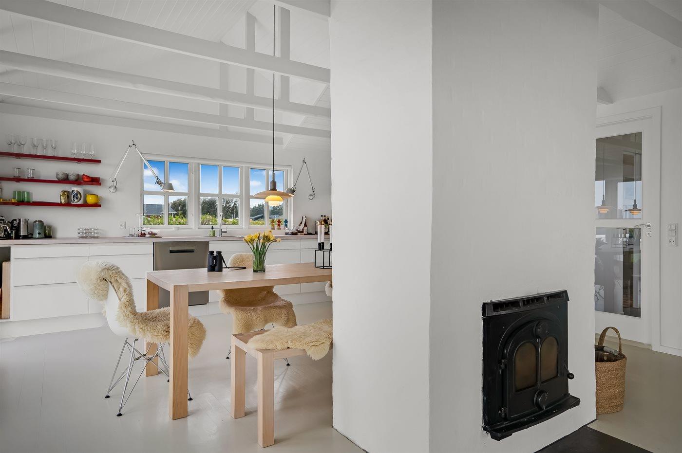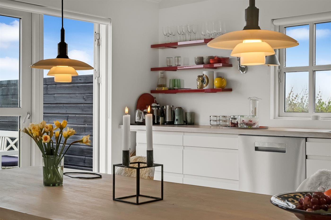 Køkkenet er udstyret med 1 køleskab. Der er 4 gasblus, varmluftovn samt opvaskemaskine.