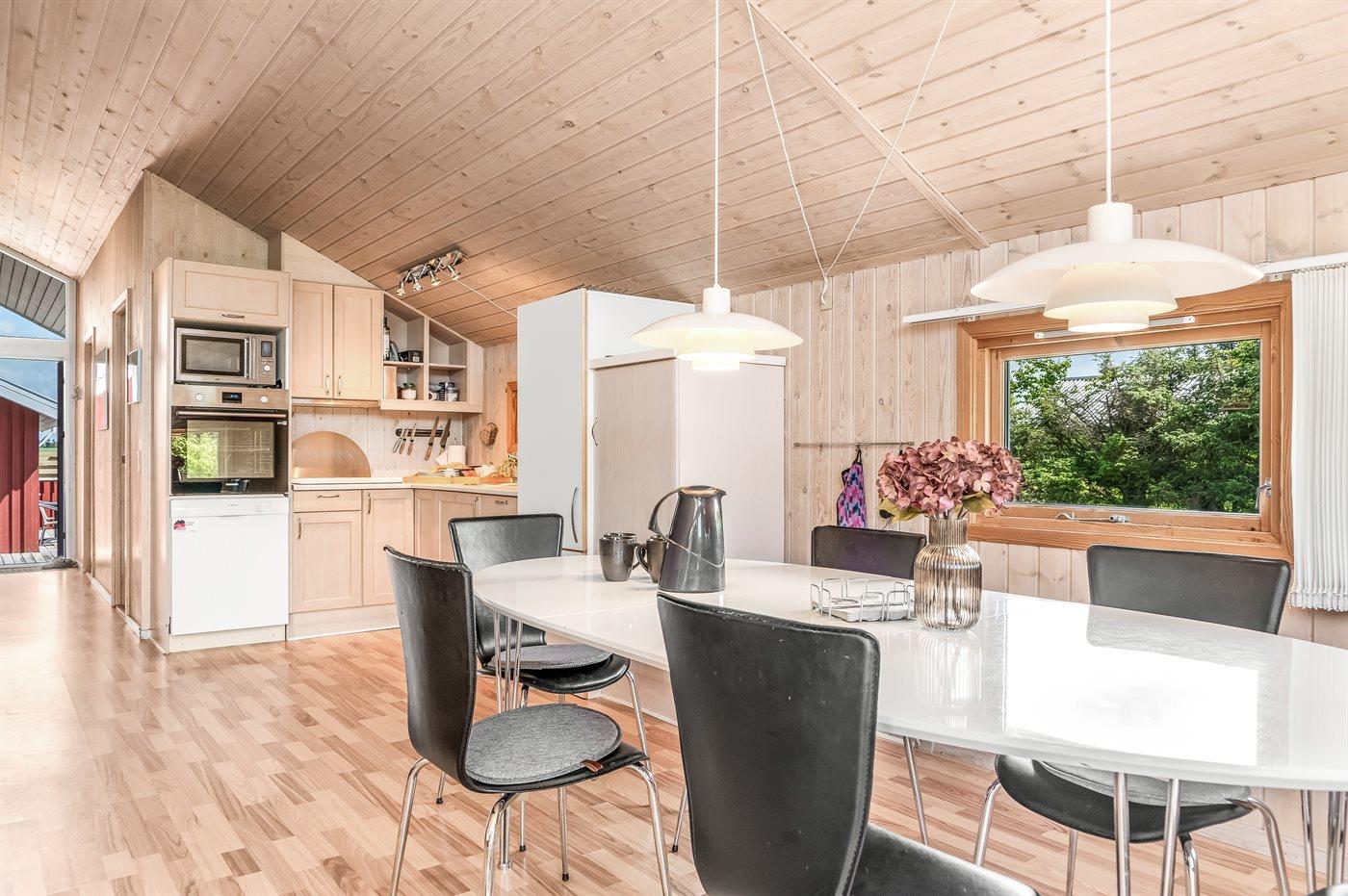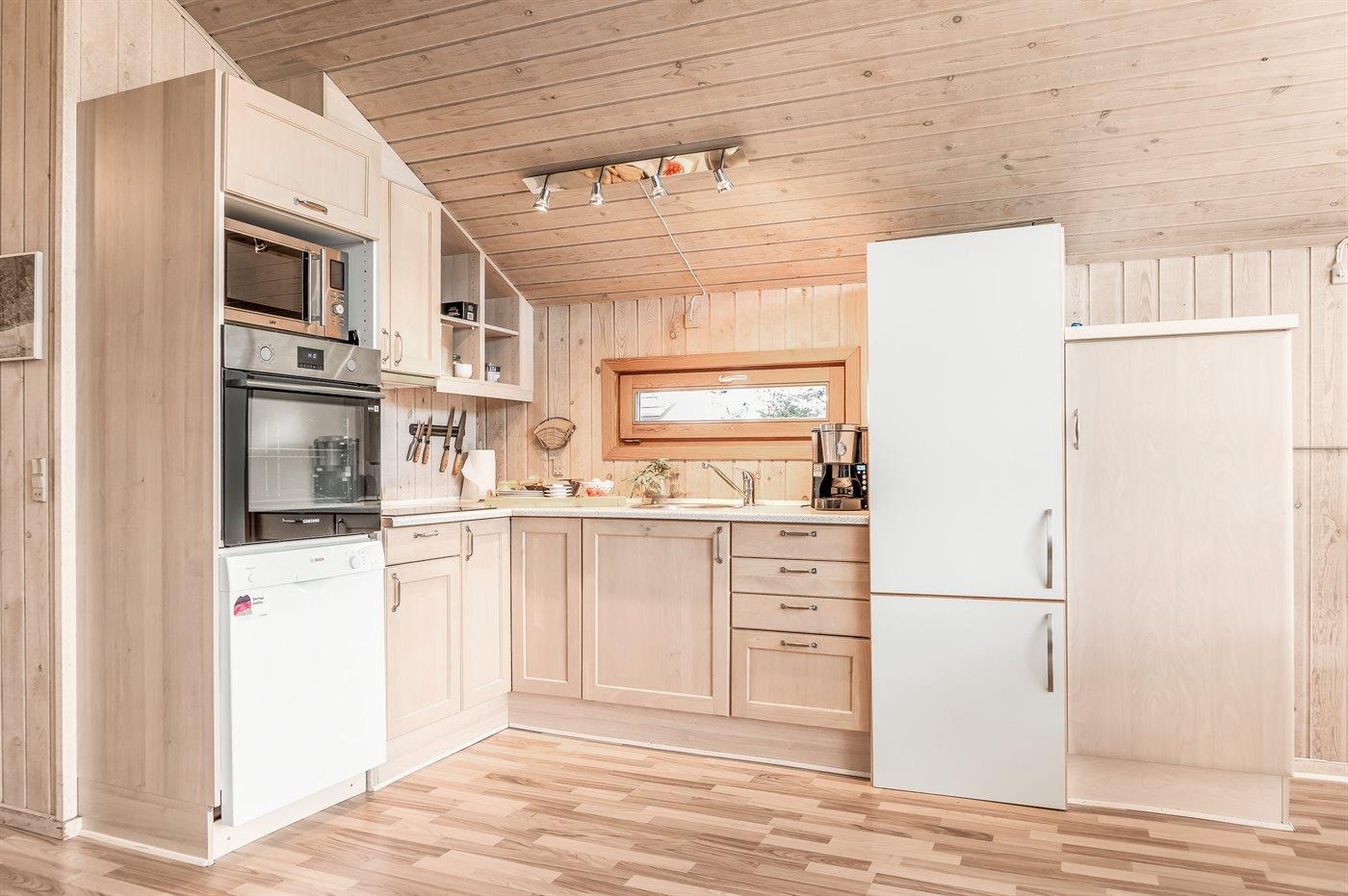 Køkkenet er udstyret med 1 køleskab. Der er 4 keramiske kogeplader, varmluftovn, mikrobølgeovn samt opvaskemaskine.
