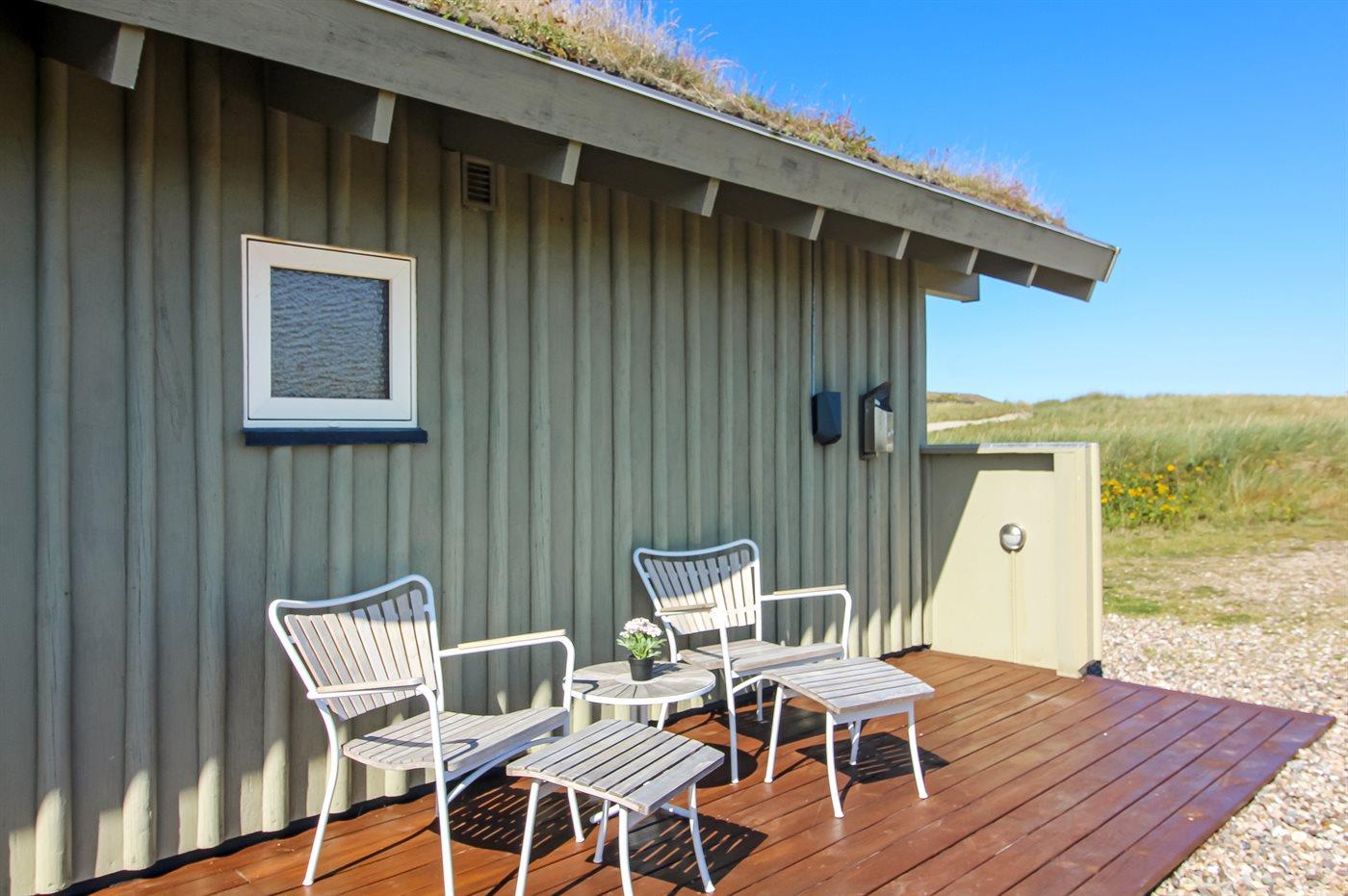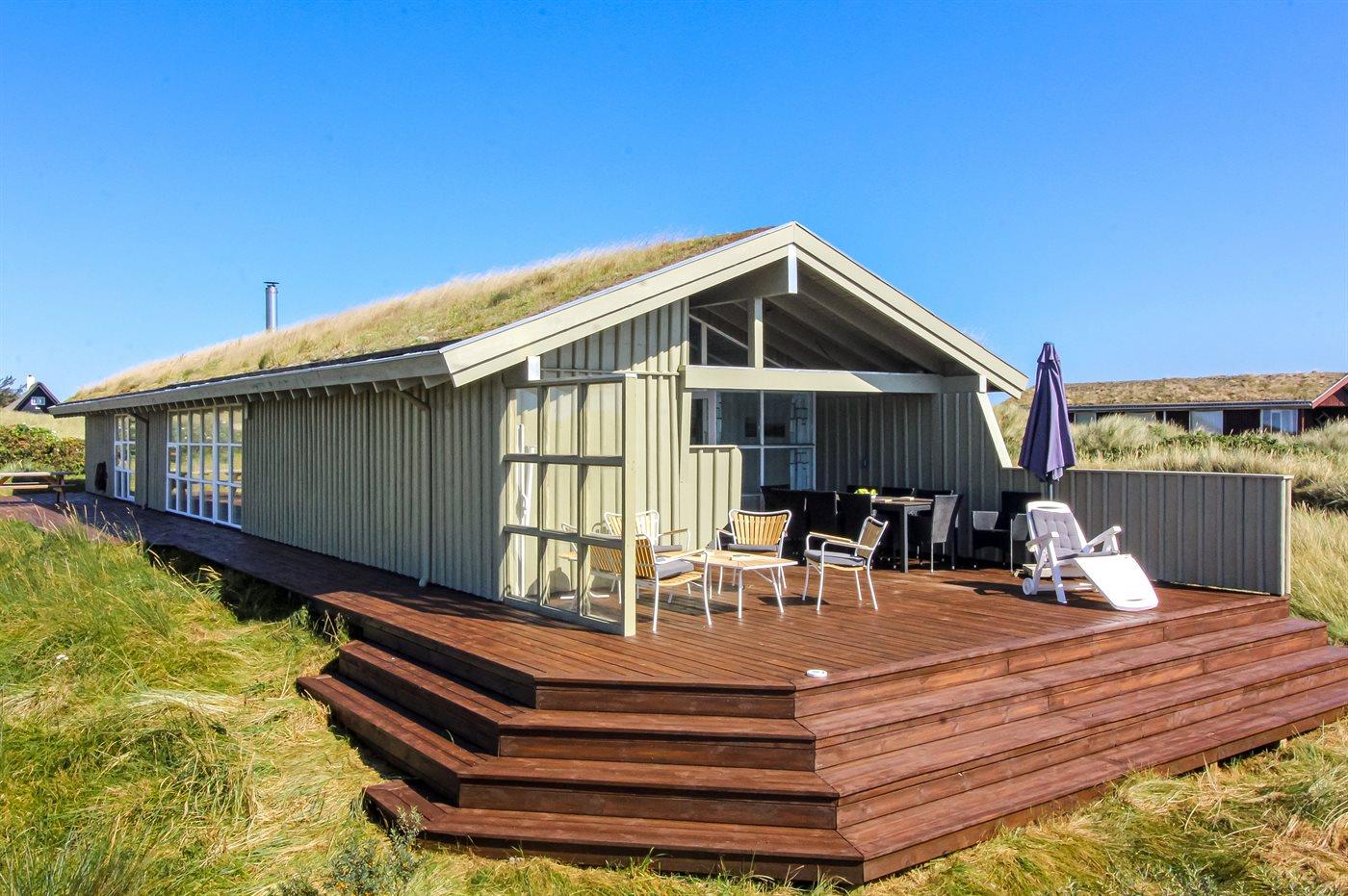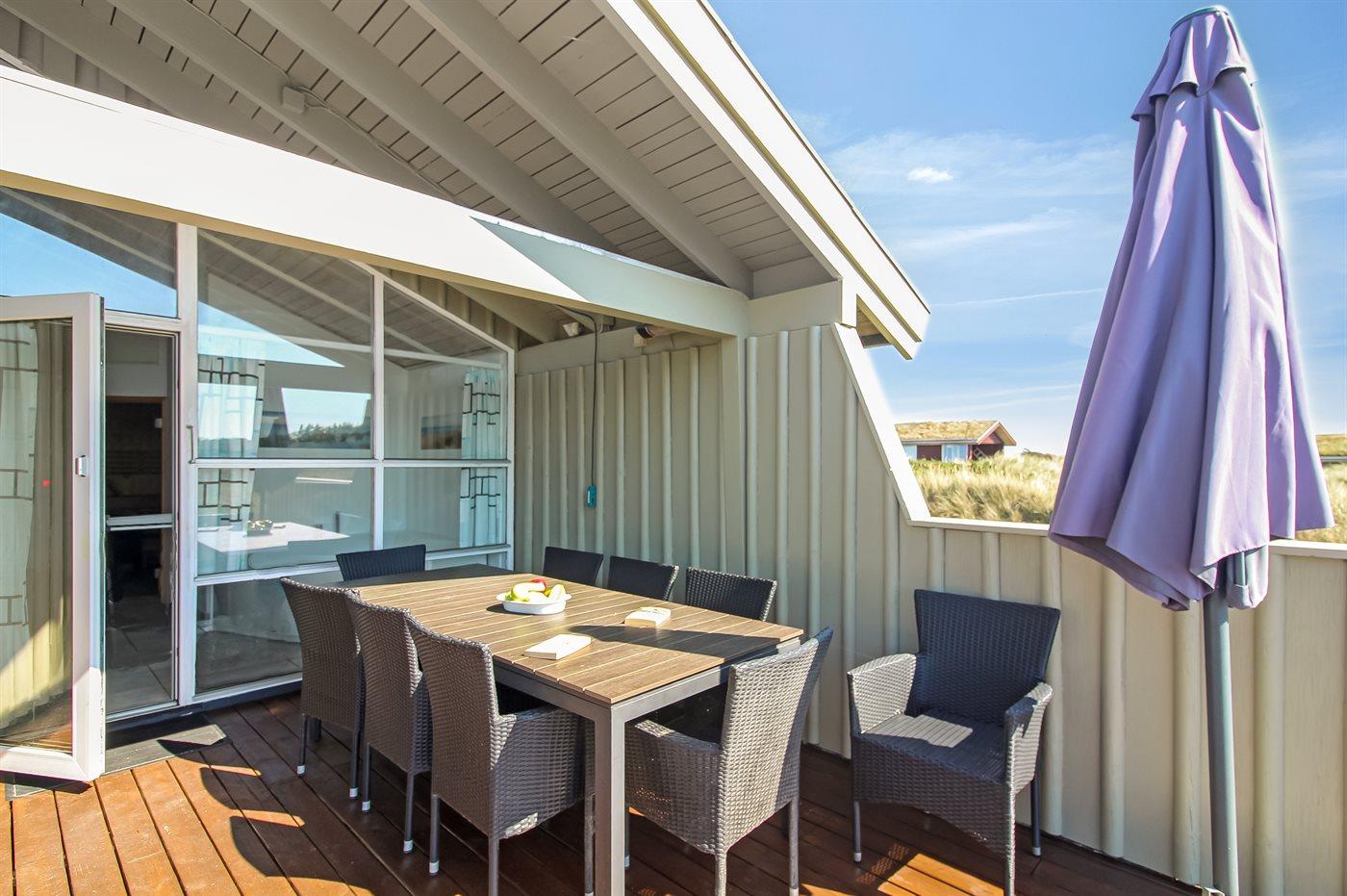 Er vejret til afslapning udenfor, i det skønne danske sommervejr, så er det bare at træde ud på den store træterrasse, som ligger som en forlængelse af huset. Her er du straks i ét med naturen og du kan nyde udsigten til det kuperede landskab, eller der er mulighed for tage et kapløb ned til Vesterhavet ad de mange stier og se hvem der vinder præmien for feriens første dukkert.