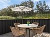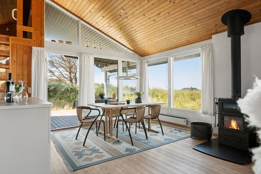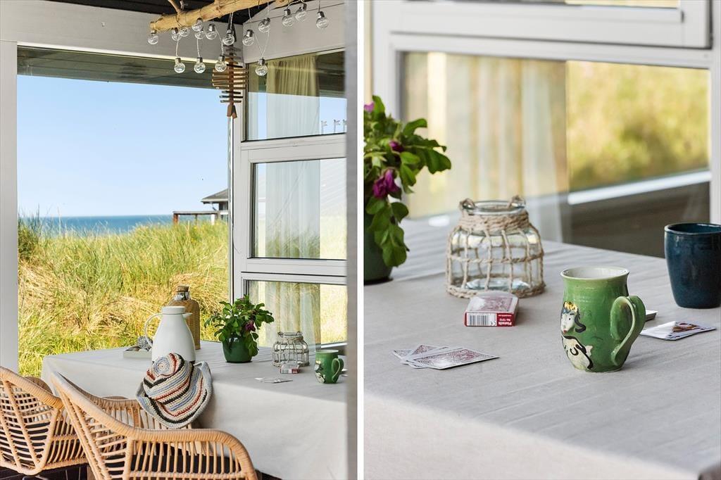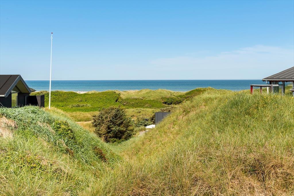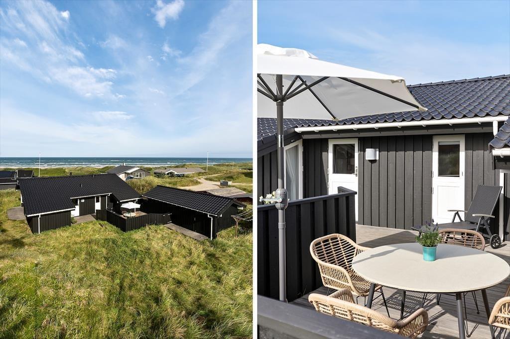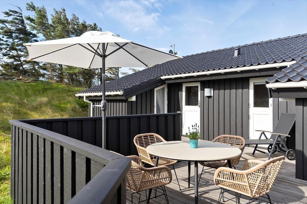 Sommerhusets overdækkede terrasse er det oplagte sted at starte dagen med morgenkaffen, mens du nyder udsigten til de bølgende klitter. Her er der plads til at finde ro i solen, læse en god bog eller samle familien til grillhygge, når dagen går på hæld. Grunden inviterer til afslappede stunder i naturens egne omgivelser, og med Vesterhavet blot en kort gåtur væk er det let at kombinere afslapning med en dukkert i bølgerne eller en frisk gåtur langs stranden.