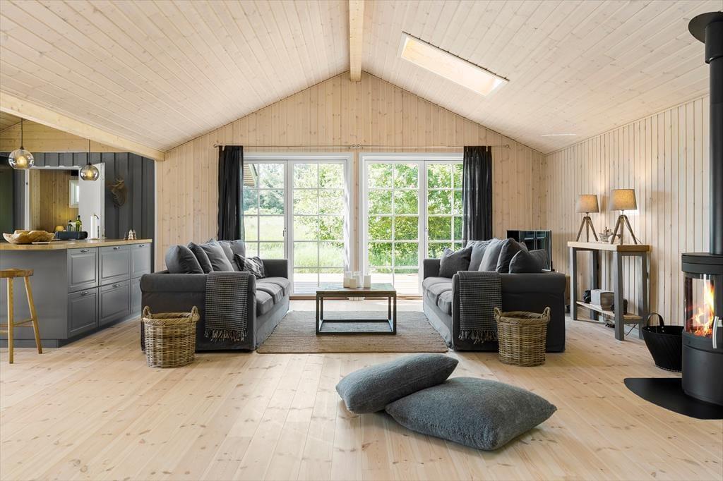 Når man træder ind i huset, bliver man mødt af lyse og rolige farver og man føler sig straks velkommen. Husets moderne køkken med alt i hårde hvidevarer, er i åben forbindelse med stuen og har desuden udgang til den hyggelige gårdhave. Stuen er rummelig med både en spiseplads til seks personer og en blødere afdeling med lænestole, brændeovn, sofa og tv. Huset er delt i to afdelinger og gør, at det er perfekt for to familier eller to par, som ønsker at tilbringe lidt kvalitetstid sammen. I sammenhæng med stue og køkken, er to værelser samt bad og toilet og i den anden del af huset, er ét værelse med direkte adgang til eget bad.