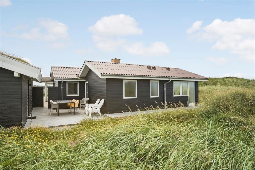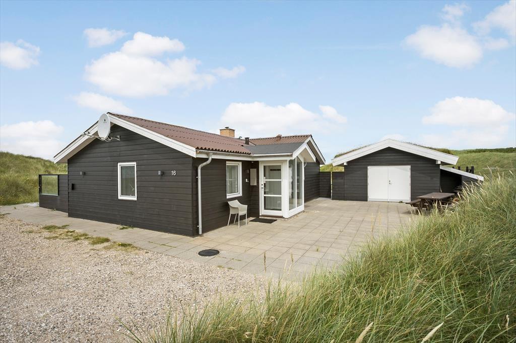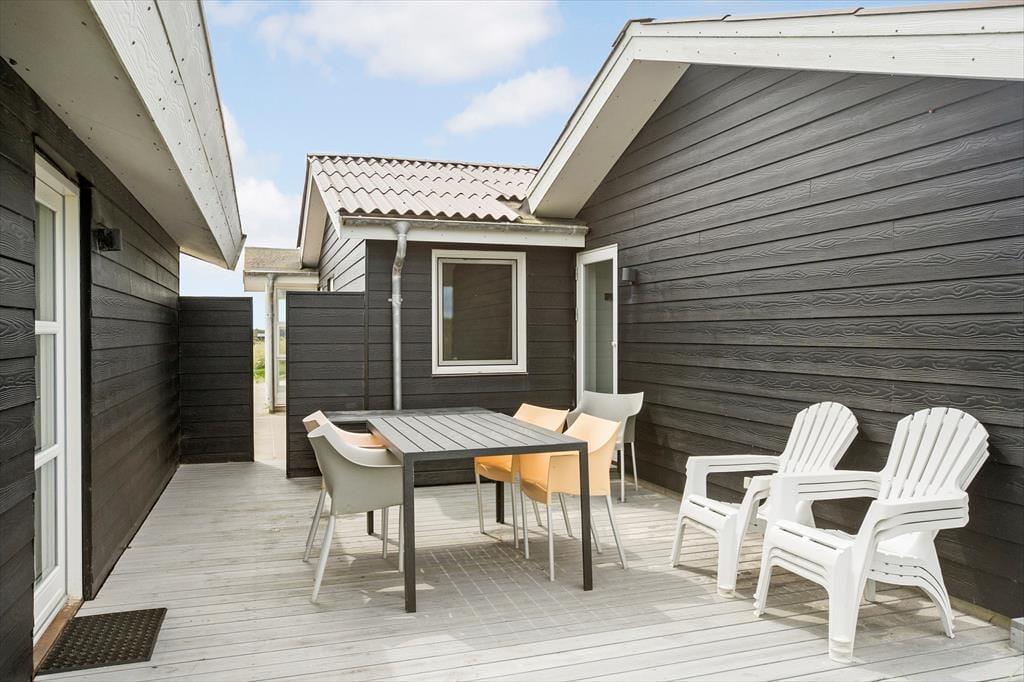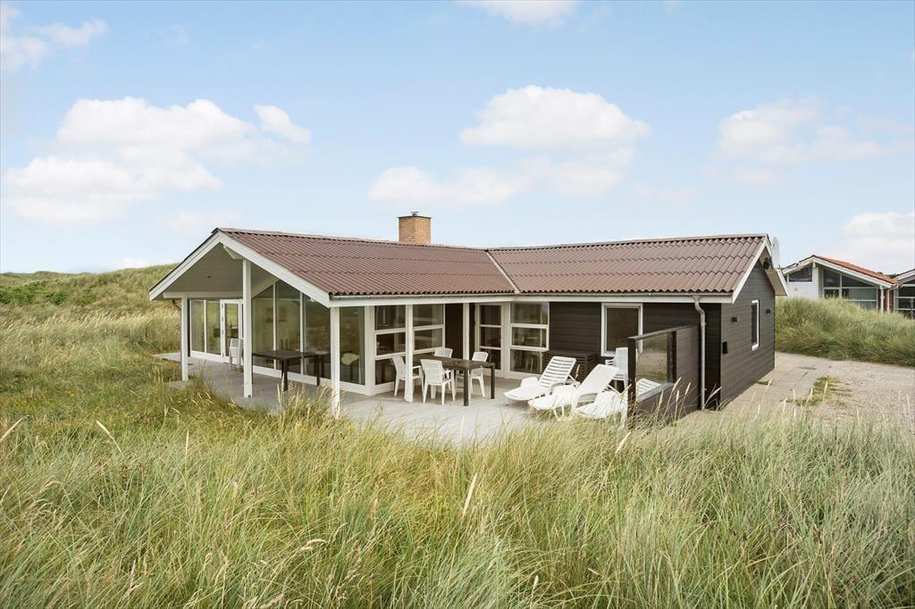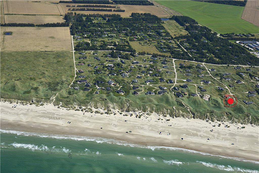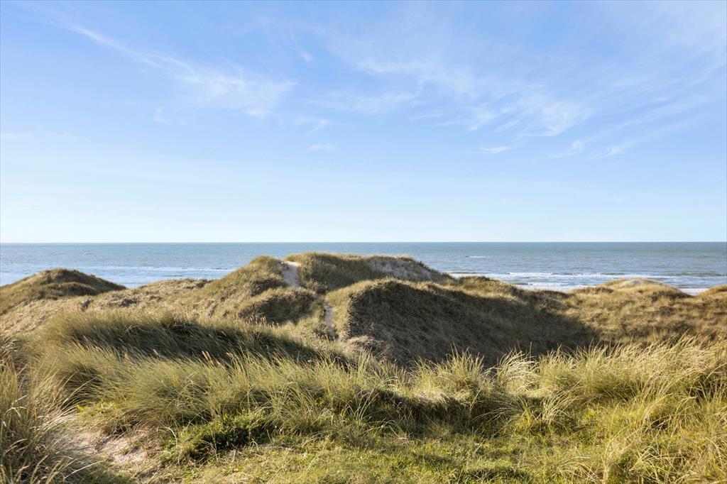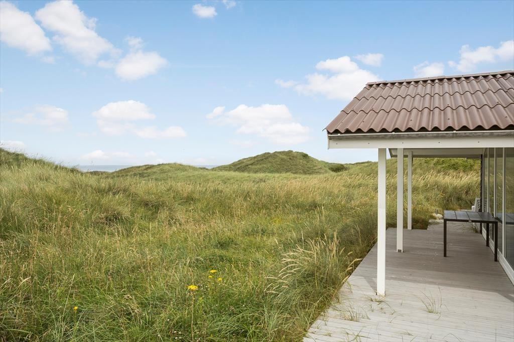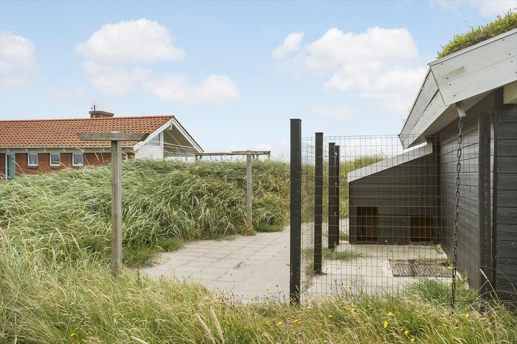 Man har kun 50 meter til strandkanten fra sommerhuset, og de forceres hurtigt via den private sti; morgen- og aftendukkert er næsten obligatoriske med den korte afstand! Huset er placeret på en 2736 m2 stor naturgrund og der er anlagt et flot terrasseareal, med en god overdækket del mod vest, som egner sig perfekt til grillhygge og solnedgange. Terrasserne vender til flere verdenshjørner, så det er altid muligt at finde en plads i solen eller i læ for Vestenvinden, som ofte kan være frisk, når man befinder sig så tæt på Vesterhavet. Der er naturligvis terrassemøbler, liggestole og grill til rådighed. Ved huset er der en hundegård, hvor der er 2 indbyggede sovepladser til hundene.