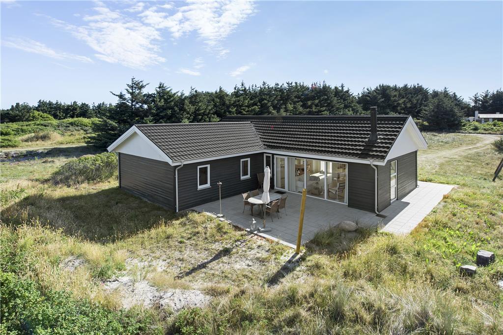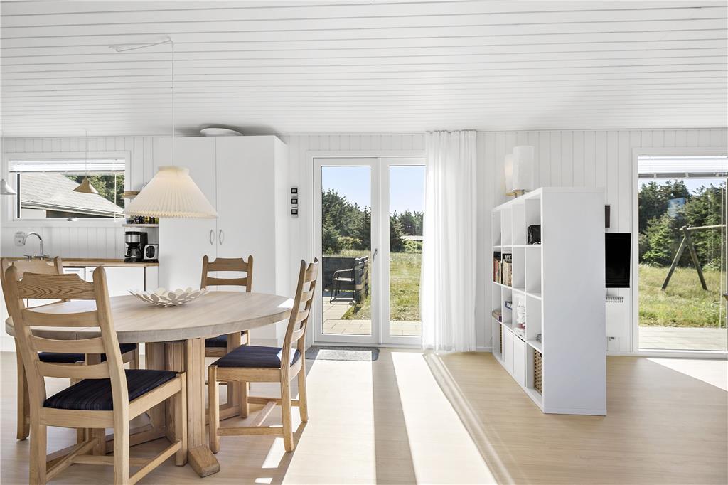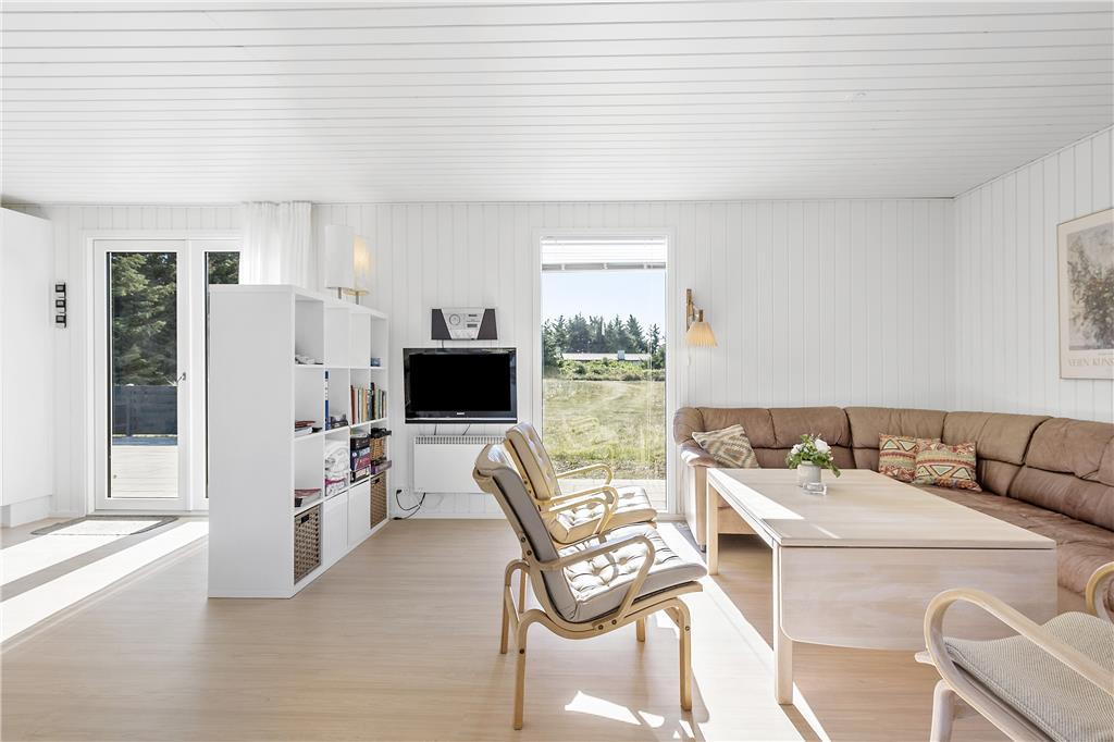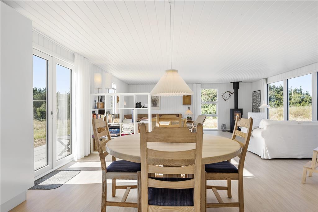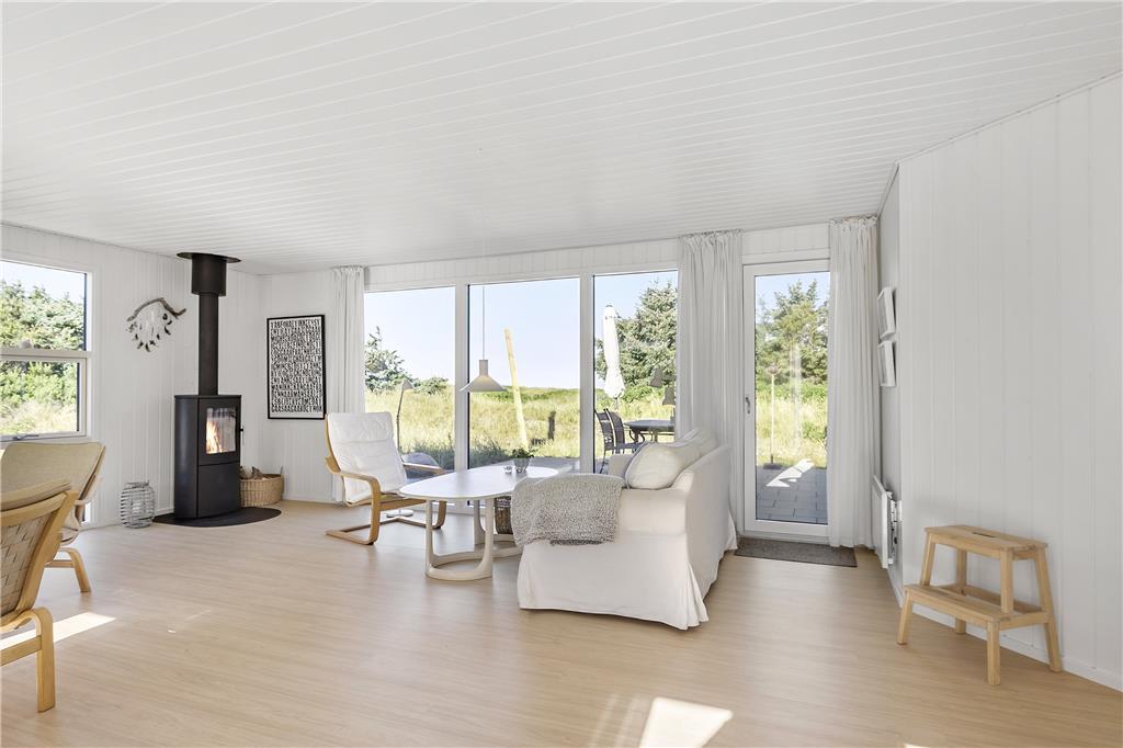 Dette sommerhus er veludstyret med en masse gode rammer og faciliteter samt trådløst internet, her mangler ikke noget. Indretningen og interiøret er holdt i en klassisk og charmerende stil med masser af lys fra de store vinduespartier i det åbne opholdsrum. Sommerhuset er velegnet til både familier og par, med 4 soveværelser og med to badeværelser behøver man ikke vente på hinanden om morgenen. Midt i opholdsrummet står en brændeovn, som hurtigt spreder varme og hygge på de kolde dage, mens man om sommeren kan træde ud på de åbne terrasser som omkranser huset. Hele sommerhuset byder på virkelig gode forhold for både voksne og børn!