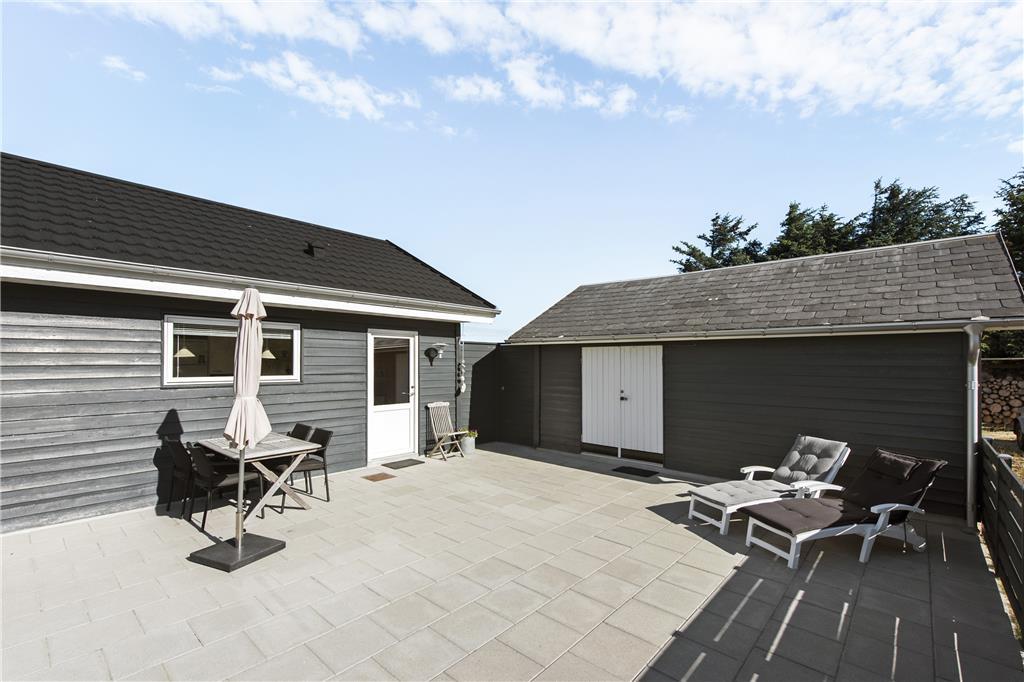 Naturgrunden er omgivet af høje træer, som giver godt med læ for Vestenvinden, og foran terrassen er også lavet et lille læhegn. Der er masser af plads til at lege og tumle og derudover en gynge og bålplads til glæde for både børn og voksne. Den flotte stenterrasse løber på øst, vest og sydsiden af sommerhuset, så man kan fange solen hele dagen lang, og om aftenen kan man sidde ude og nyde et dejligt måltid mad tilberedt på grillen.
