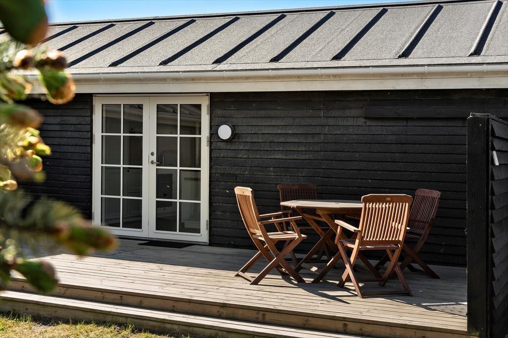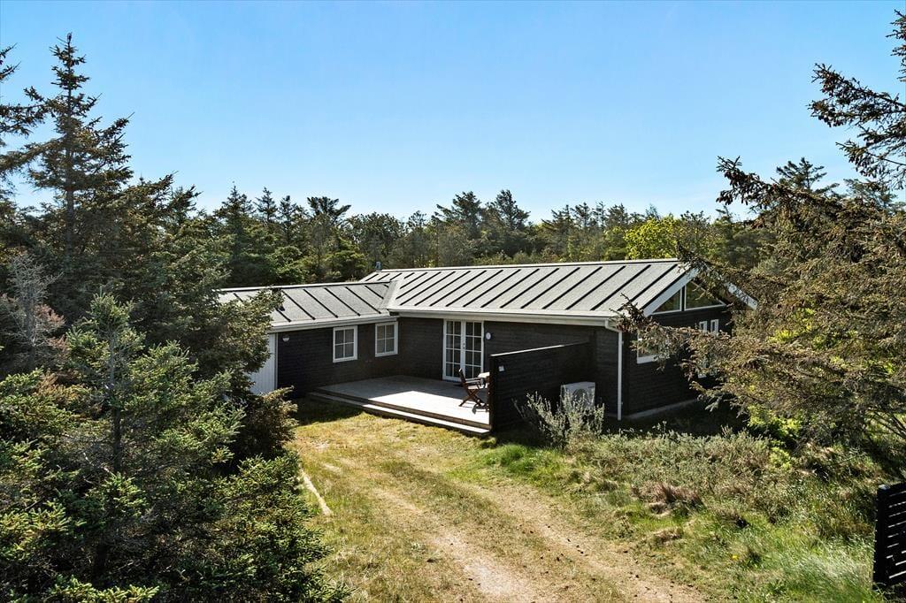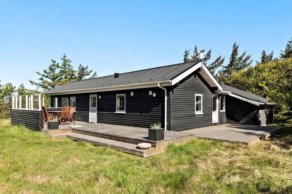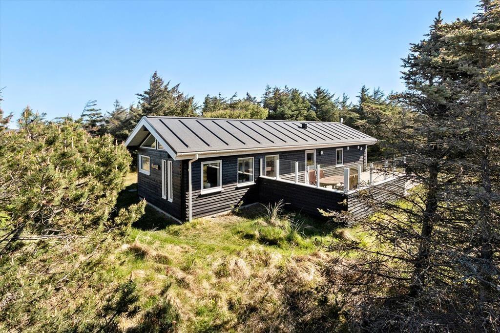 Drømmer I om at tilbringe jeres ferie i naturskønne omgivelser? Så skal I endelig se nærmere på dette dejlige træsommerhus, der ligger i det flotte og fredelige ferieområde Grønhøj få hundrede meter fra Vesterhavet.