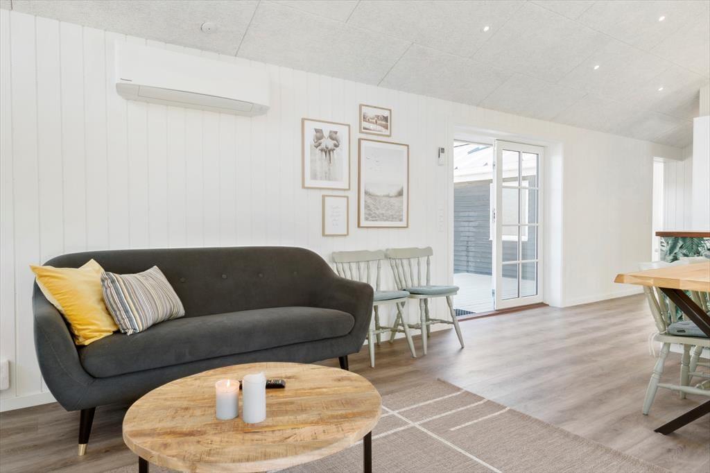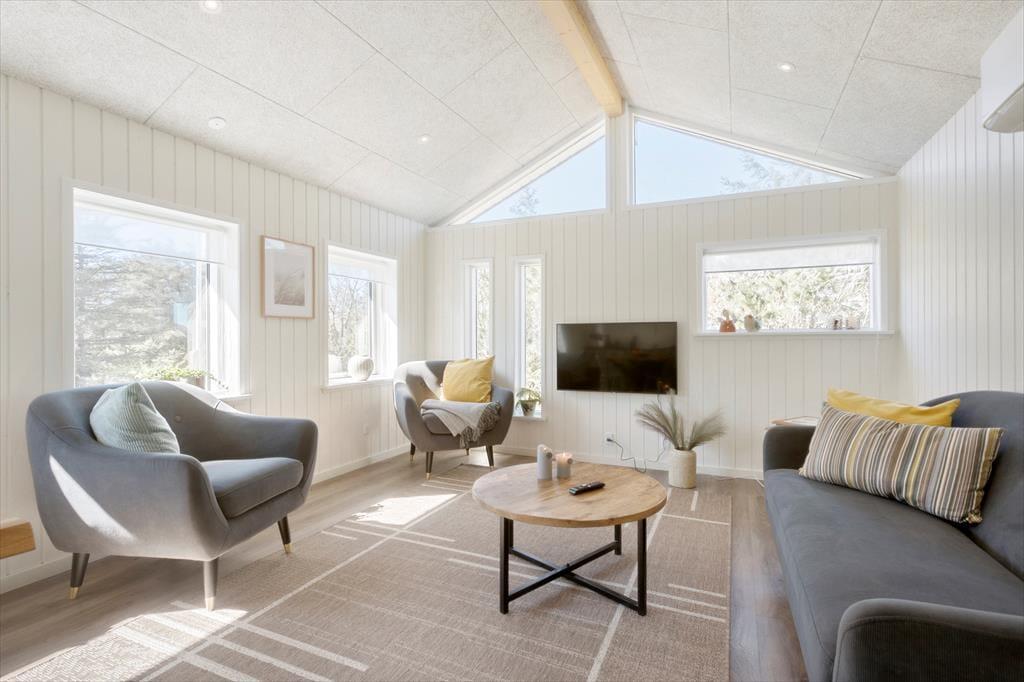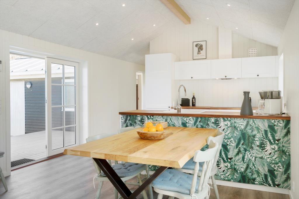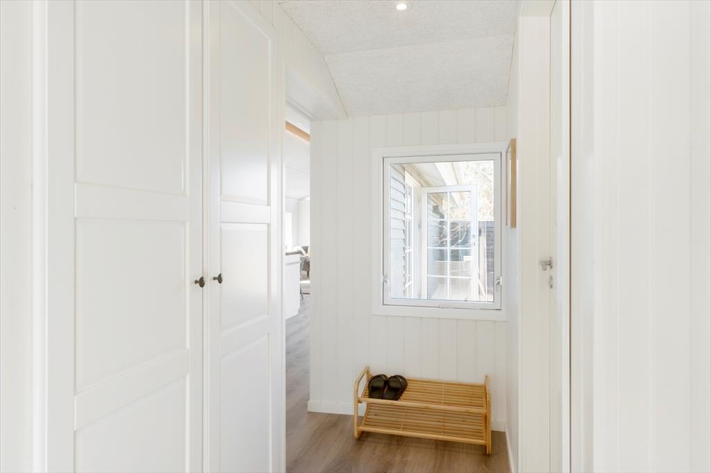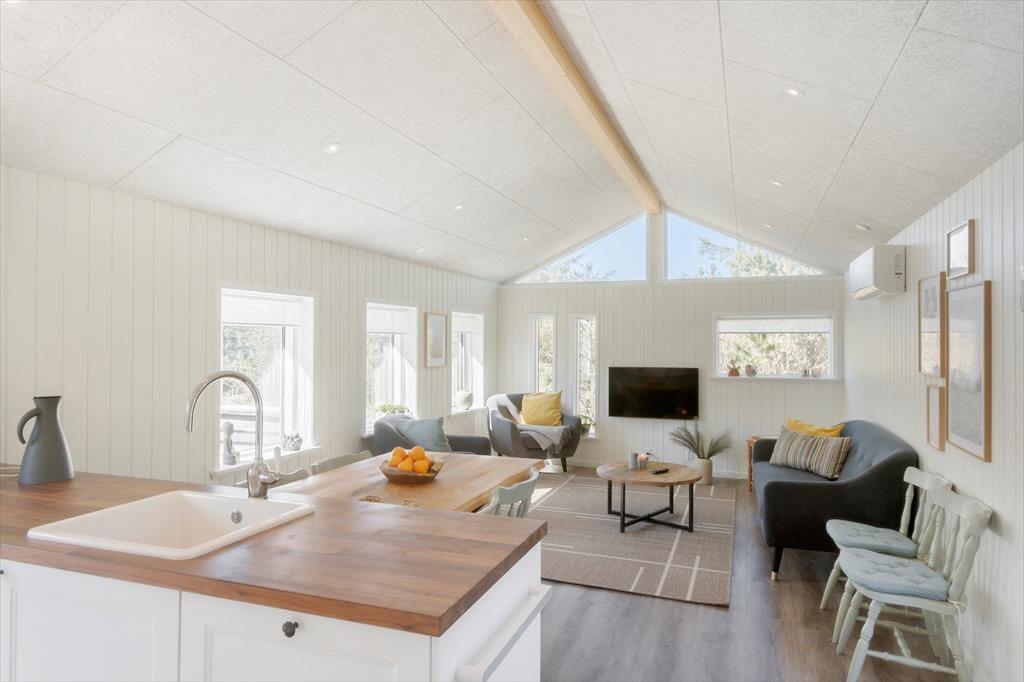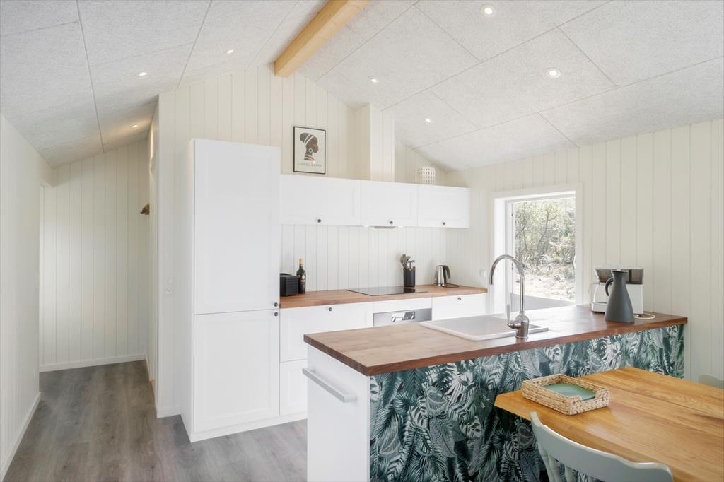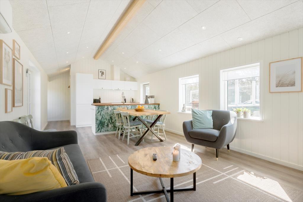 Selvom det er skønt at være mest muligt ude i den friske havluft, er det også vigtigt at have en god og hyggelig base på ferien. Og det er lige præcis, hvad dette sommerhus er, for det præsenterer sig nemlig på lys og venlig vis efter seneste renovering i 2021. Med tre soveværelser, et badeværelse og en dejlig stue med integreret køkken egner planløsningen sig godt til fem personer. Det er hyggeligt at stå og kræse om maden i det åbne køkken, imens resten af familien spiller brætspil ved spisebordet eller slapper af i sofaafdelingen. Og uanset hvor I opholder jer, har I udsigt til naturgrunden gennem vinduerne – det er en dejlig påmindelse om, at I befinder jer langt væk fra hverdagens trummerum.