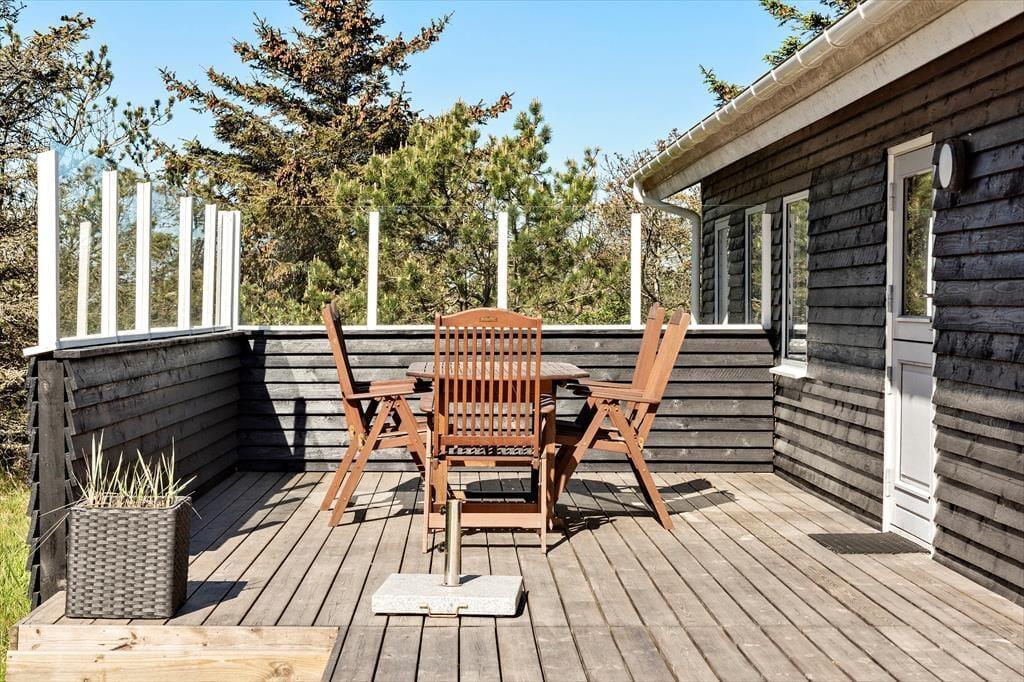 På den 2.500 m2 store naturgrund ligger tre terrasser godt fordelt rundt om sommerhuset, så I får nemt ved at finde en siddeplads i solen. På terrasserne er der havemøbler, liggestole, grill og parasol til rådighed, og på grunden finder I også en udendørs bruser, så I kan skylle jer, når I vender hjem fra strandturen.