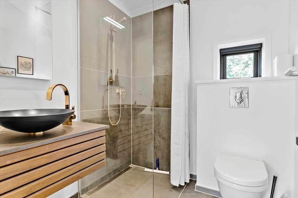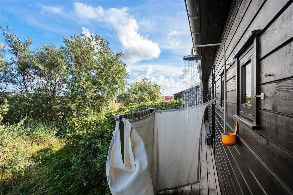 Når vejret er godt, kan en stor del af dagen oplagt udspille sig i det fri på den 2130 m2 store grund. Selv morgenbadet kan foregå under åben himmel takket være den udendørs bruser, og med terrasser vendt mod øst, syd og vest kan I slappe af i solen dagen lang. Om aftenen kan I grille eller slænge jer i loungemøblerne på den overdækkede terrasse, hvis ikke I vil bruge den sidste energi på at spille havespil på græsplænen. Værd at bemærke er for øvrigt, at grunden som en af de eneste her på Kringelbækvej har godt opvokset beplantning, der giver læ og skærmer udearealerne af.