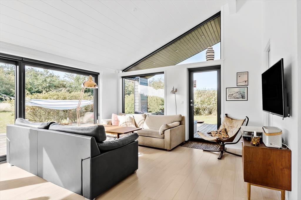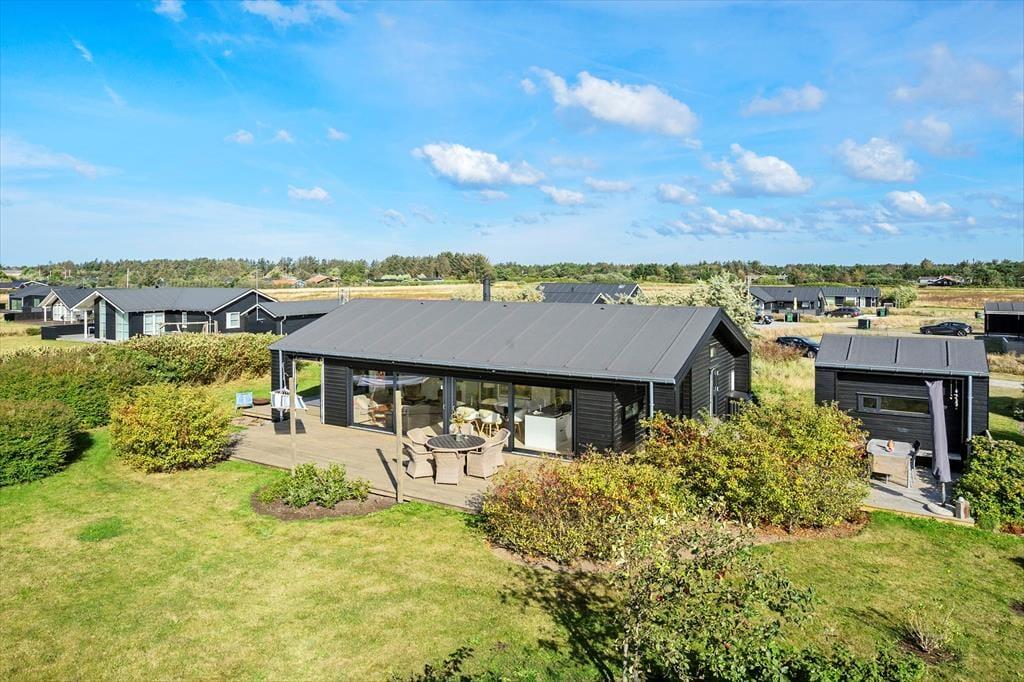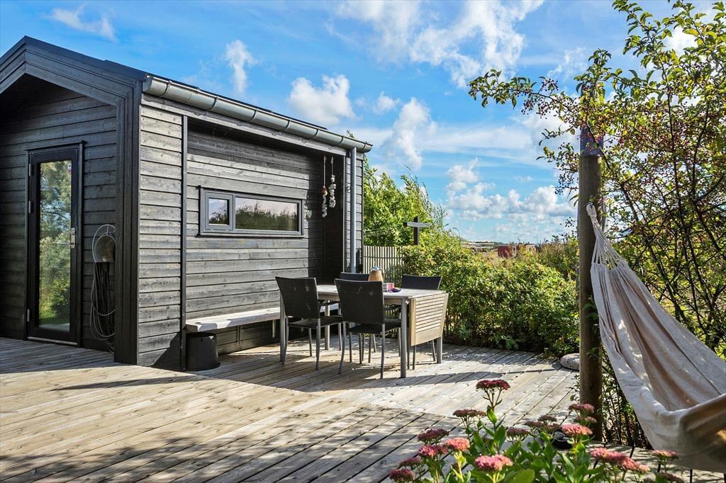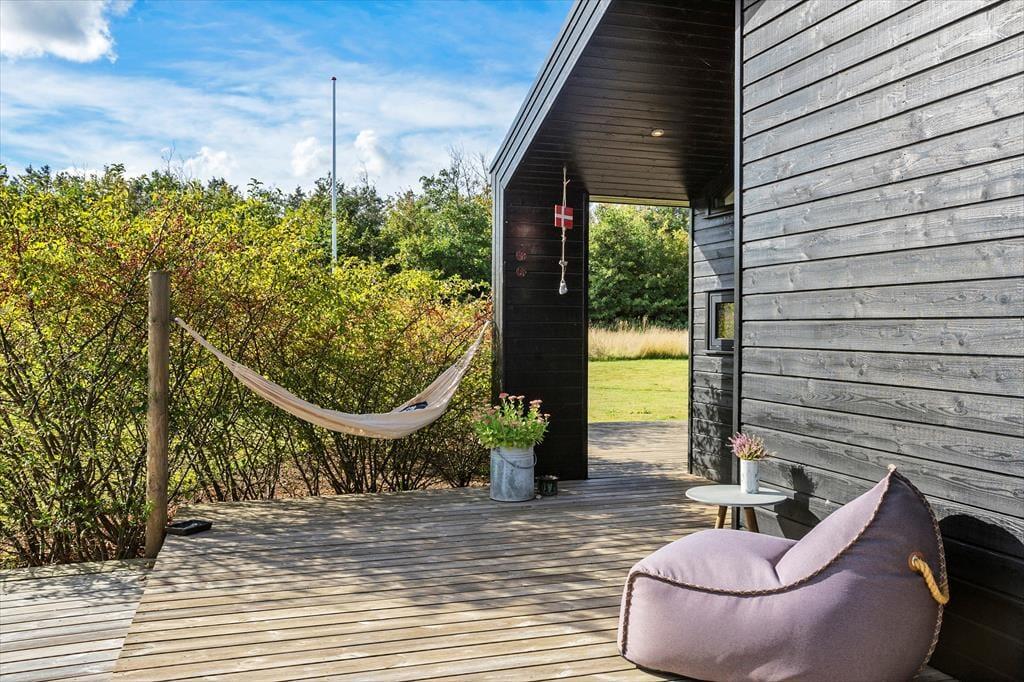 Det er herligt at holde ferie i Grønhøj ved Vesterhavet – ikke mindst når det foregår i dette velindrettede sommerhus, der er opført i 2015 og har en superskøn atmosfære. Udearealerne er anlagt, så I har mange gode terrasser og hyggekroge at vælge imellem, når I altså ikke hellere vil ud for at opleve det naturskønne lokalområde.