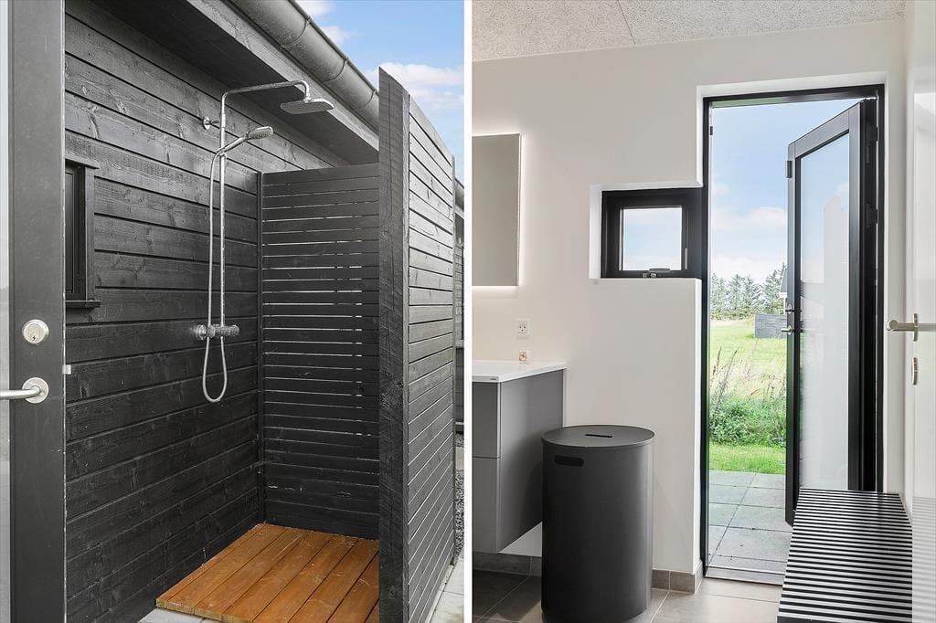 Hvis I holder ferie på de mere lune tider af året, kan I få stor glæde af sommerhusets udearealer. Grunden måler hele 2167 m2, og den har en skøn græsplæne til leg og havespil, mens det store terrasseareal indbyder til tilbagelænede dasedage med grillmåltider, krimilæsning og kølige drinks. Der er to overdækkede områder, hvis I får brug for at sidde i ly for regnen, og hegnet skærmer jer for vind og giver privatliv. En udebruser er placeret ved huset, og på grusarealet har I gode parkeringsforhold.