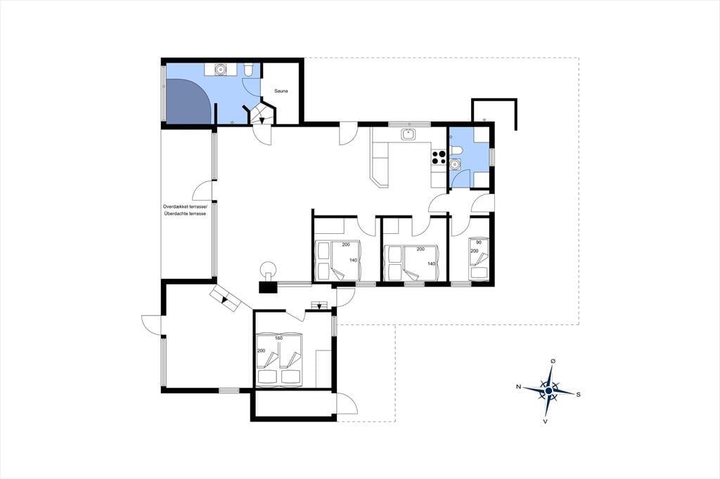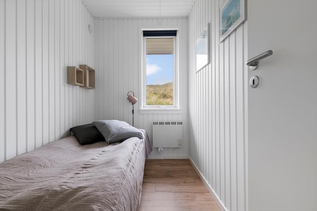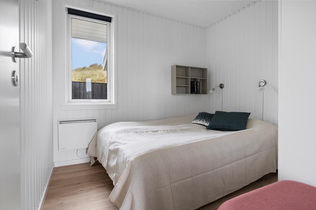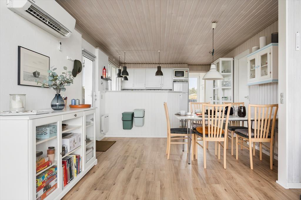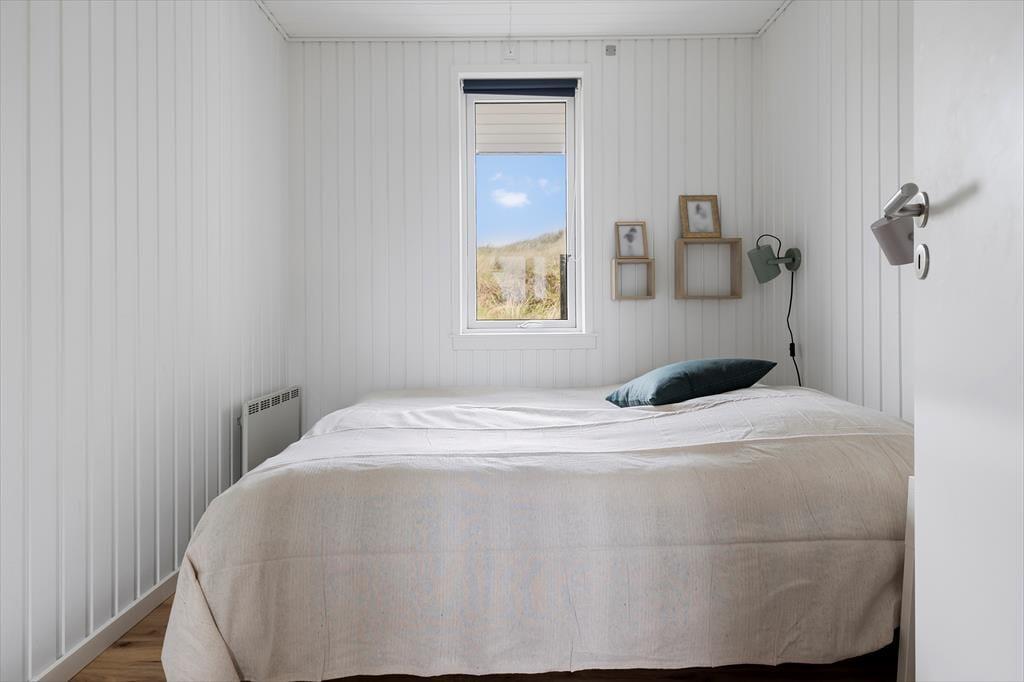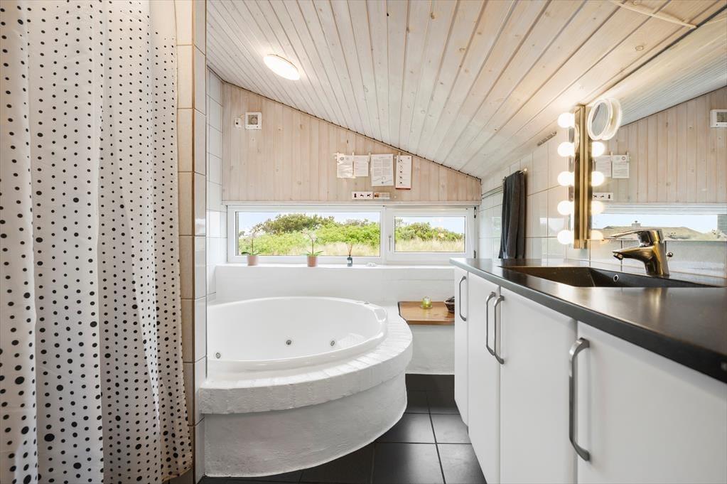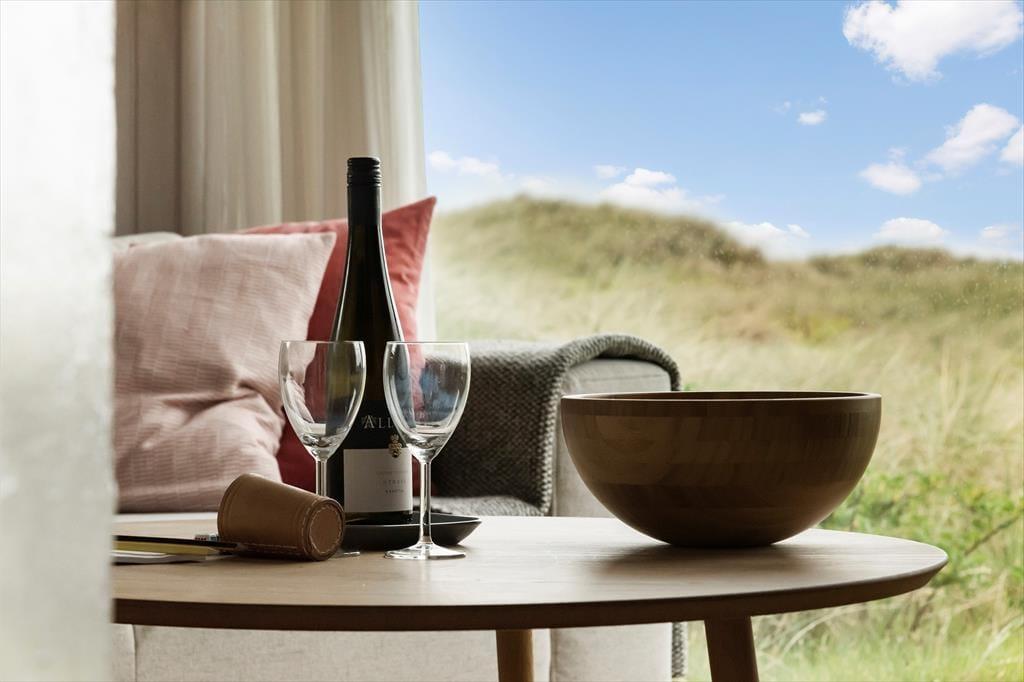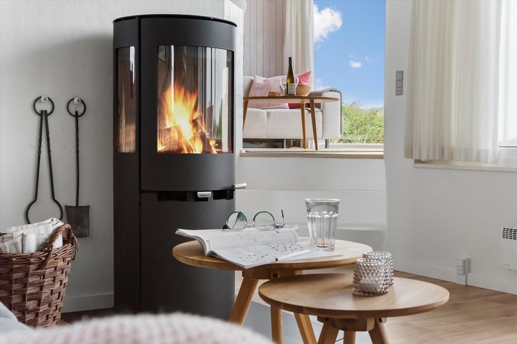 I kan uden problemer samles op til seks personer i huset og stadig have fornemmelsen af at have god plads omkring jer. Planløsningen byder på fire soveværelser, en hems og to badeværelser, og det største af badeværelserne er ikke bare indrettet med bruser, men også med spabad og sauna. Opholdsafdelingen er også dejligt rummelig: Her ligger køkken i åben forbindelse til en dejlig stue med spisebord, sofa og brændeovn, og en trappe fører op til endnu et stueareal med sofaarrangement. Det er her fra den hævede stue, at I kan beundre havudsigten. Fra de øvrige rum kan I se ud på marehalmsklædte klitter og hybenbuske, og det er bestemt også et skønt syn, der understøtter feriefornemmelsen.